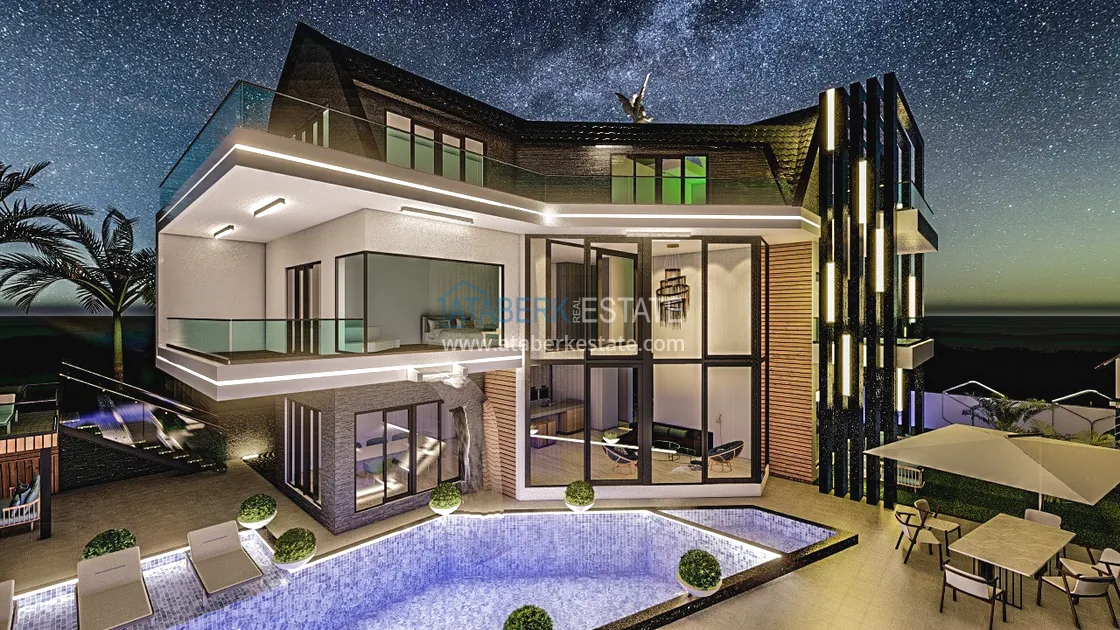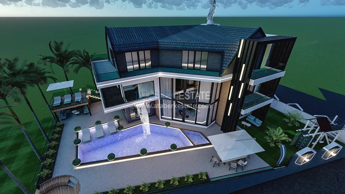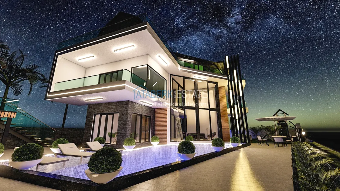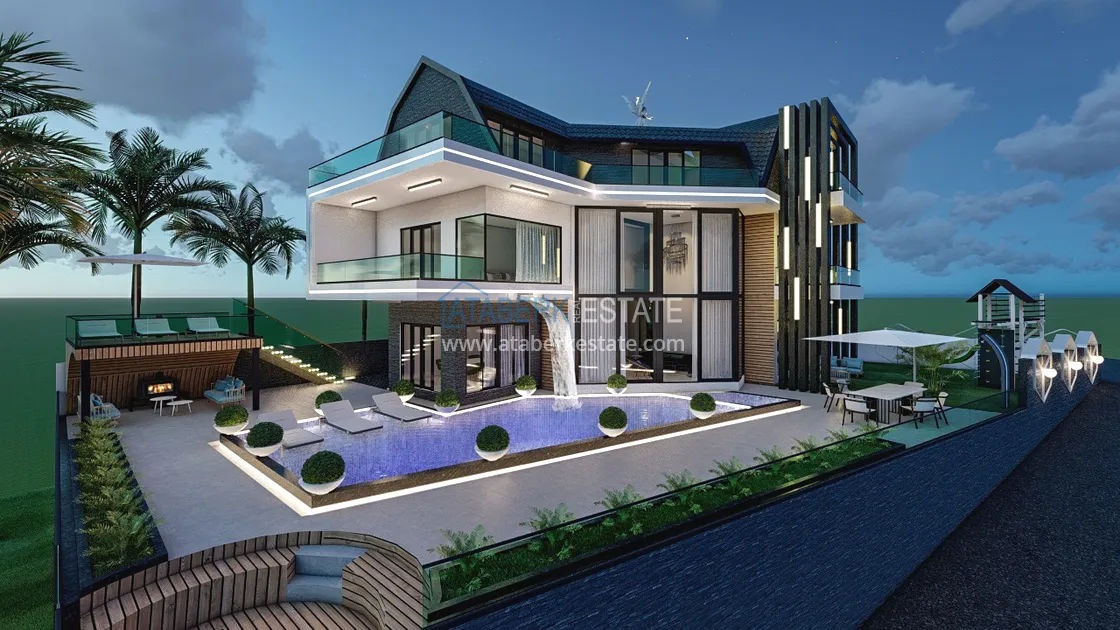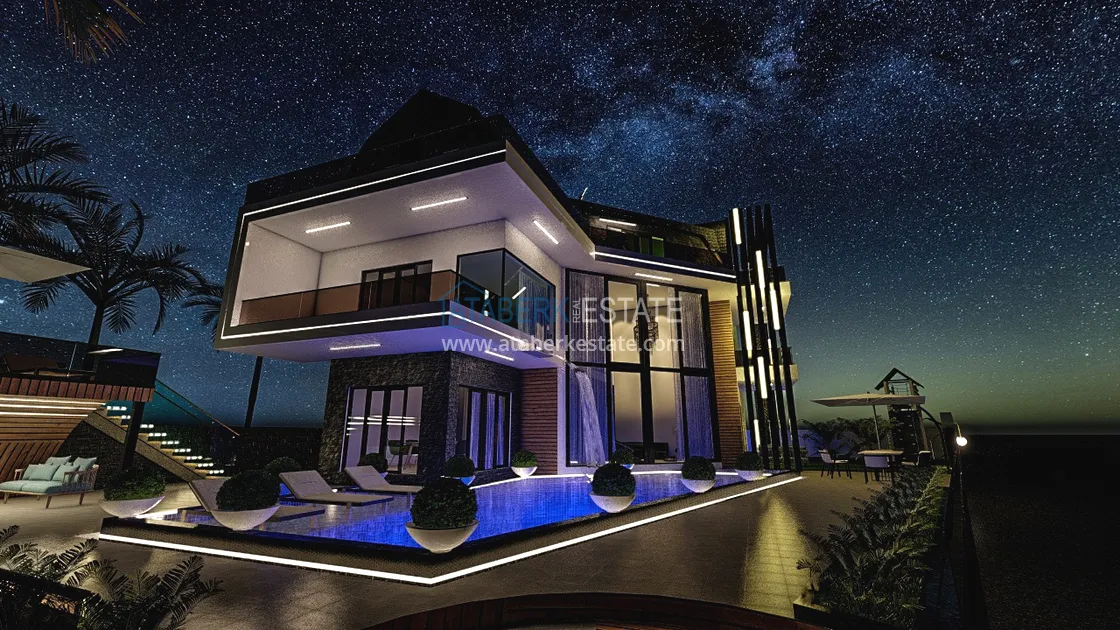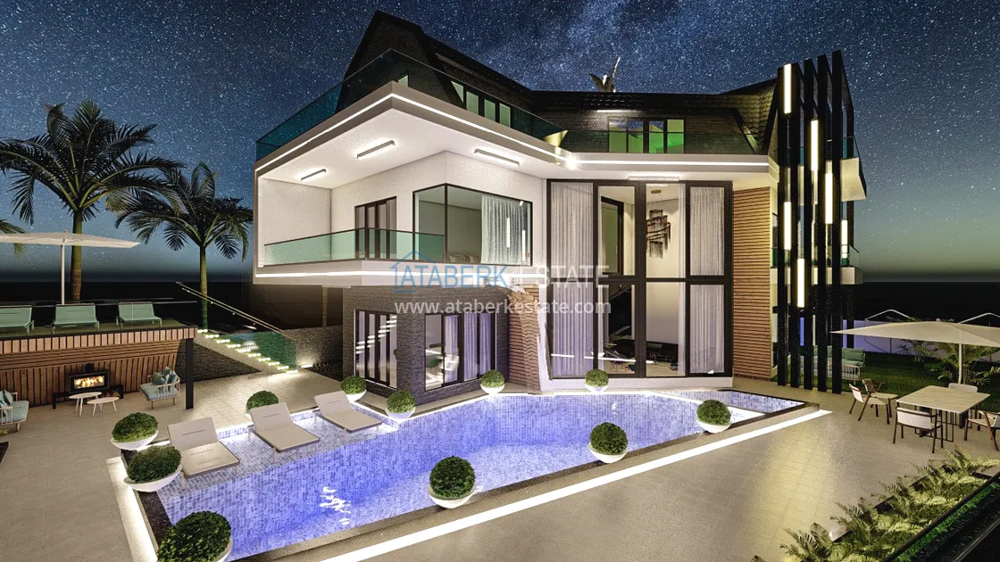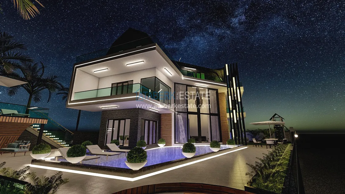 This is undoubtedly the best offer for people who dream of buying a cottage in a secluded and peaceful place with a picturesque view. An ultra-modern villa with an exclusive architectural style and design, using high quality materials and cutting-edge technology. The living area of the house will be 564 m2 - 2 residential floors, a garage for two cars and a basement of 112 m2. 5+1 layout - living room with fireplace, large open plan kitchen, five bedrooms, bathrooms on each floor and four balconies with magnificent, scenic views. For convenience, the layout provides fitness, sauna, hammam, jacuzzi, billiard room. The project also provides for a private house territory with all amenities for comfortable living and recreation - a swimming pool with a waterfall of 55 m2, a generator, a garden. The house will be located in a mountainous area, a short distance from the sea - 2 km.