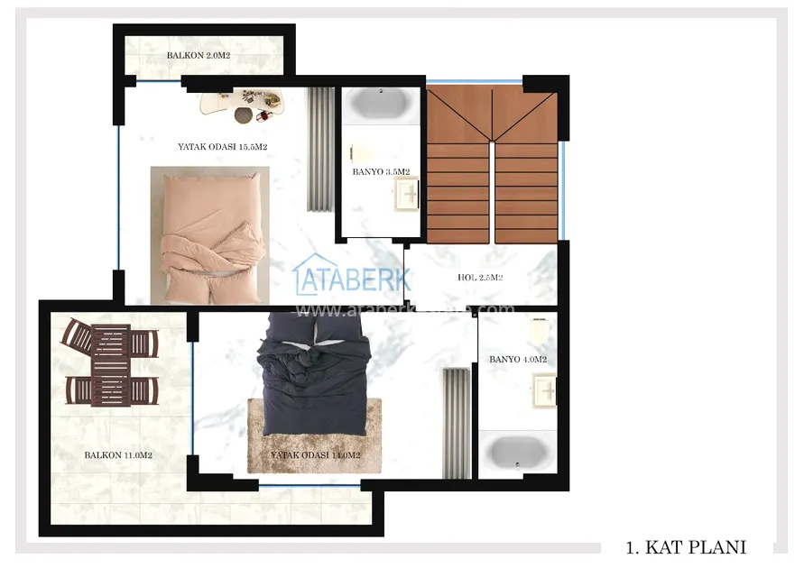 The project includes two two-story houses with a mansard roof. 3 + 1 and 4 + 1 layouts offer a high ceiling living room, American style kitchen, 3, 4 bedrooms, 3 bathrooms and 1 guest bathroom. There are also 2 balconies and an open rooftop terrace. The total area of each villa with an adjacent private area is 285 sq. m. Each villa has its own house territory, a private pool with a seating area and parking. The price of each villa includes: full finishing using high-class materials, built-in cabinet furniture in the kitchen area and fully equipped bathrooms.