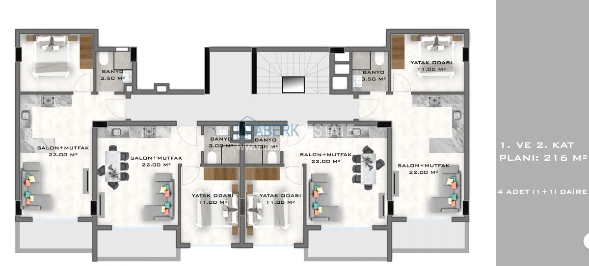 The investor offers flexible payment terms. With an advance payment of 50%, there will be an interest-free payment by installments for 6 months. There are 4 one-bedroom apartments for sale, planning 1+1, 55 m2, located on the 2nd and 3rd floors. This layout includes: a lounge, American open kitchen, one bedroom, f bathroom and a large balcony.