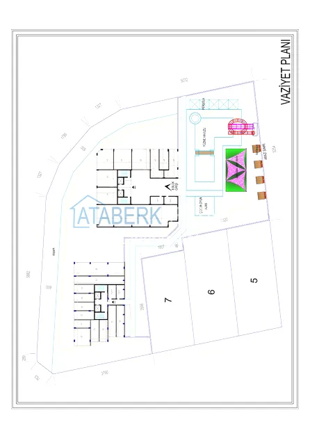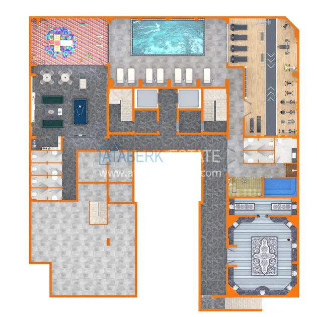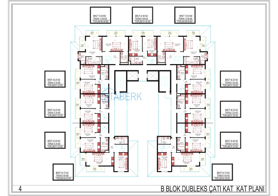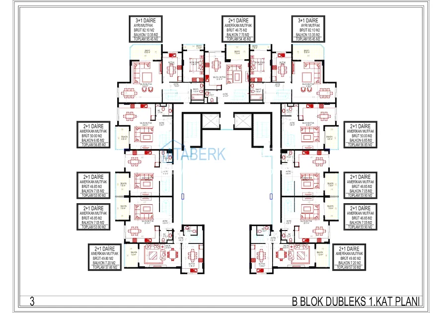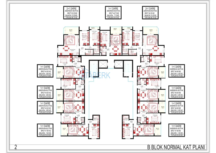 The residence consists of one 10-storey building and an adjacent area with luxurious infrastructure. 3 floors in the block are dedicated to commercial real estate — 11 offices and 9 retail spaces, the remaining 7 floors are residential. There are a total of 77 apartments in the complex. You can choose from the following layout options: 1+1 with an area of 53.45 — 55.05 m2, 2+1 with an area of 96.7 m2 and two-level penthouses 2+1 and 3+1 with an area of 105.10 to 182.35 m2.