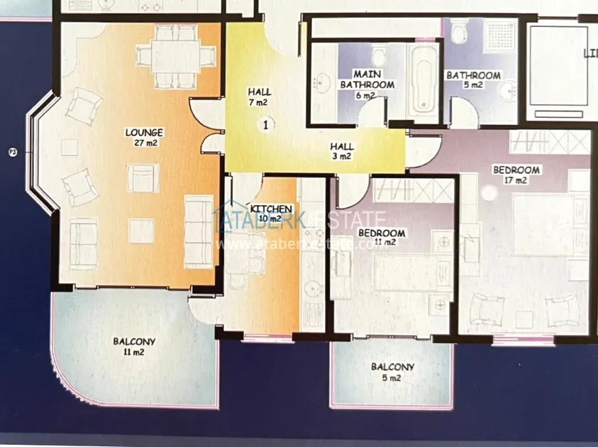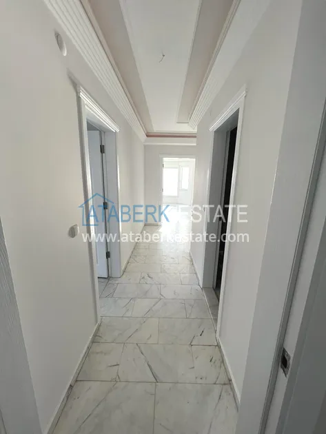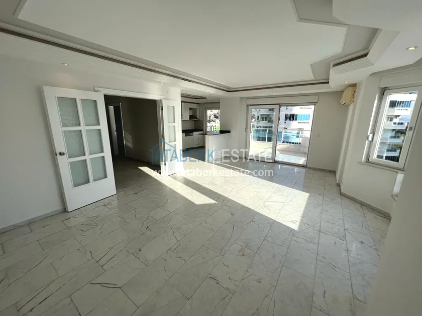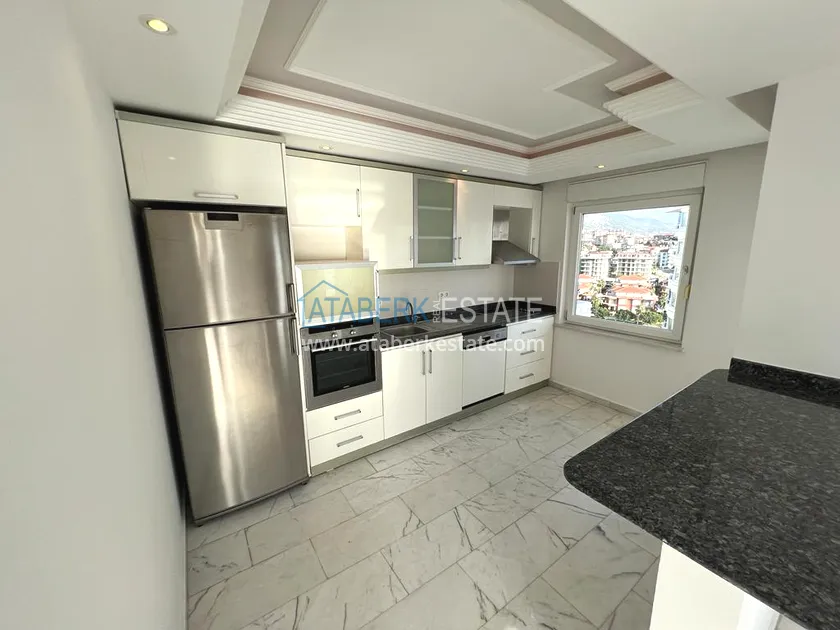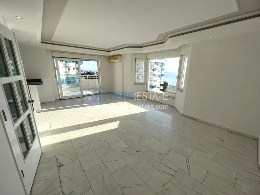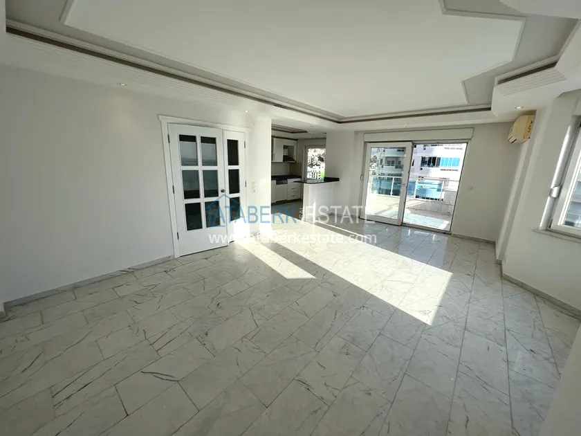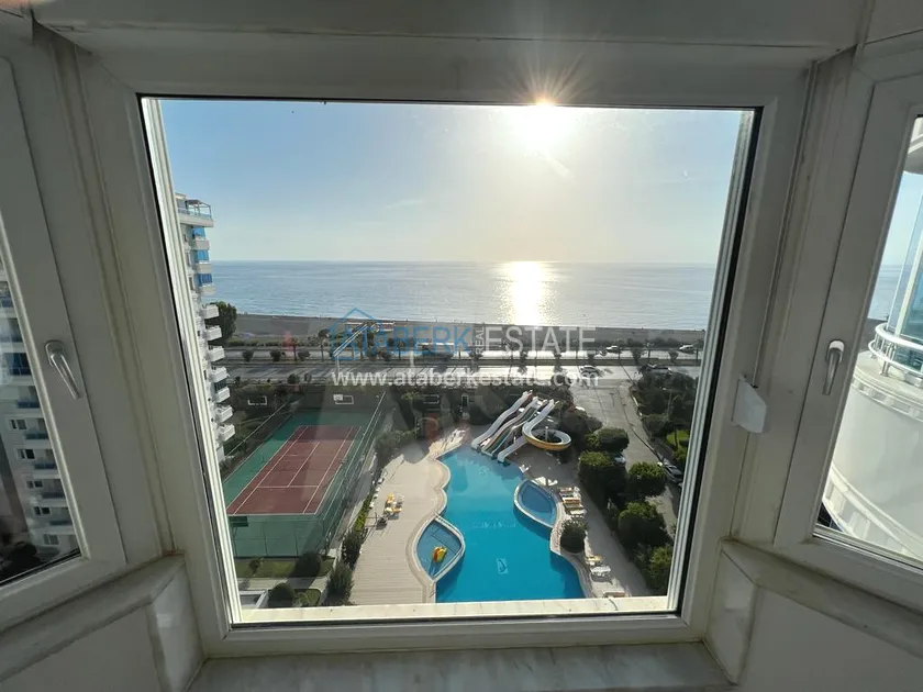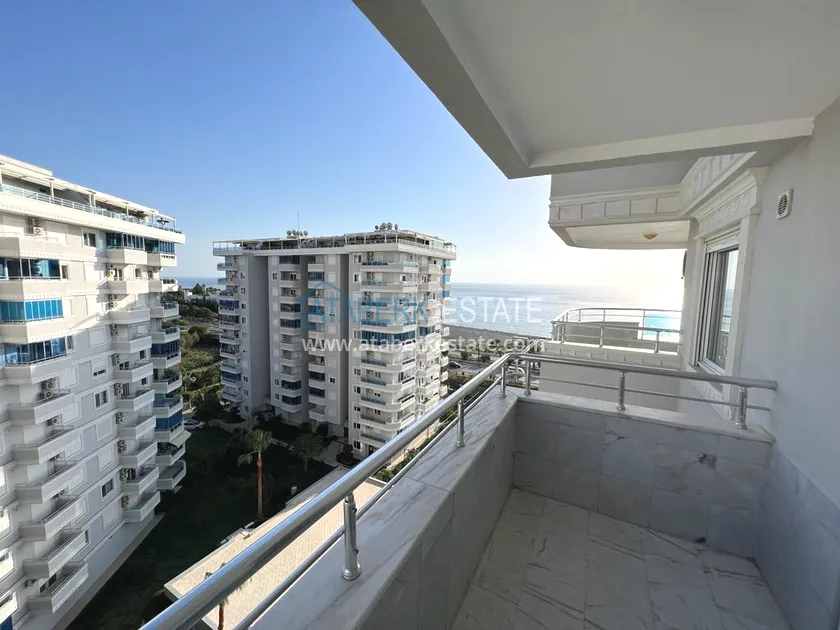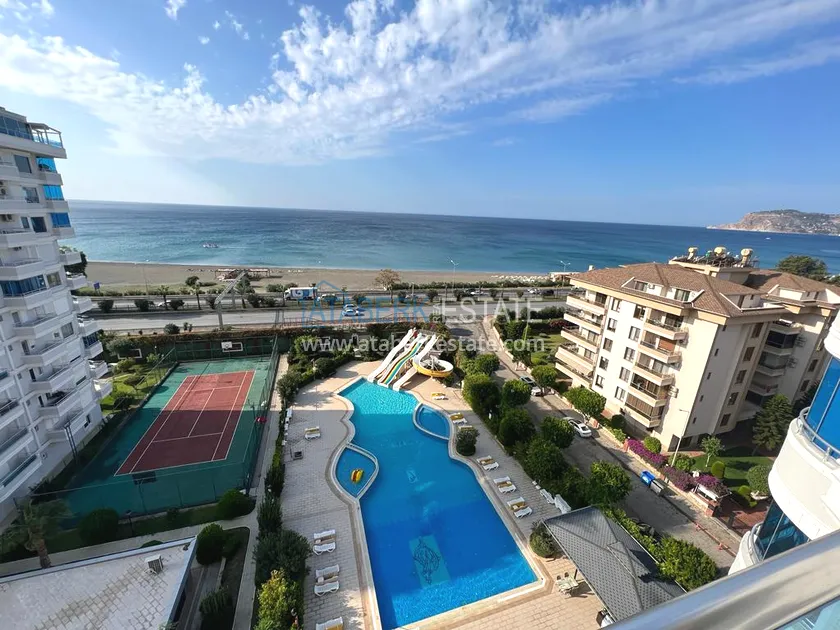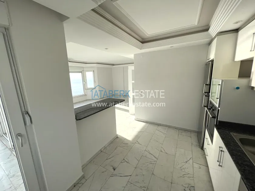 The 2+1 layout apartment is located on the 9th floor, the total area is 120 m2. This area contains: an entrance hall, a living room combined with an open plan kitchen, two bedrooms, two bathrooms and two balconies with open views of the sea, as well as the mountains and the territory of the complex - a swimming pool.
