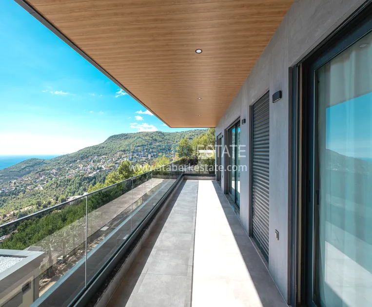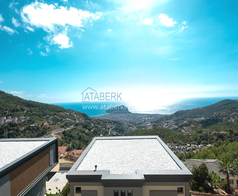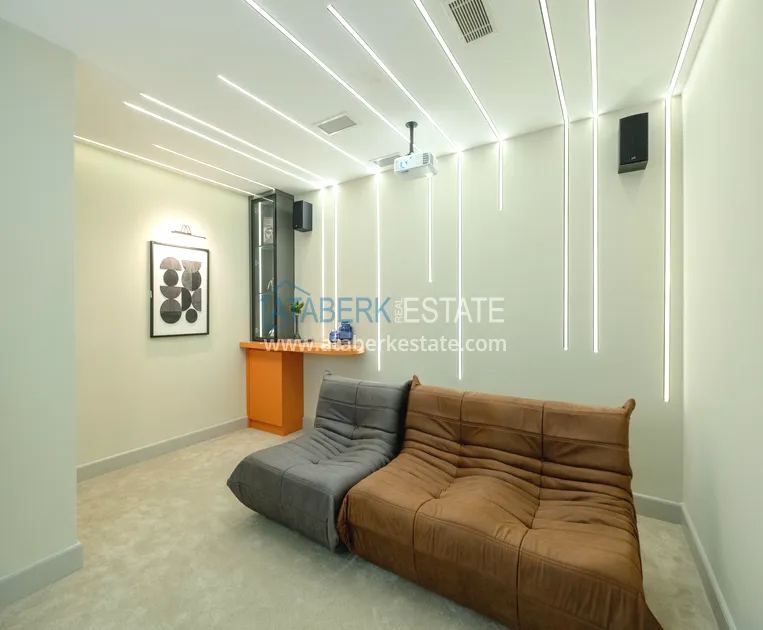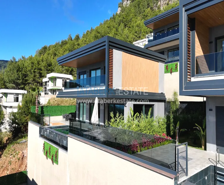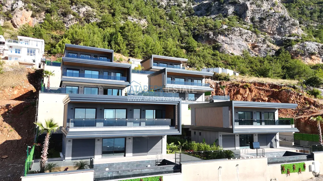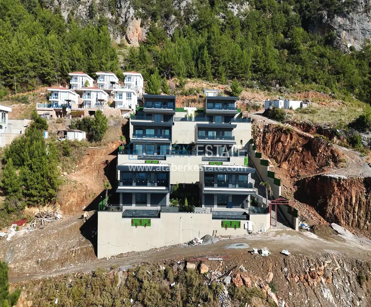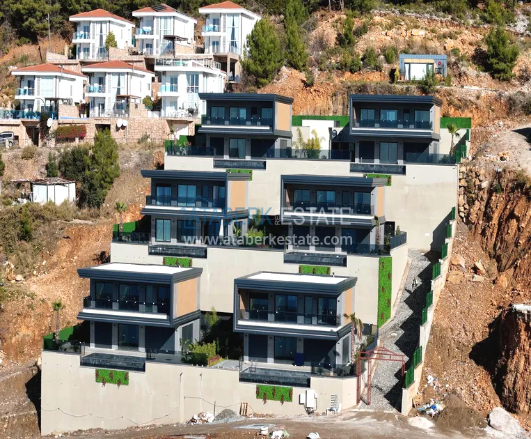 The project will be built on a plot of 2,480 m2. The total construction area is 5,115 m2. You can feel comfort and convenience in every square meter surrounded by pine forests intertwined with nature and frontal panoramic views of Alanya and the sea. The project includes 6 separate three-story villas with an area of 305 m2 and an 8+1 layout, including 4 bedrooms with bathrooms, a living room combined with a kitchen equipped with a modern fireplace, a cinema room, a gym, a sauna, dressing rooms, a warehouse and a technical room. Each villa has its own area from 216 to 292 m2 with its own panoramic infinity pool and a closed garage for 2 cars. The villas will be equipped with a smart home system and a floor heating system in all rooms. An electric generator, a water tank and lightning rods are available.