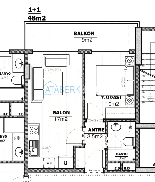 1+1 apartment, 48 m², fourth floor (actually higher — the elevator starts at level -1). The apartment has a living room with an American-style kitchen, a separate bedroom, a bathroom and a balcony. Sophisticated zoning and modern interior create a pleasant feeling of spaciousness. The apartment is fully furnished and equipped with household appliances.