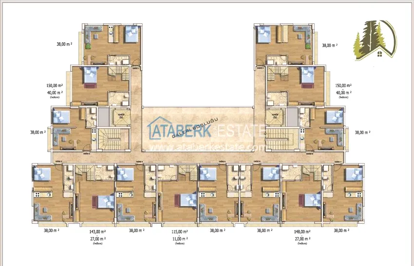 The complex consists of one eight-storey block, on each floor there are studio apartments with an area of 38 m2, and on the top floor there are apartment-duplexes, 2 + 1 layout and an area from 170 to 190 m2.