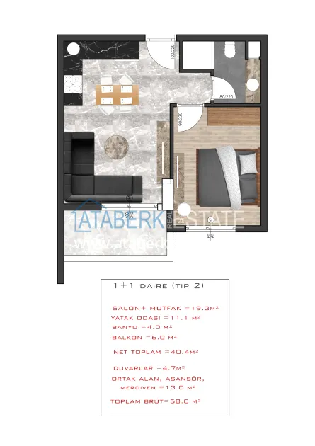 For sale are one-bedroom apartments with a layout of 1+1 with an area of 58 m2, floors 2, 3 and 4. The price includes full finishing, equipped bathrooms and built-in kitchen furniture.