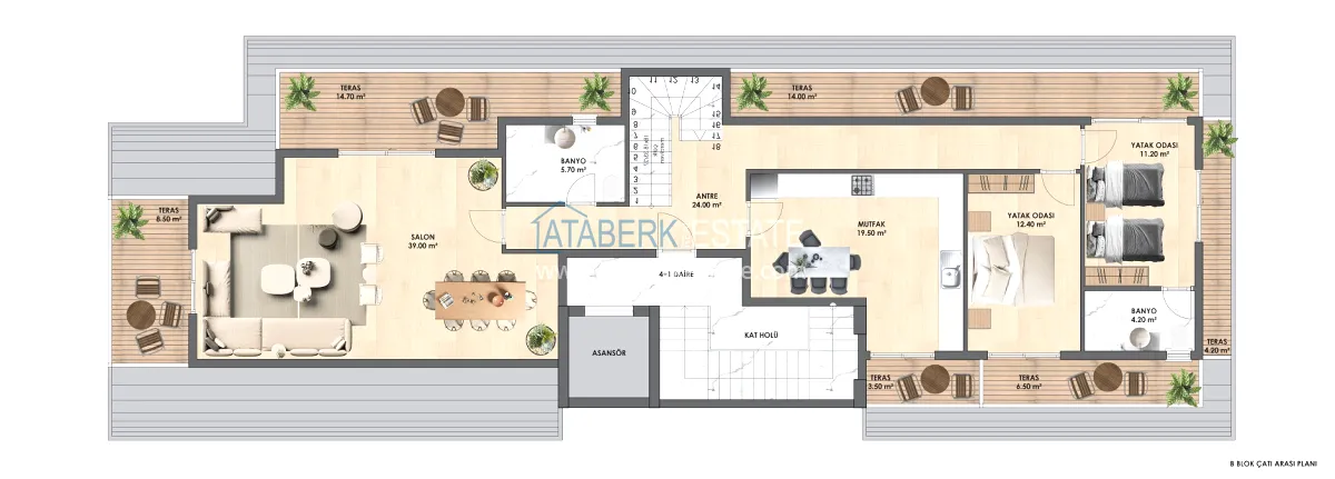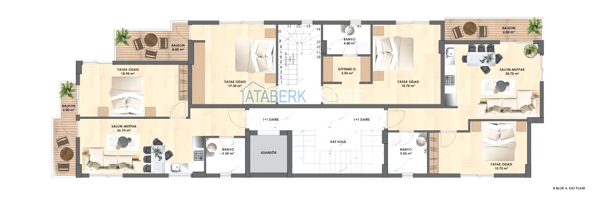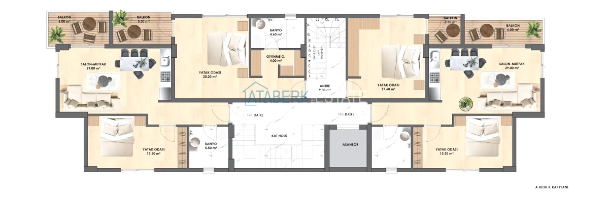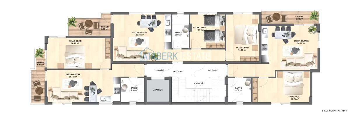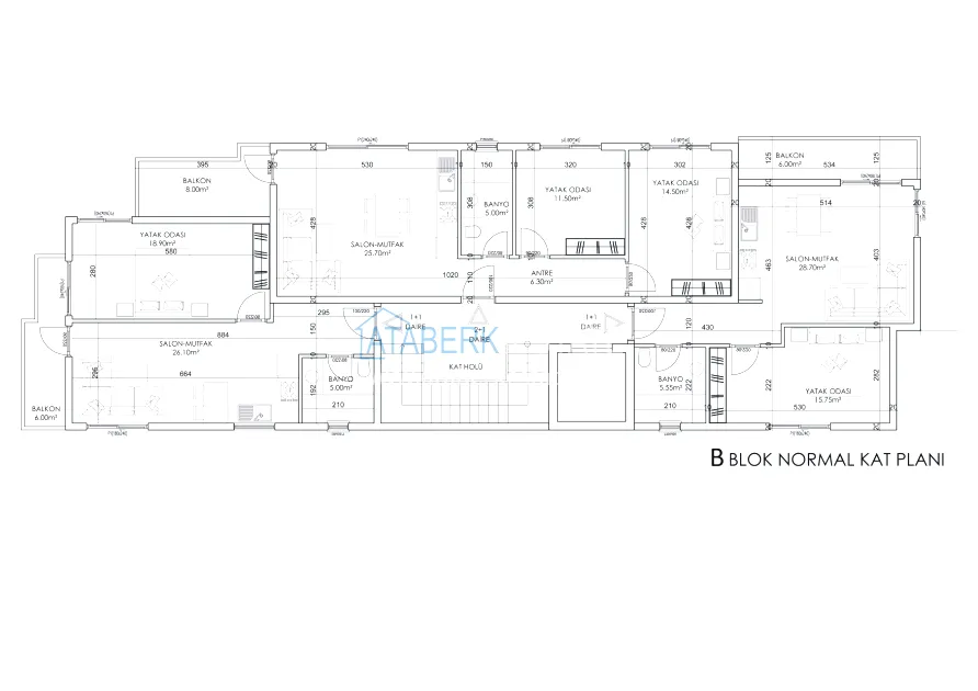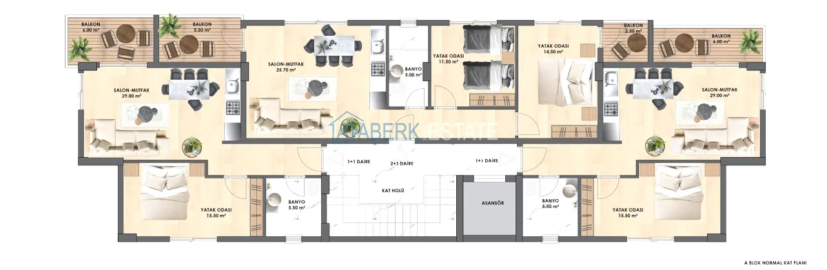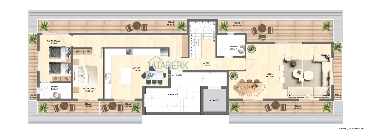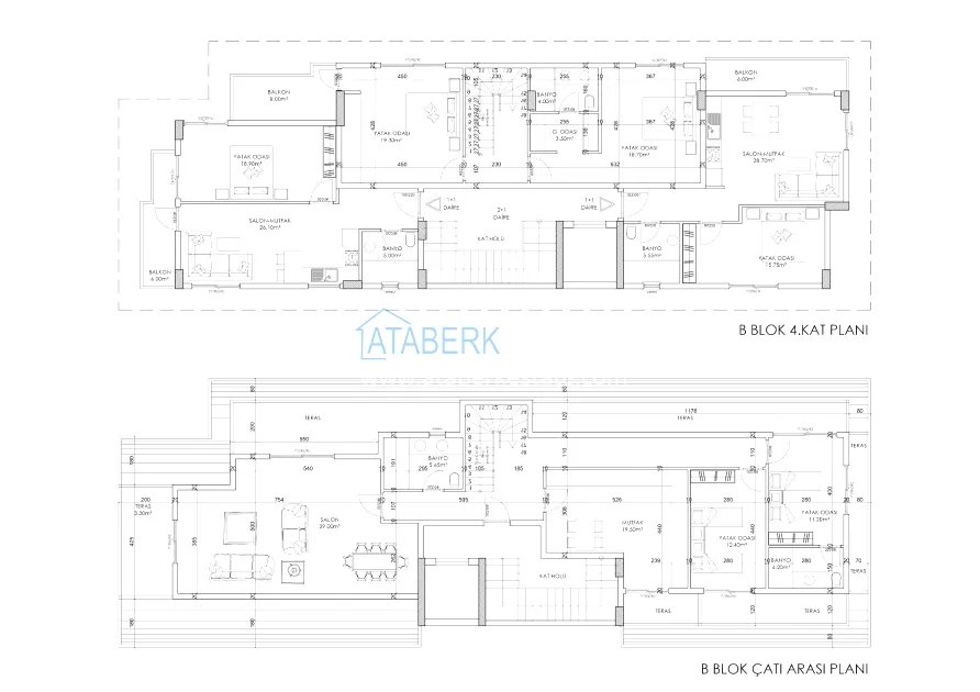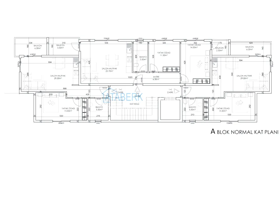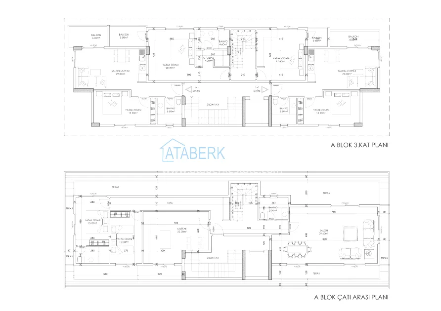 The project provides for two blocks with 27 apartments. Layout options: 1+1 apartments — gross 62 m2/net 50 m, 2+1 — gross 85 m2/net 65 m2, spacious 4+1 duplexes — gross 350 m2/net 275 m2.