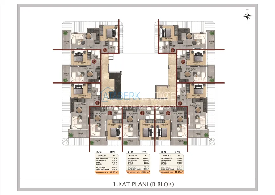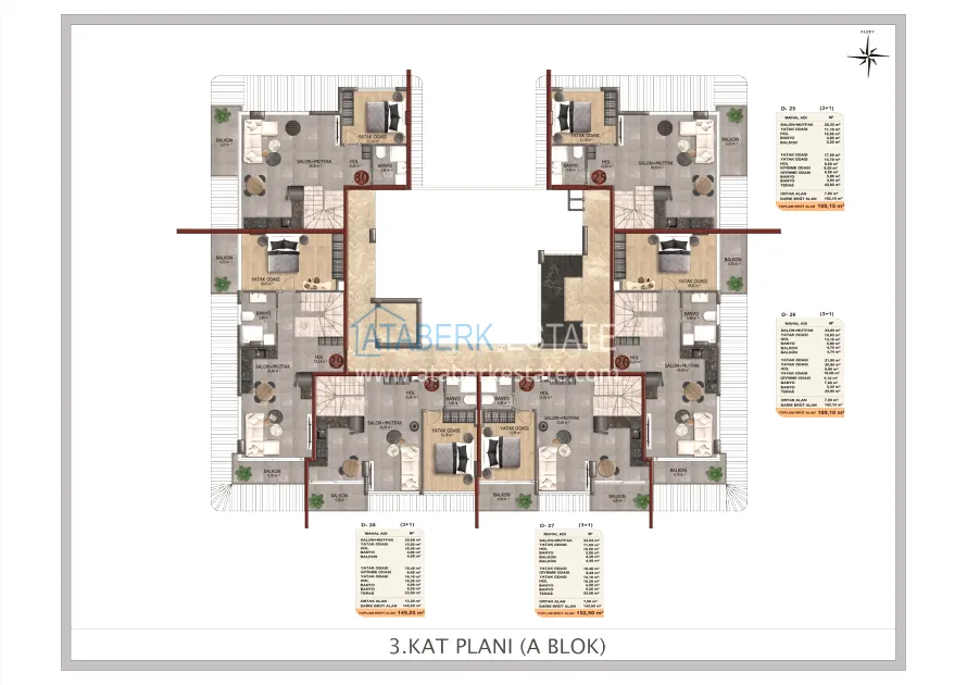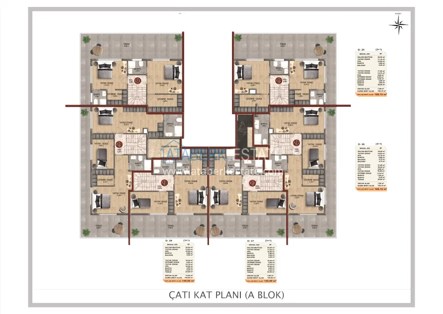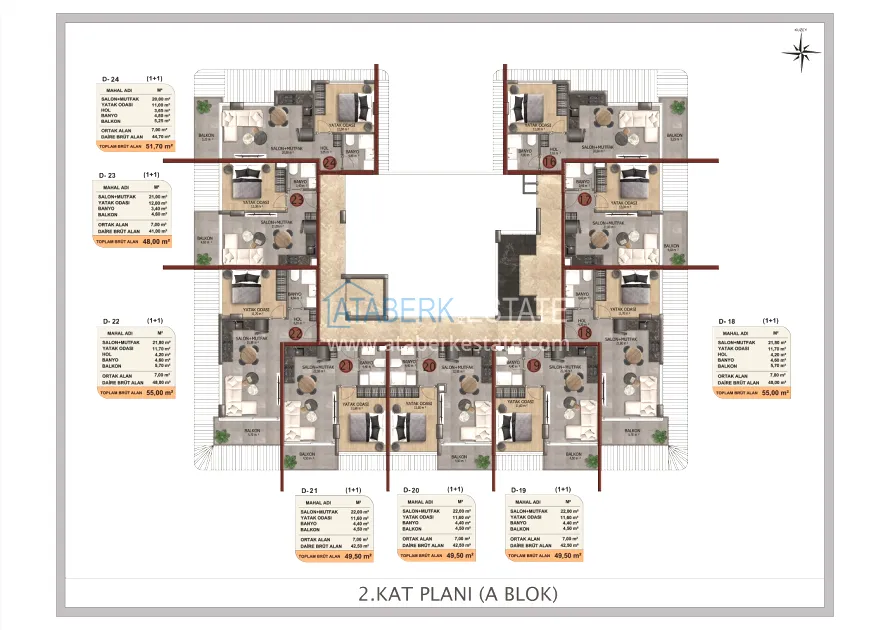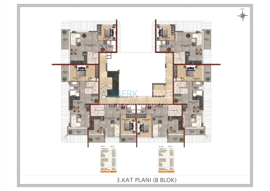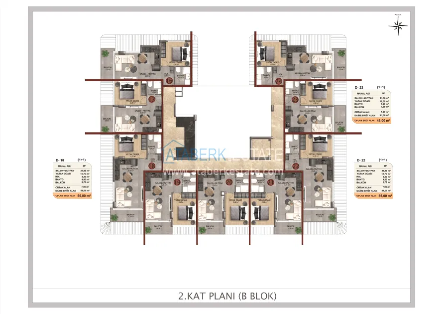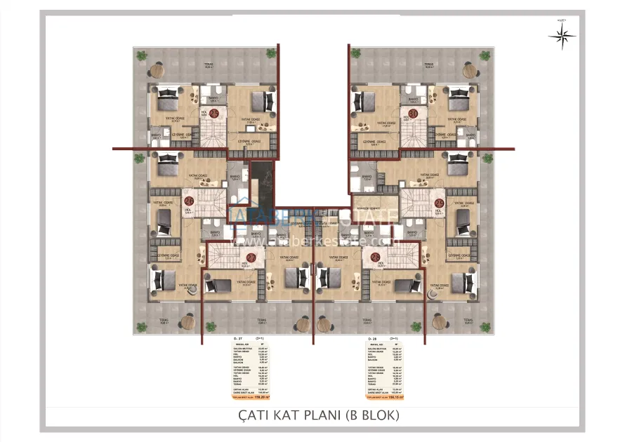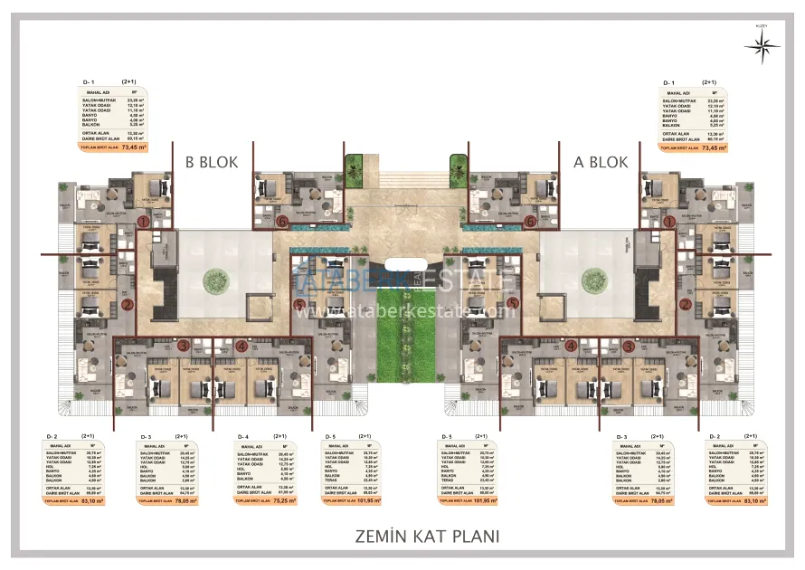 The complex has two residential blocks and a total of 60 apartments, including 1+1 apartments and spacious 3+1 penthouses, ranging in size from 48 to 170 m². Each apartment has a high-quality finishing, built-in kitchen furniture and fully equipped bathrooms.