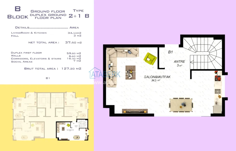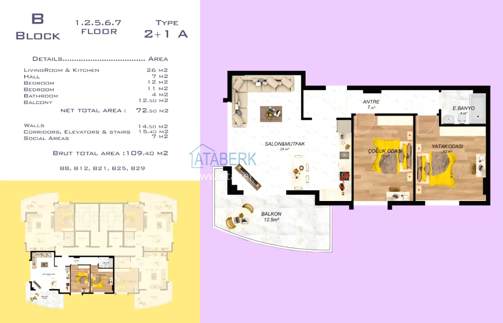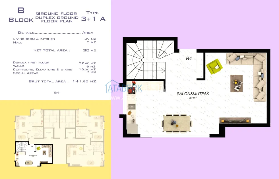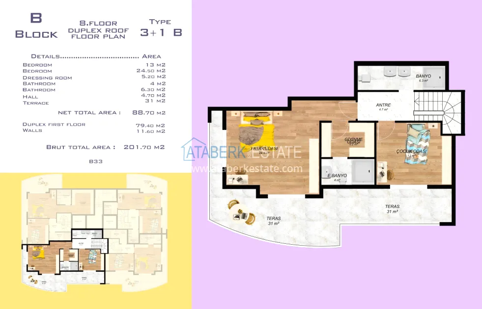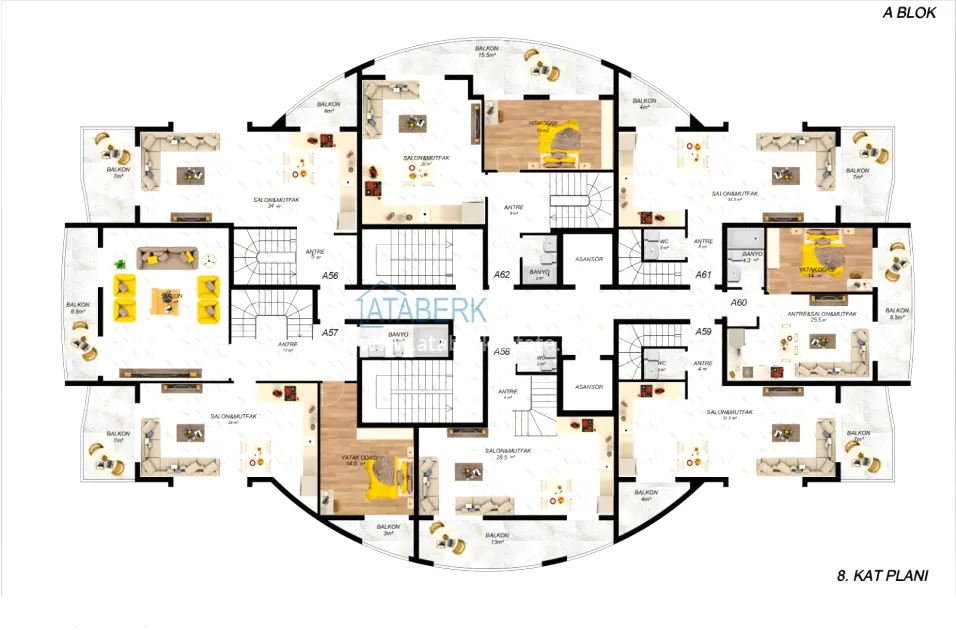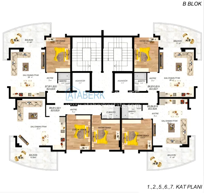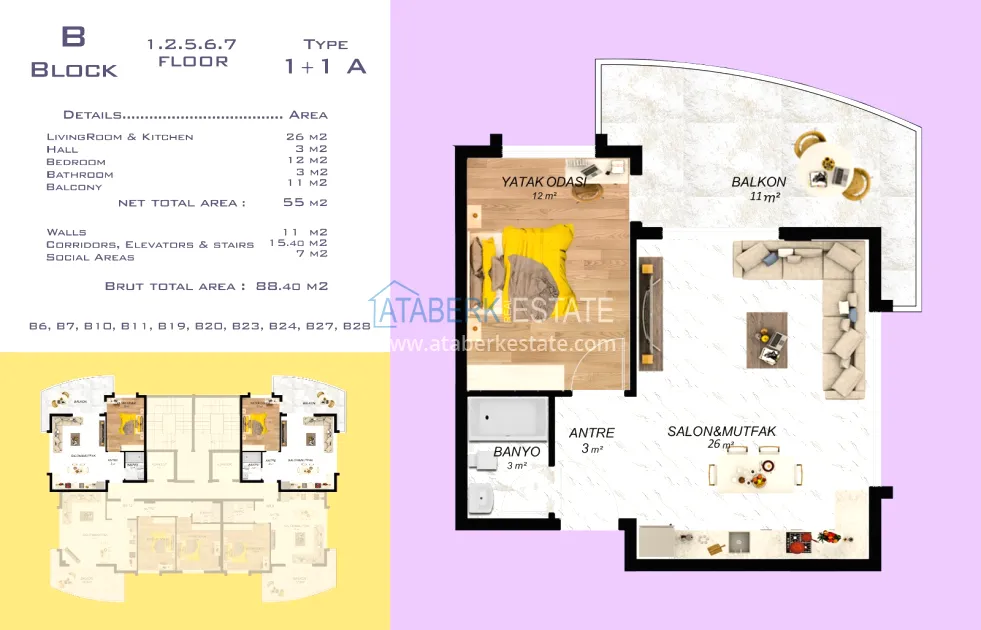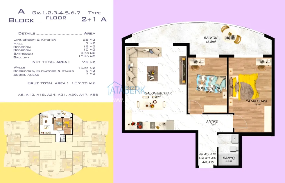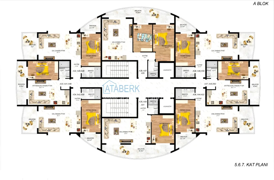 You can choose from the following layouts: 1+1 with an area of 52-64 m2, 2+1 with an area of 87 m2, garden duplexes 2+1 and 3+1 with an area of 92 and 150 m2, as well as duplex penthouses 2+1 and 3+1 with an area of 110 -170 m2. The apartments will be handed over with a full fine finish, high-quality plumbing and built-in kitchen furniture.