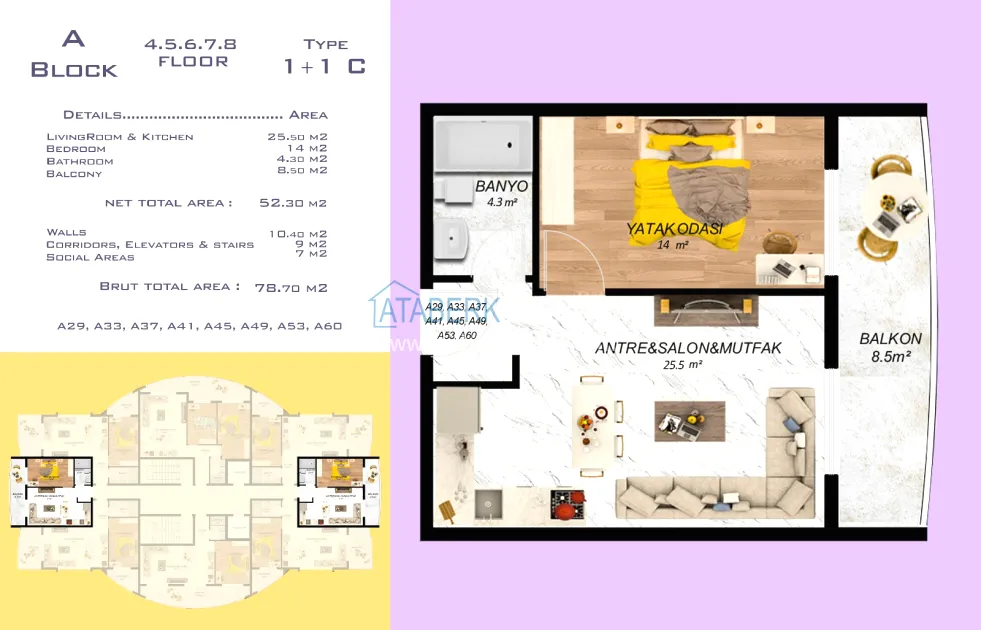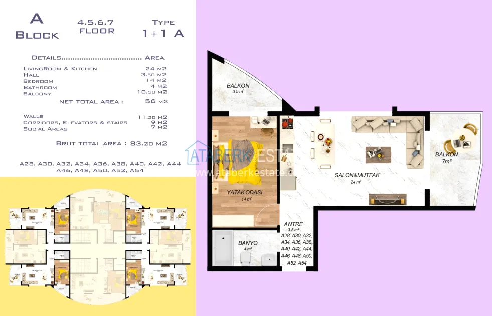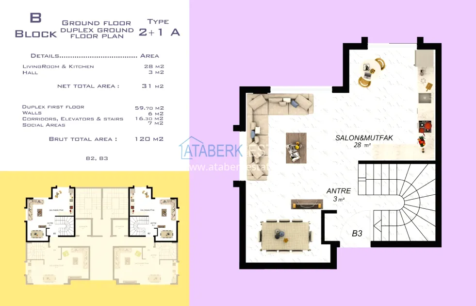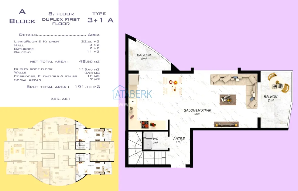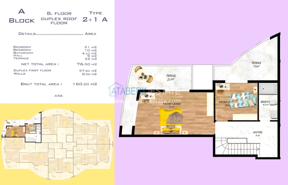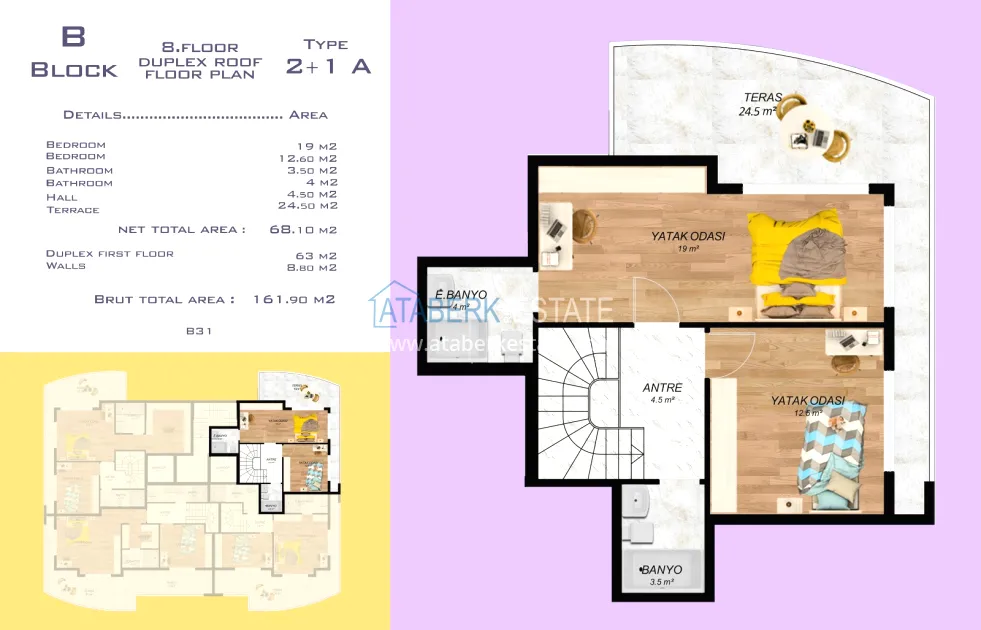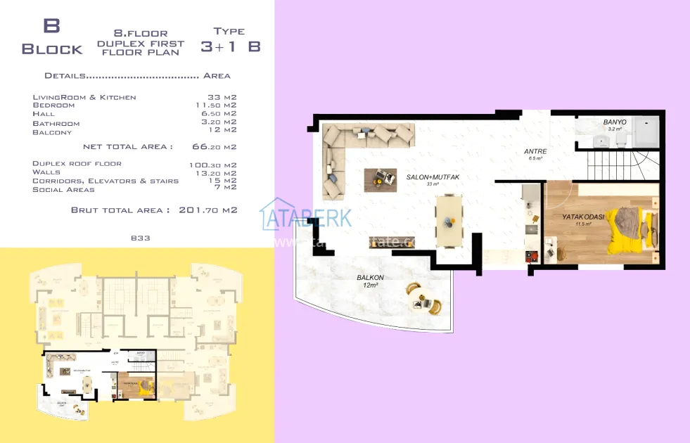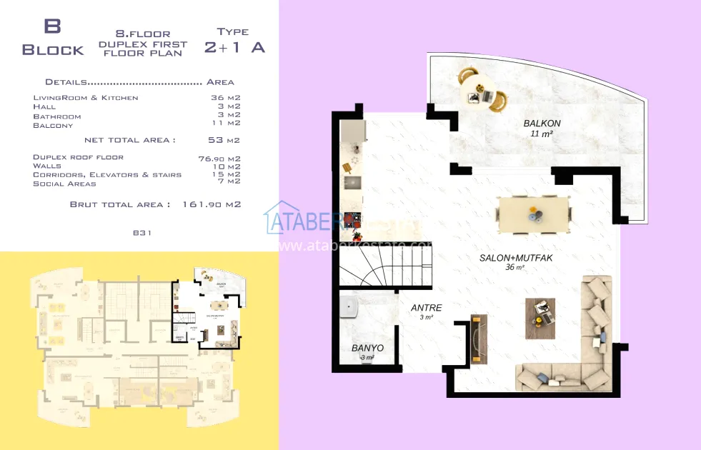 You can choose from the following layouts: 1+1 with an area of 52-64 m2, 2+1 with an area of 87 m2, garden duplexes 2+1 and 3+1 with an area of 92 and 150 m2, as well as duplex penthouses 2+1 and 3+1 with an area of 110 -170 m2. The apartments will be handed over with a full fine finish, high-quality plumbing and built-in kitchen furniture.