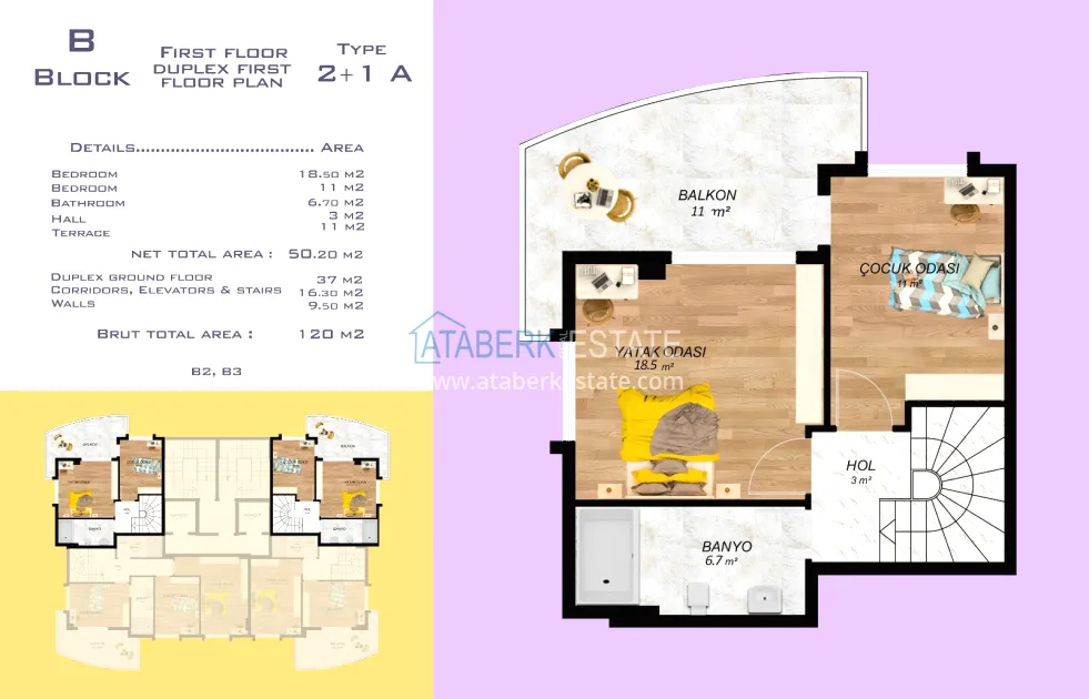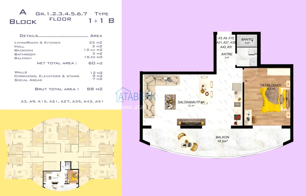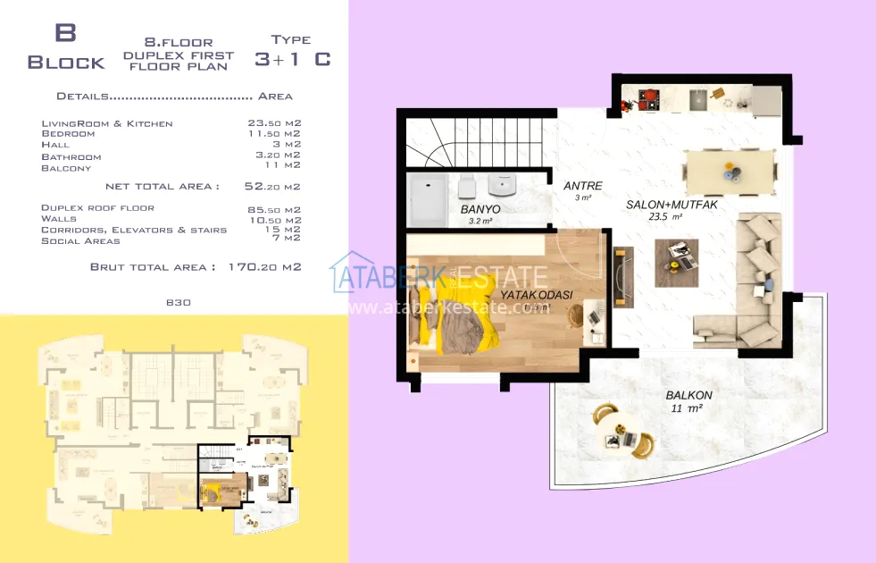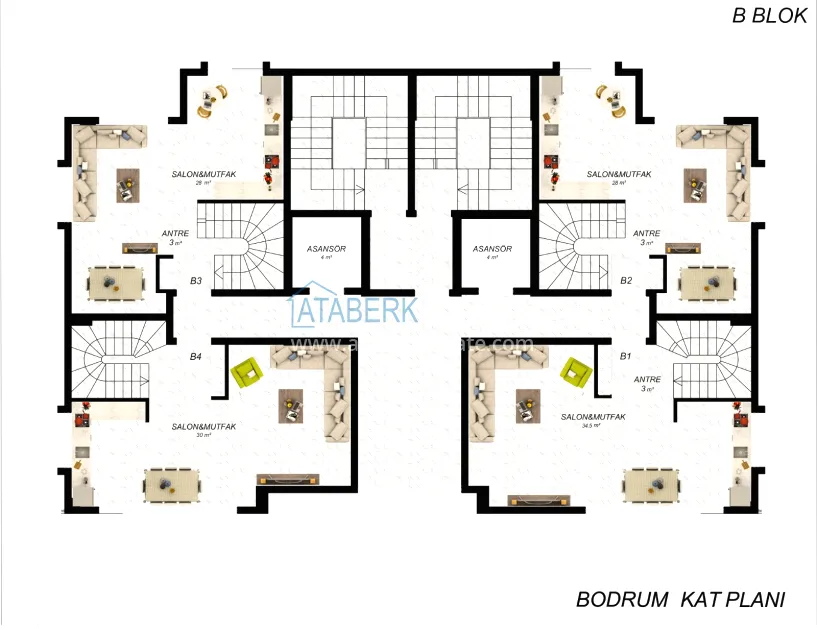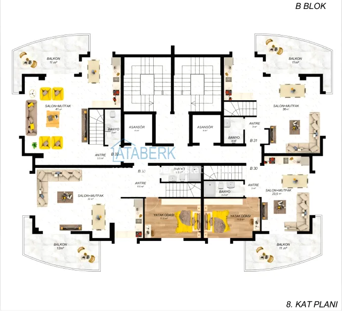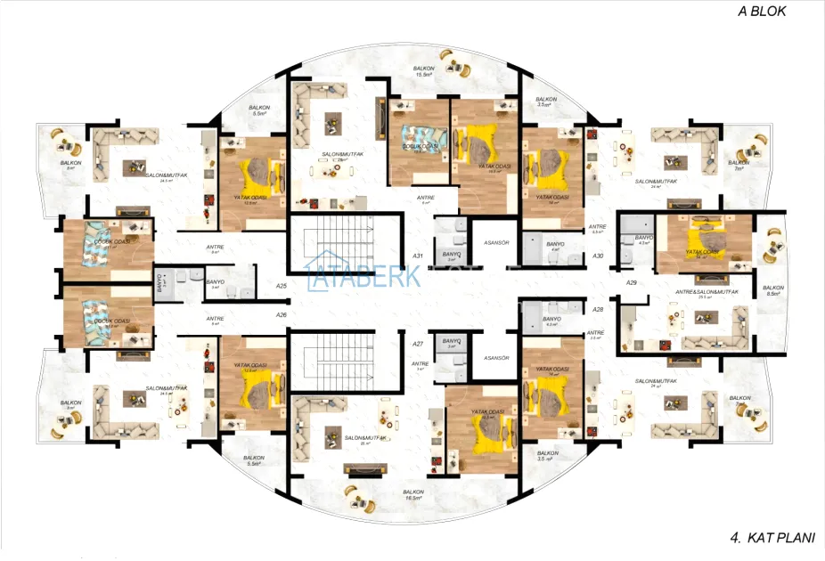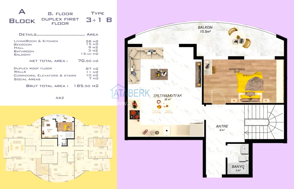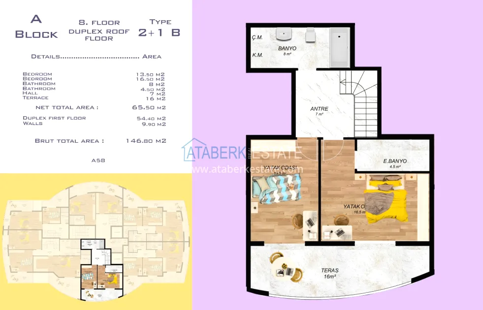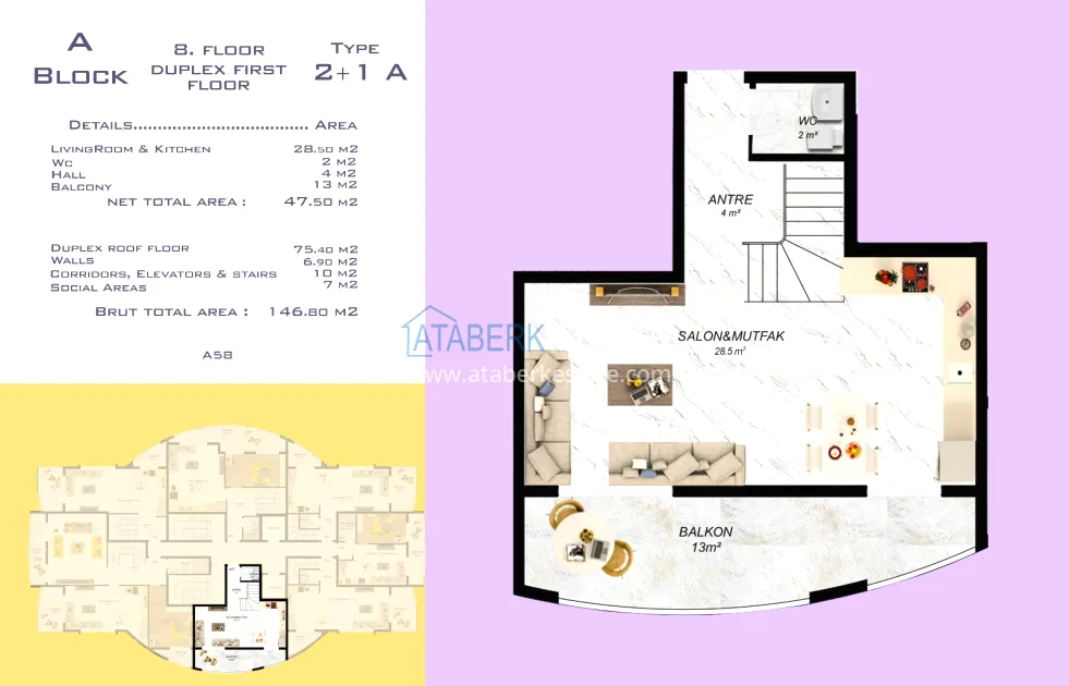 You can choose from the following layouts: 1+1 with an area of 52-64 m2, 2+1 with an area of 87 m2, garden duplexes 2+1 and 3+1 with an area of 92 and 150 m2, as well as duplex penthouses 2+1 and 3+1 with an area of 110 -170 m2. The apartments will be handed over with a full fine finish, high-quality plumbing and built-in kitchen furniture.