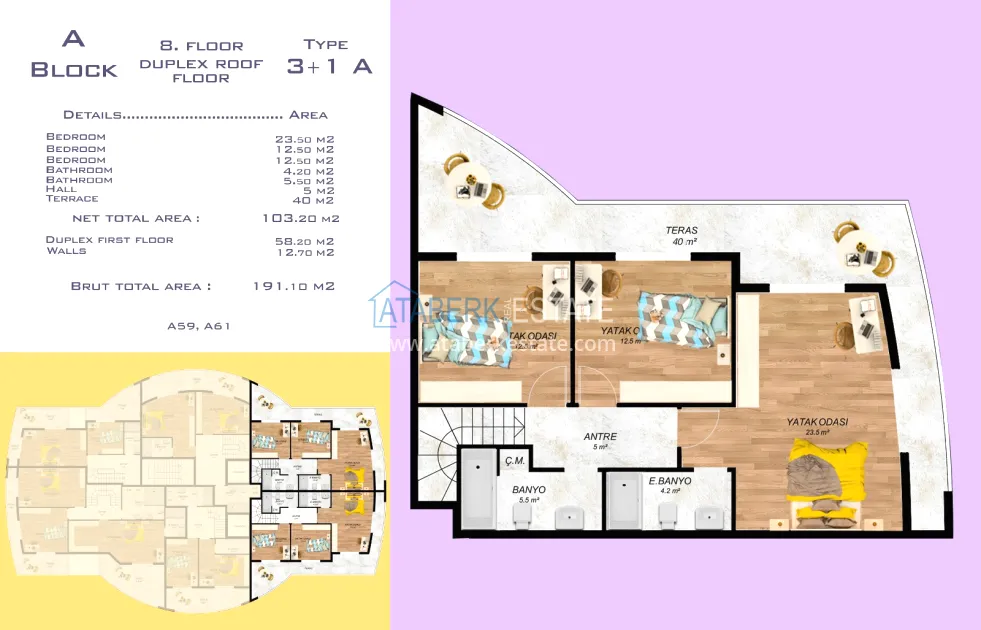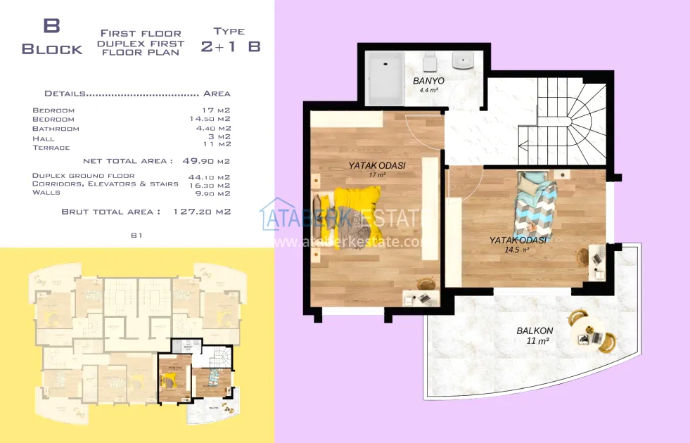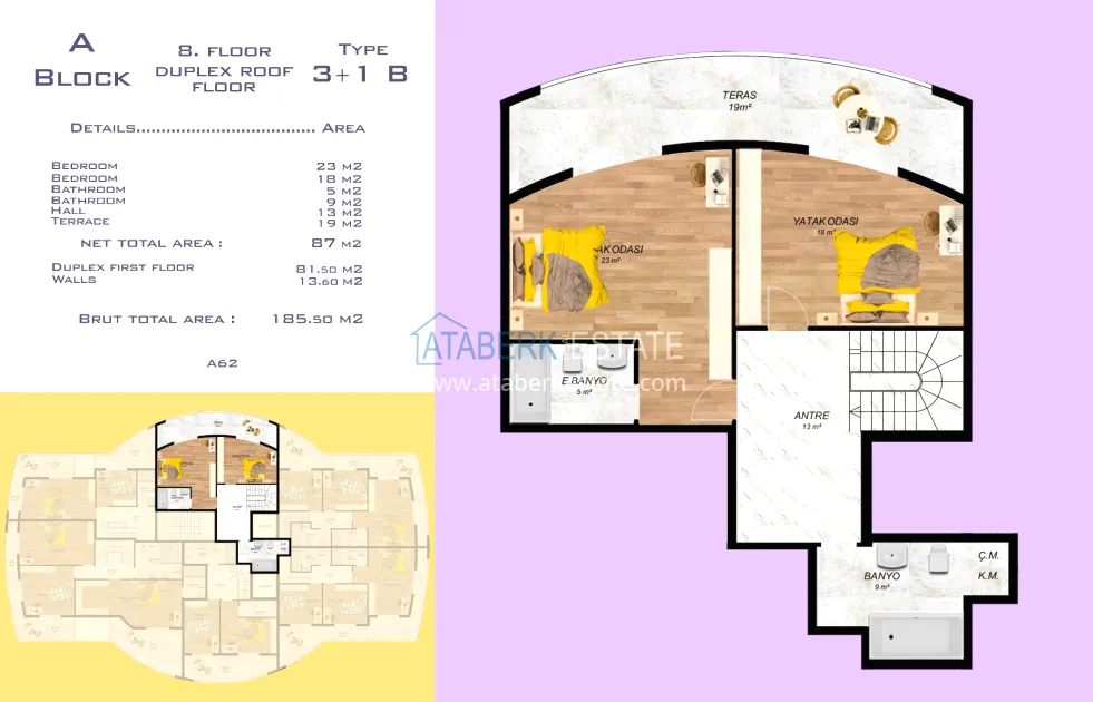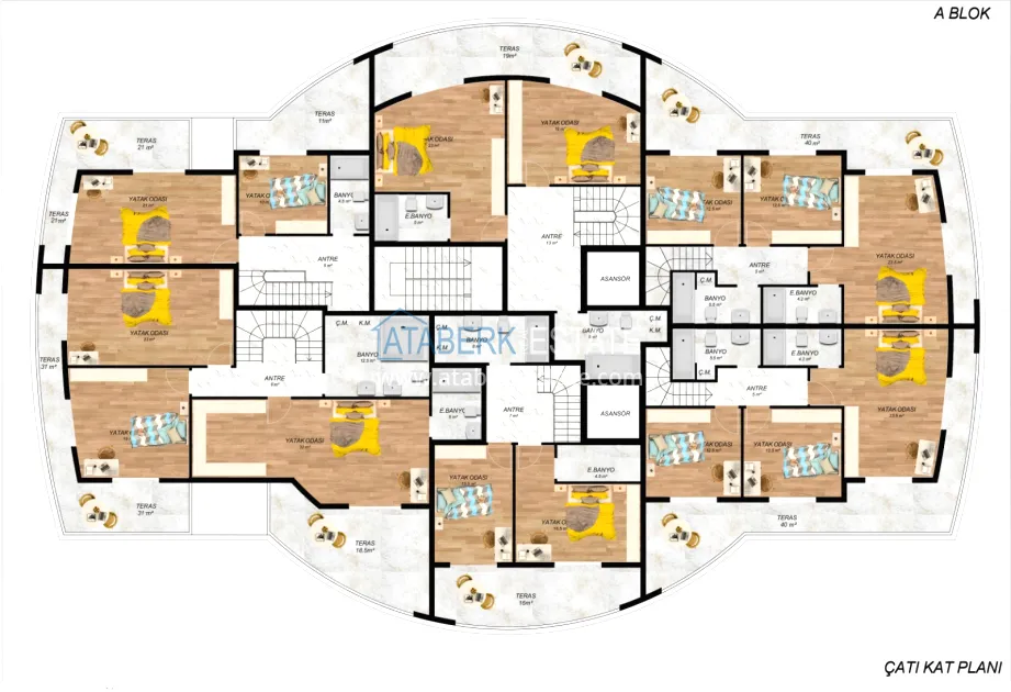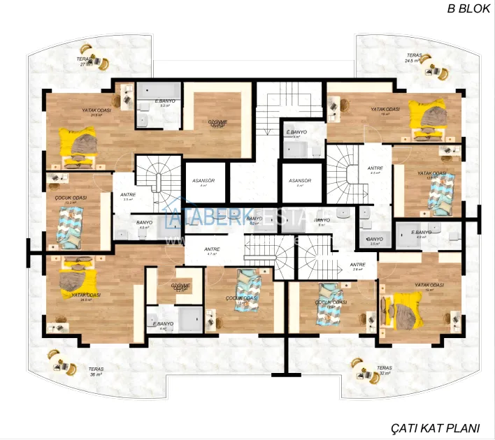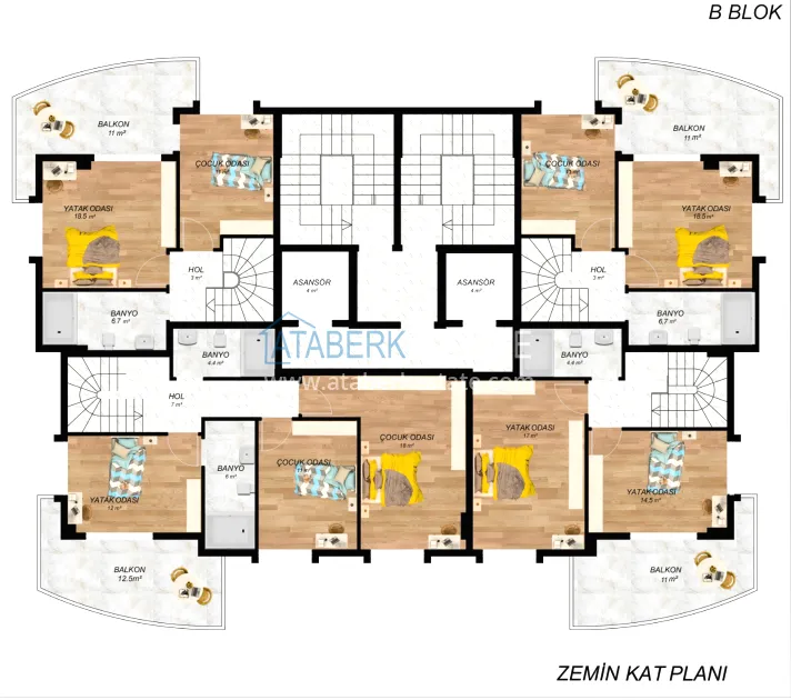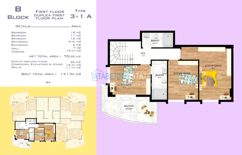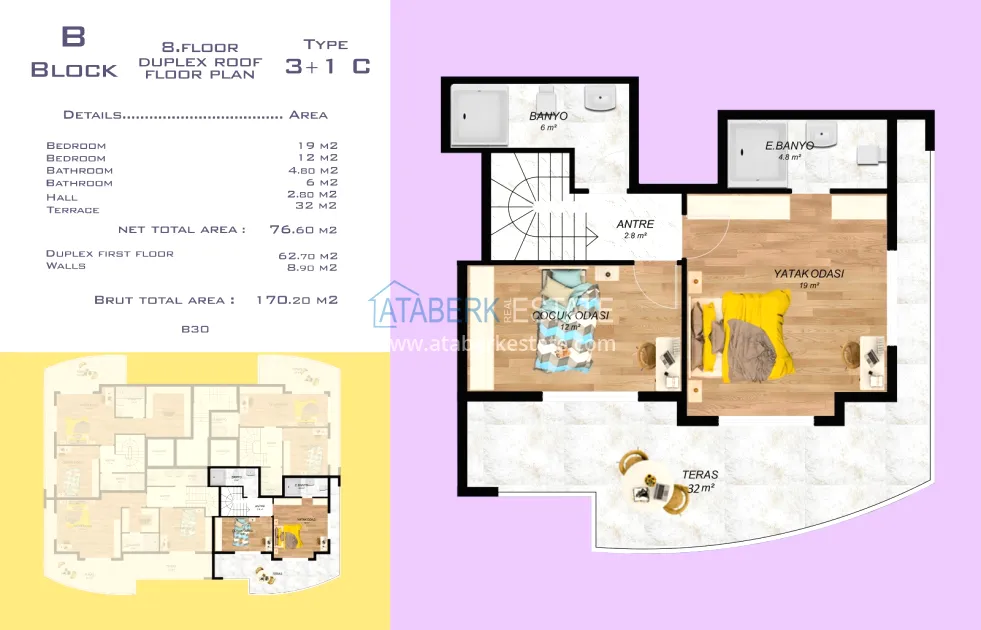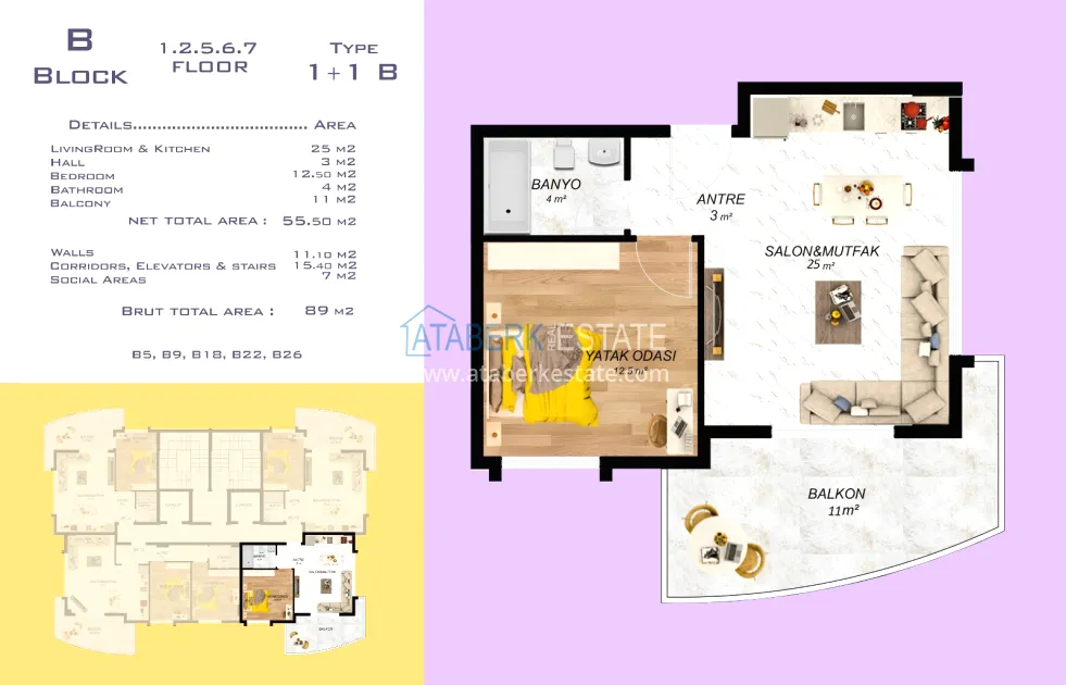 You can choose from the following layouts: 1+1 with an area of 52-64 m2, 2+1 with an area of 87 m2, garden duplexes 2+1 and 3+1 with an area of 92 and 150 m2, as well as duplex penthouses 2+1 and 3+1 with an area of 110 -170 m2. The apartments will be handed over with a full fine finish, high-quality plumbing and built-in kitchen furniture.
