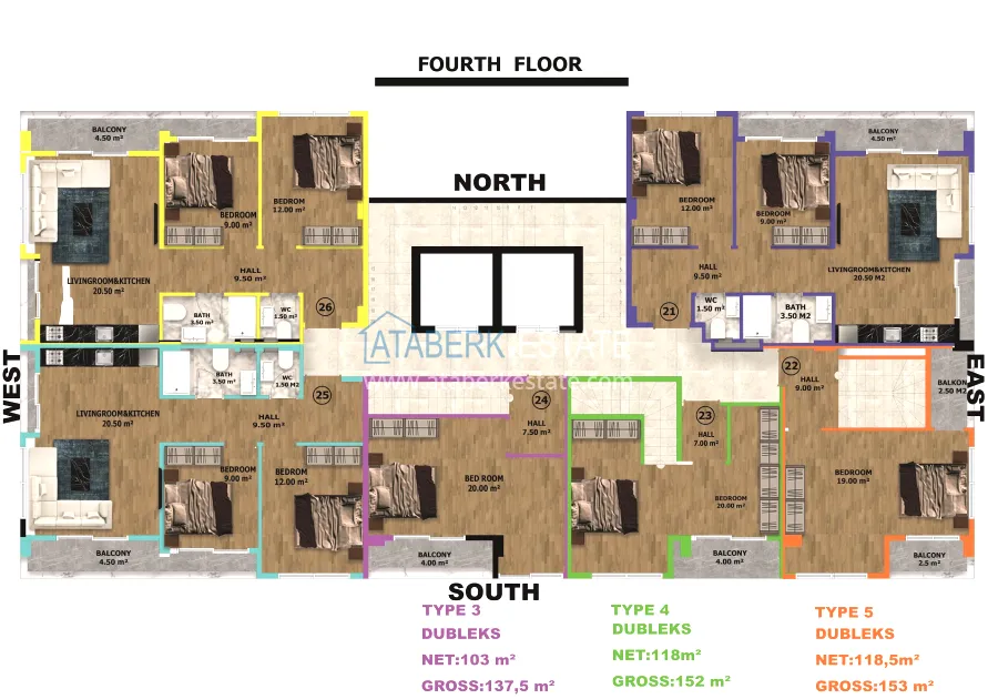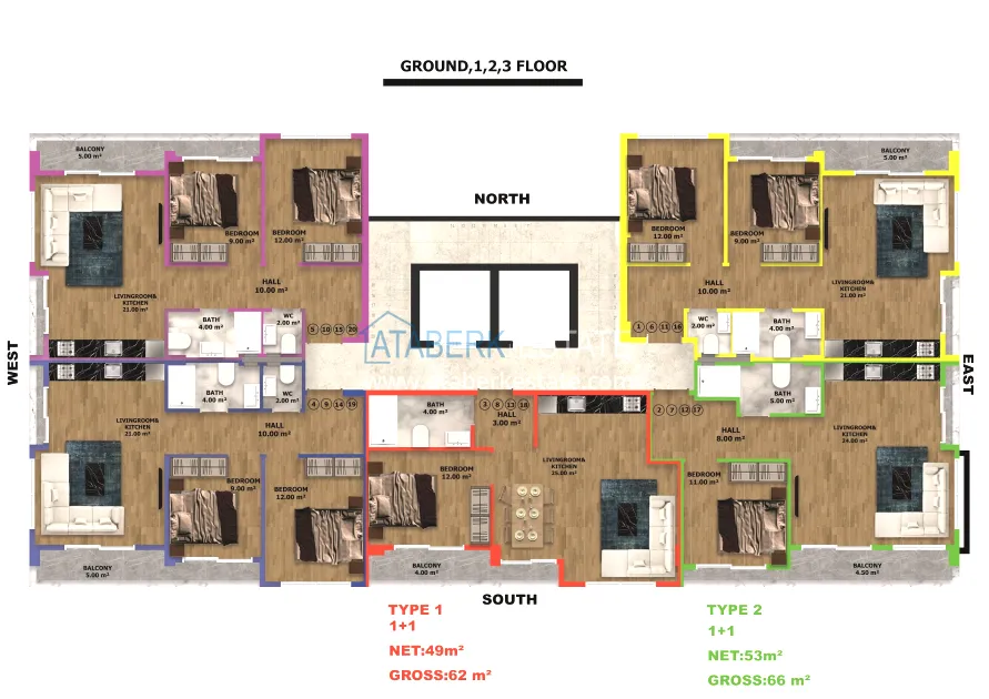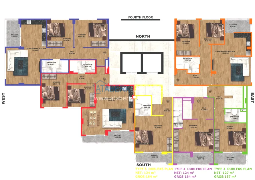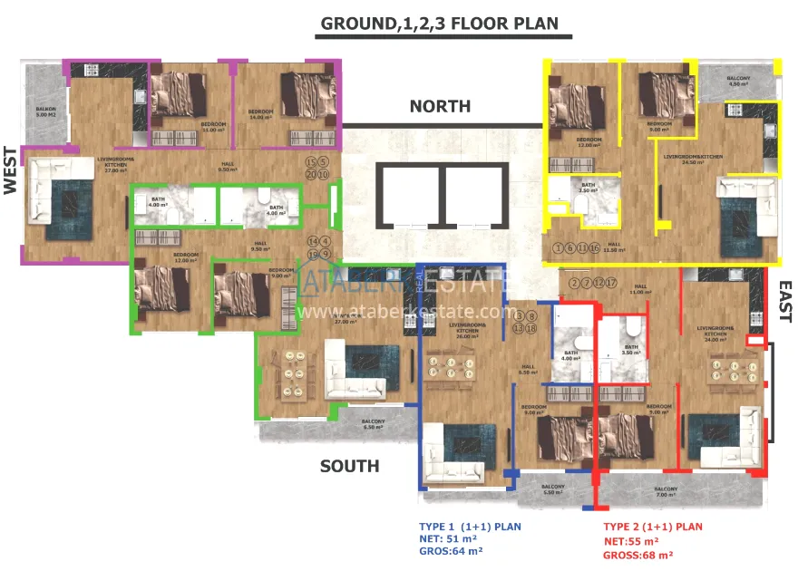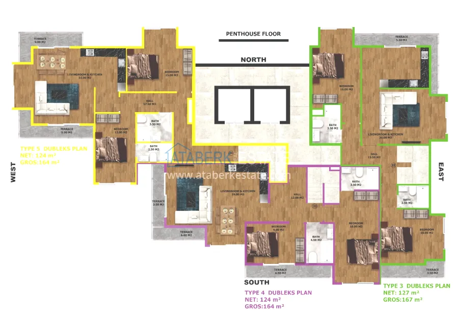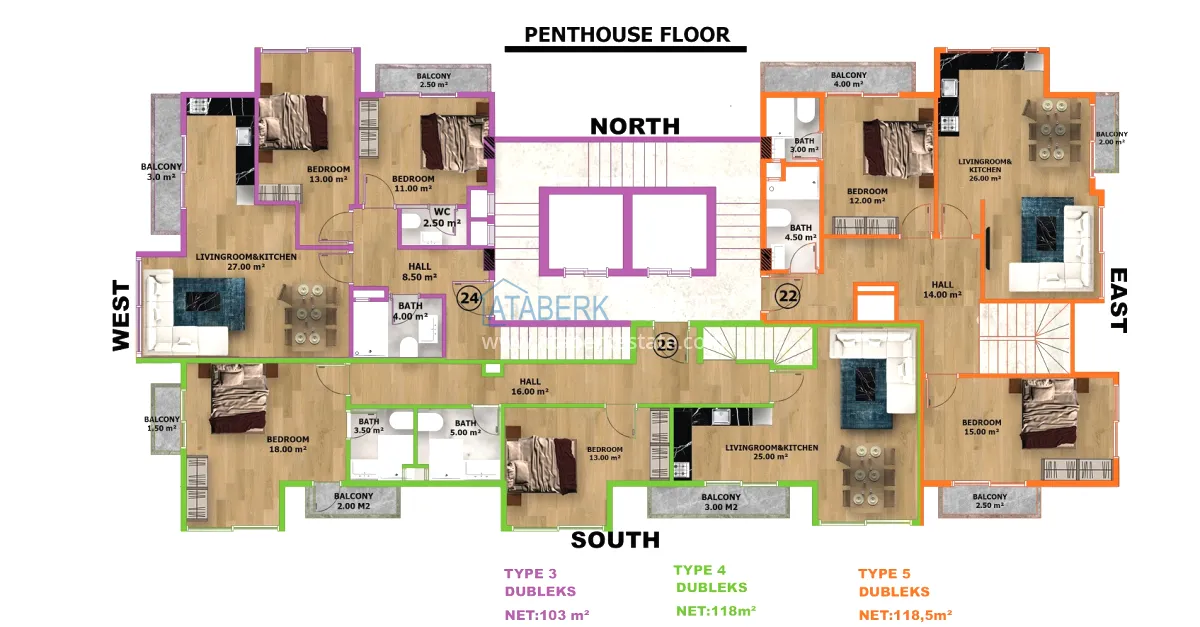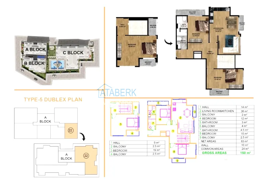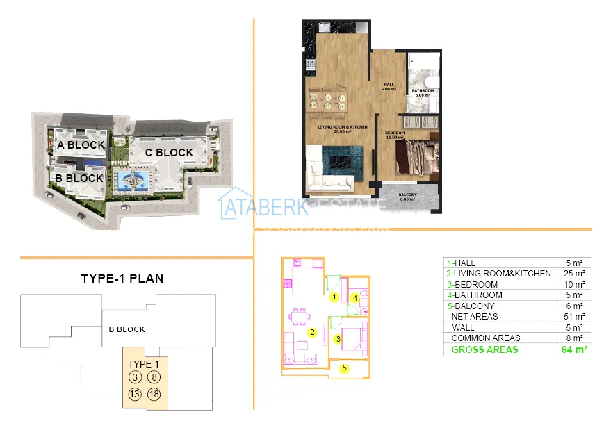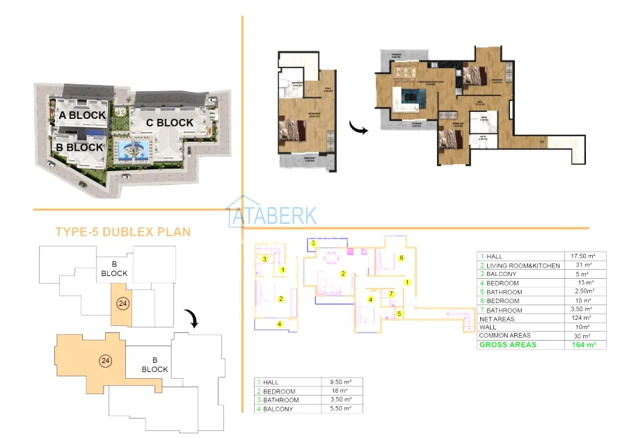 You can choose from 1+1 one-bedroom apartments with an area of 64 m2 and 3+1 duplex penthouses with an area of 150 and 164 m2. The price includes full finishing, built-in kitchen and equipped bathrooms.