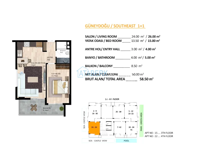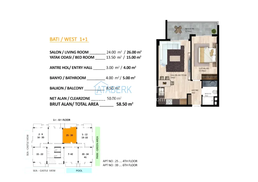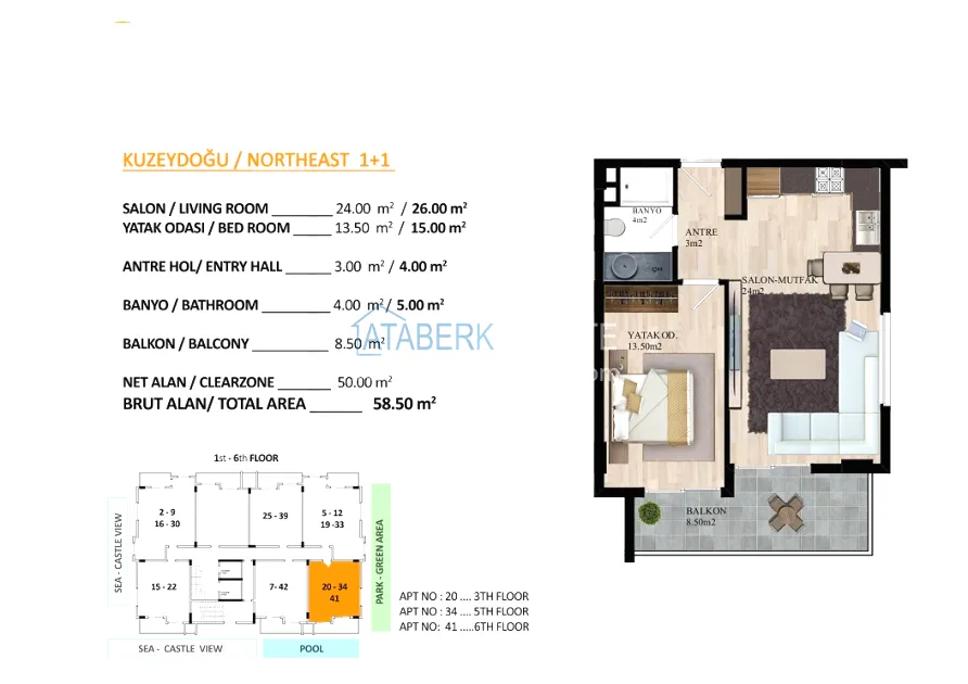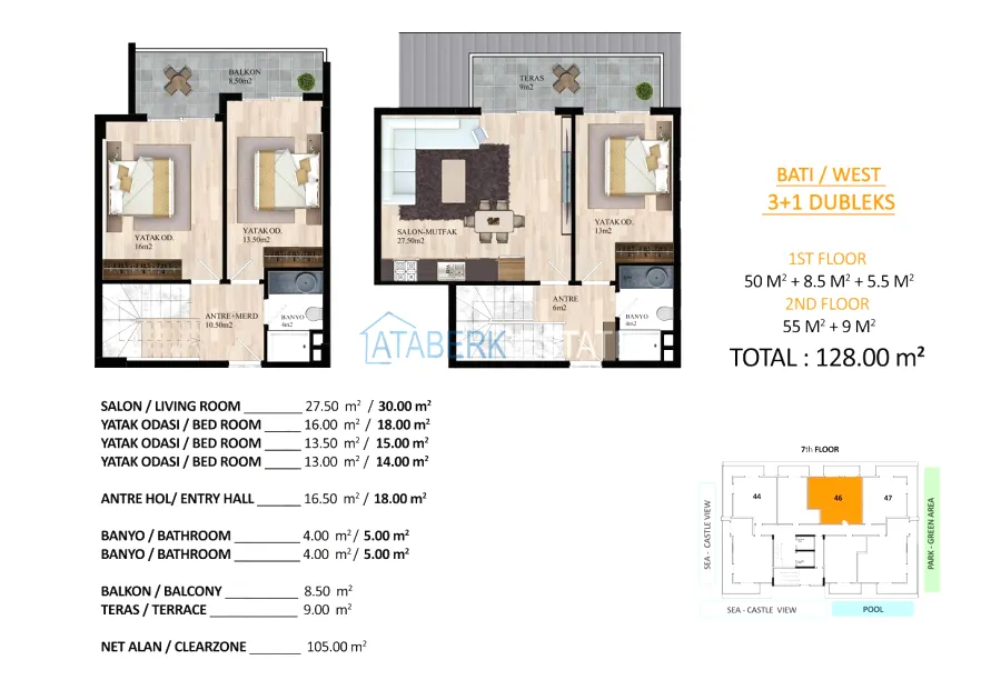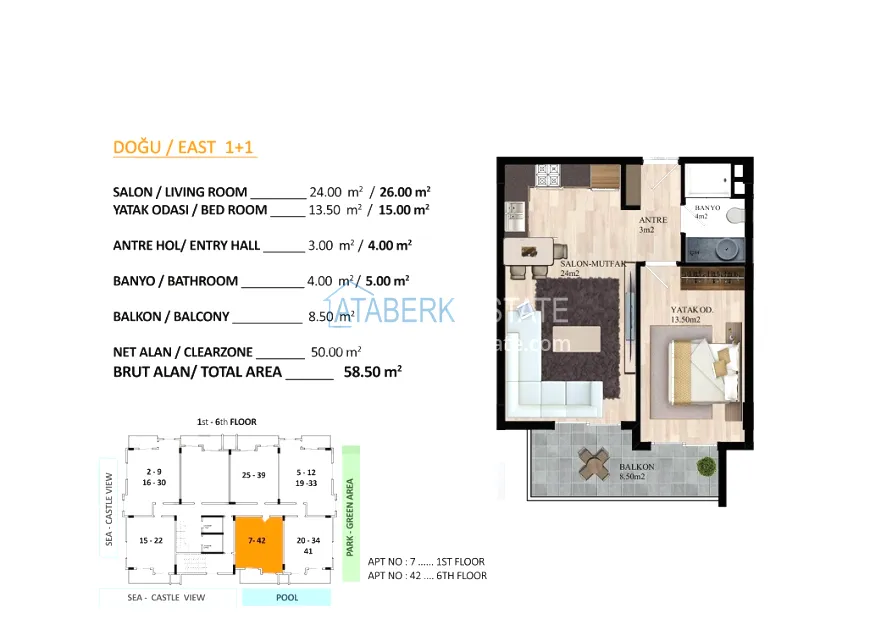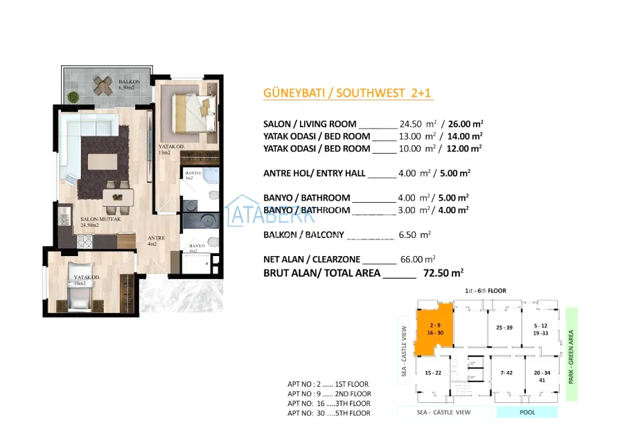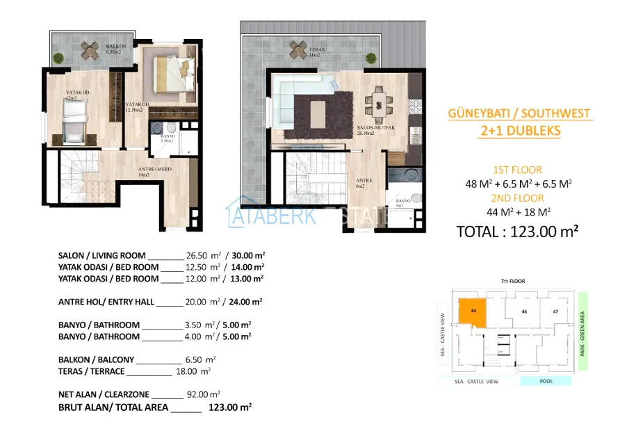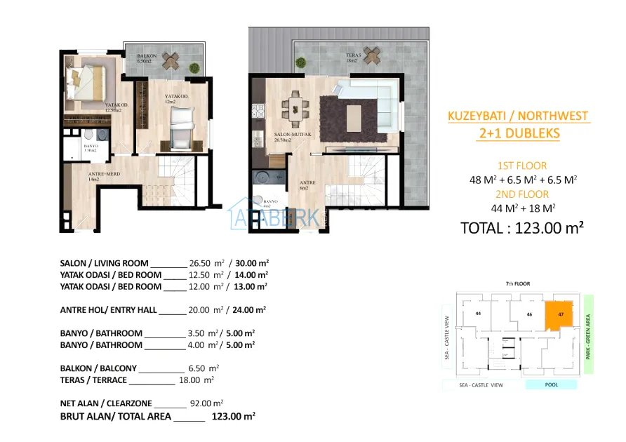 In total, the project has 49 apartments; the following layouts are offered for sale: 1+1 with an area of 58.5 m2, 2+1 with an area of 72.5 m2, 2+1 and 3+1 duplexes with an area of 123 and 128 m2. The price includes: full finishing, a steel front door, air conditioners, a Smart Home system, a set of cabinet furniture in the kitchen area, motorized roller shutters on the windows, high-quality plumbing and fully equipped bathrooms.