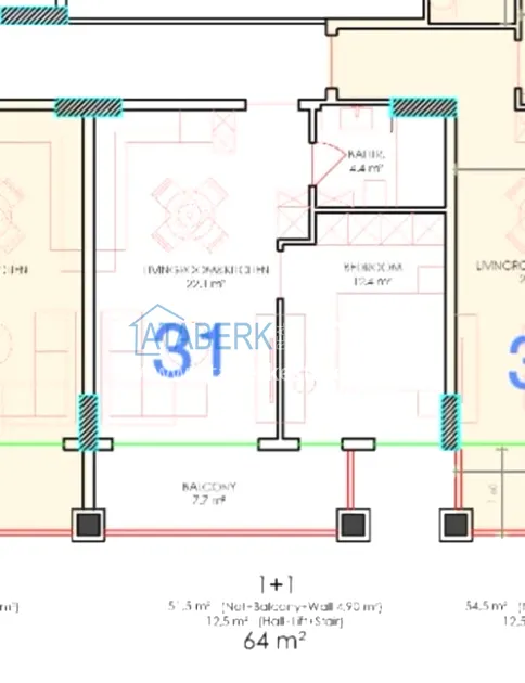 A 1+1 apartment with a total area of 64 m2 (net 49 m2) is offered for sale, 5th floor, south-east side. The price of the apartments already includes full finishing, equipped bathrooms and built-in furniture in the kitchen area.