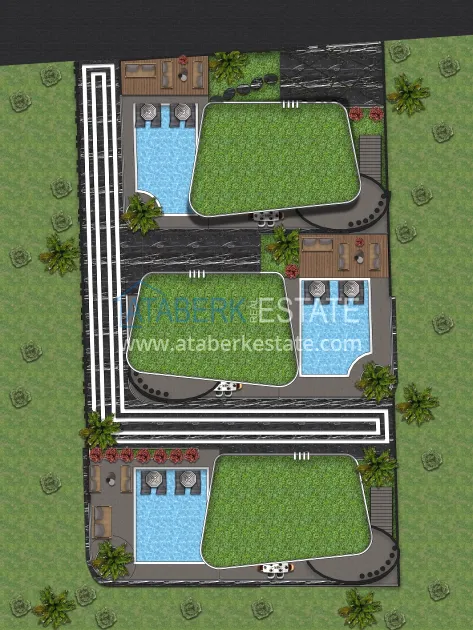 Each villa will have: a swimming pool with an automatic canopy and a heating system, a relaxation area with sun loungers, a green garden, a terrace, and a garage. A video surveillance system and outdoor LED lighting will be installed along the entire perimeter of the complex.