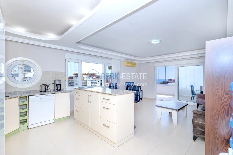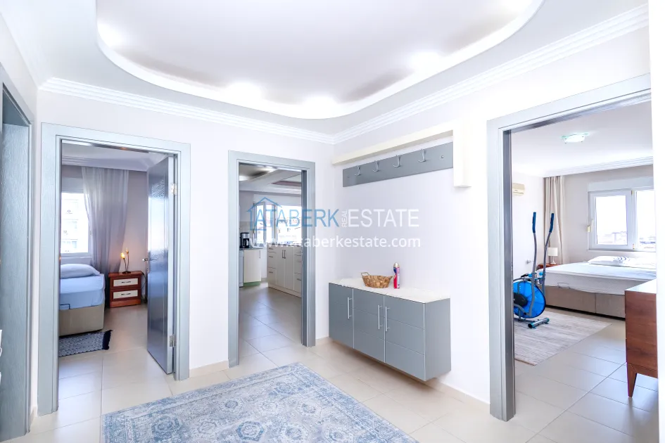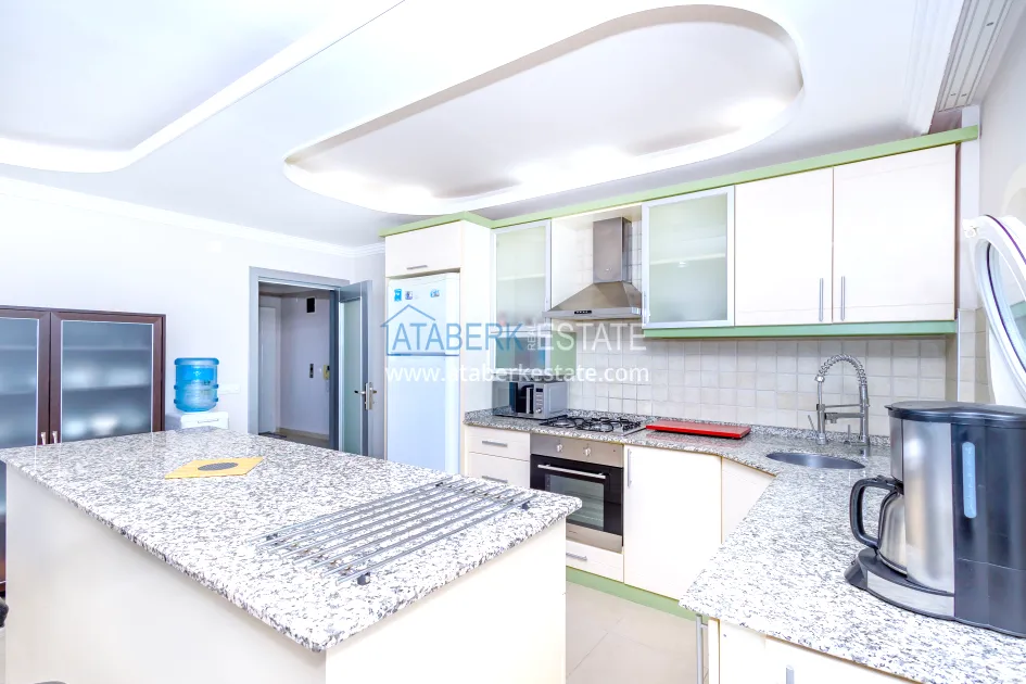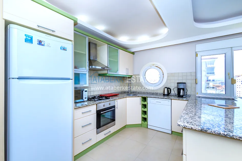 The 2+1 apartment is located on the 5th floor of a 9-storey building and has a total area of 120 m². The layout of the apartment includes an entrance hall, a living room combined with an open-plan kitchen, two bedrooms, two bathrooms and two spacious glazed balconies. The apartment is furnished in a modern style, and everything you see in the photo is already included in the price.