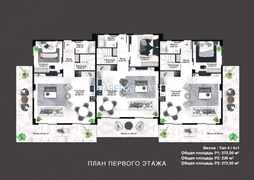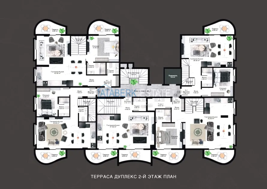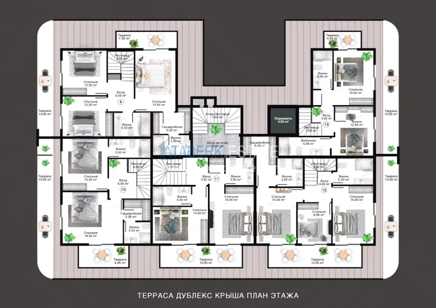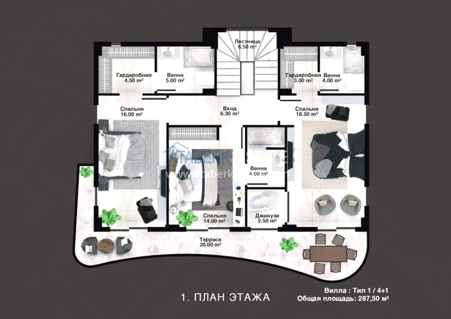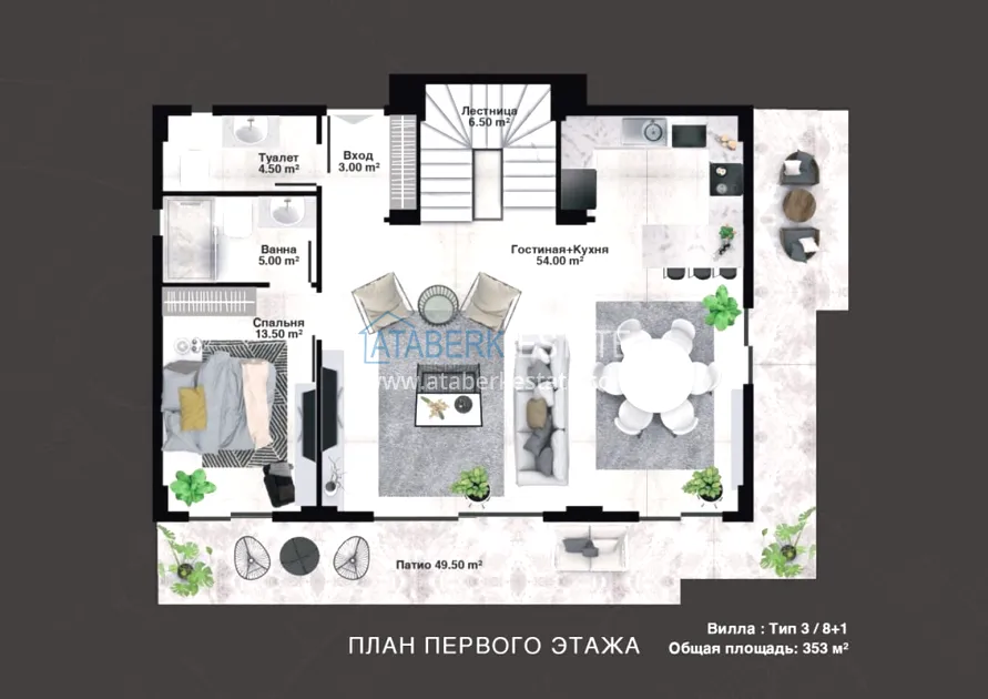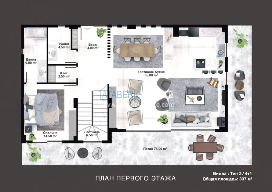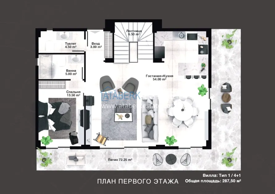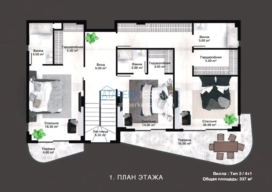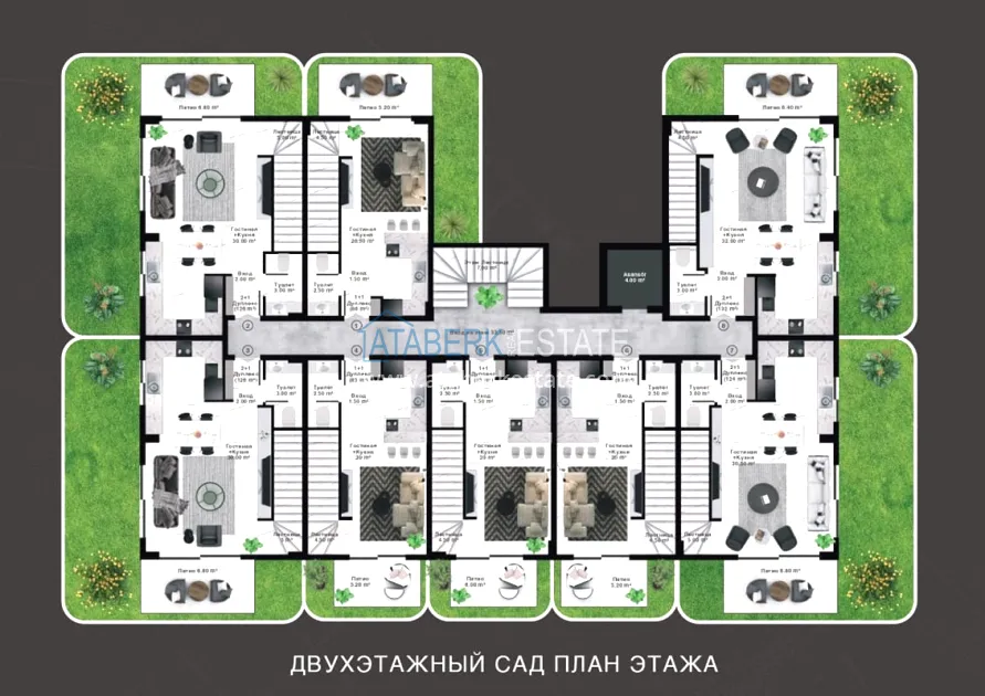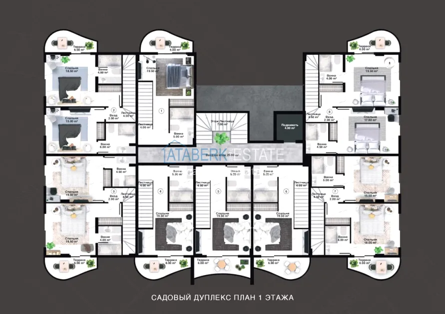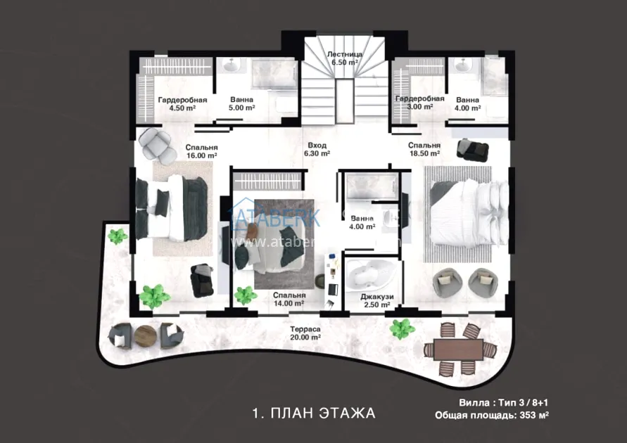 The project is being implemented in Kargicak, a picturesque and prestigious area of Alanya, 3 km from the Mediterranean coast. It will be built on a plot of 15,000 m2, with a building area of 10,000 m2. The project consists of 3 blocks with 20 apartments — all duplexes, as well as 15 4 types of villas with private pools and private grounds. The complex will have a rich infrastructure, thanks to which you and your family will enjoy relaxing and living in a gated elite complex, and investors will easily be able to earn income from renting out real estate. The new investment project will comply with modern security systems and the highest requirements for seismic resistance.