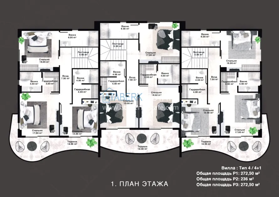 Layout types: 1+1, 2+1, 3+1, 4+1, the area varies from 84 to 206 m2. Villas: 8+1 and 4+1 with an area of 272.5 to 353 m2. All villas and apartments are on two levels. Each villa has a covered parking lot for 2 cars.