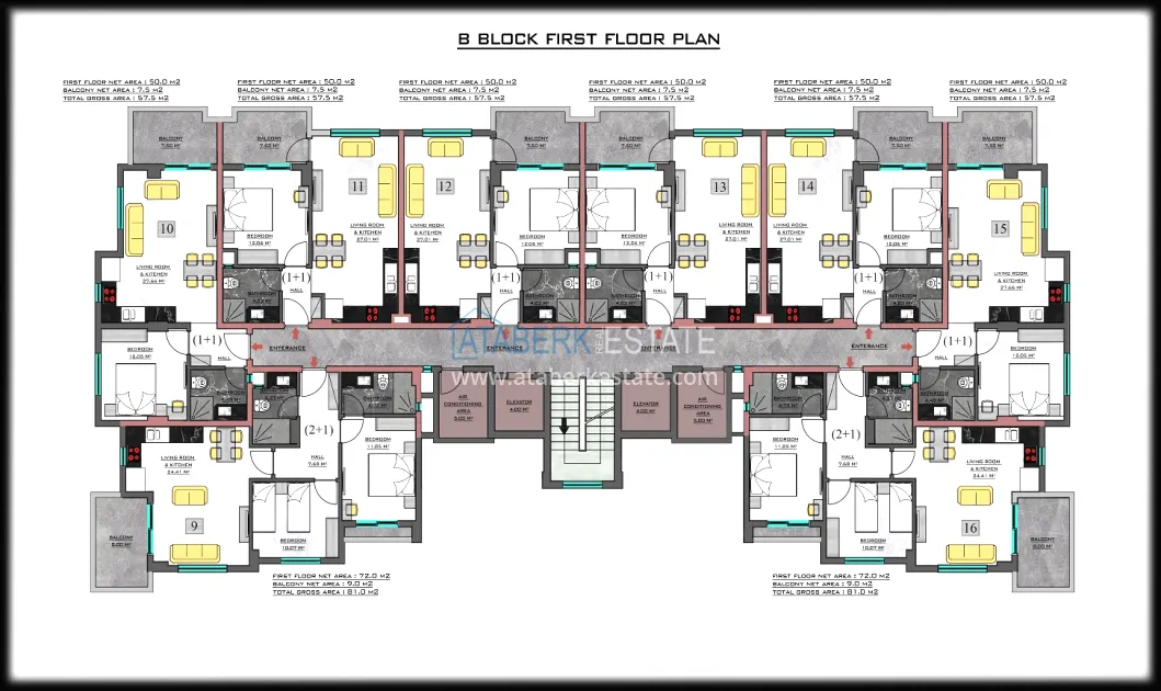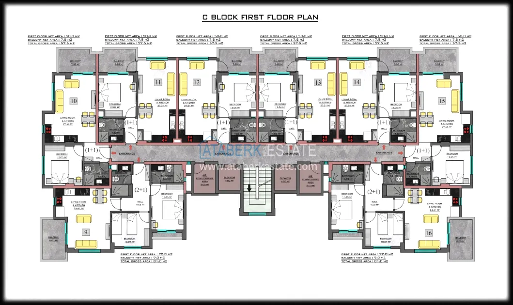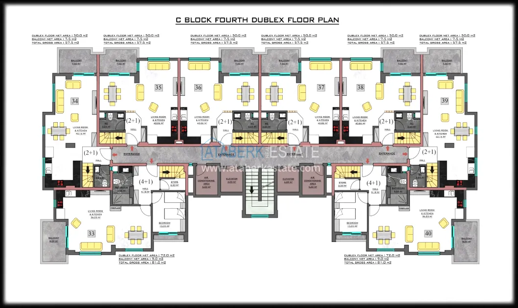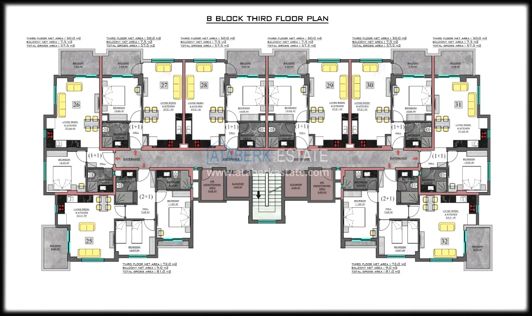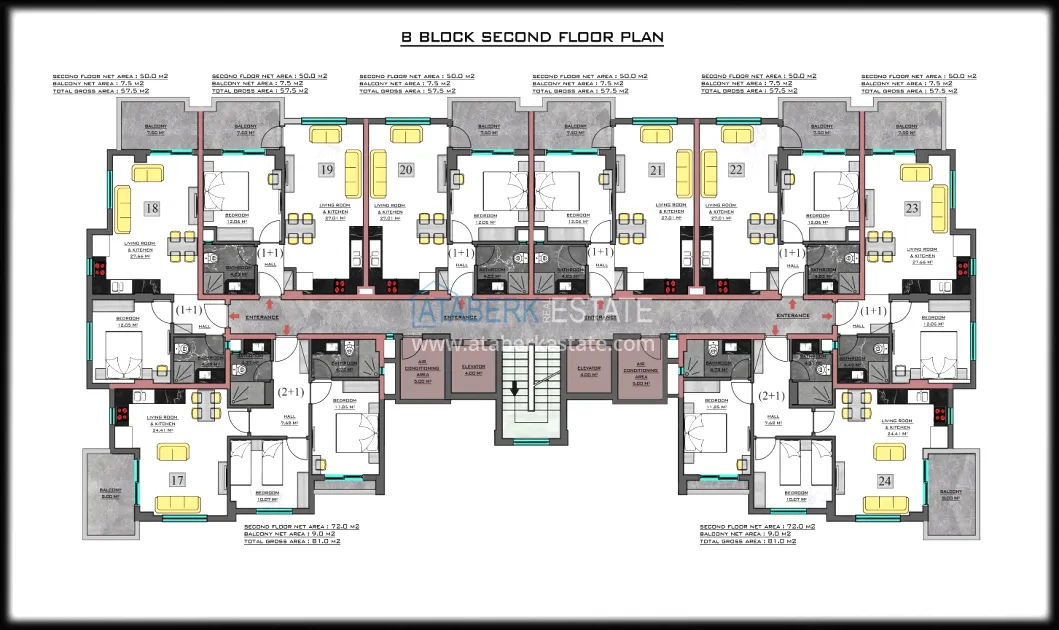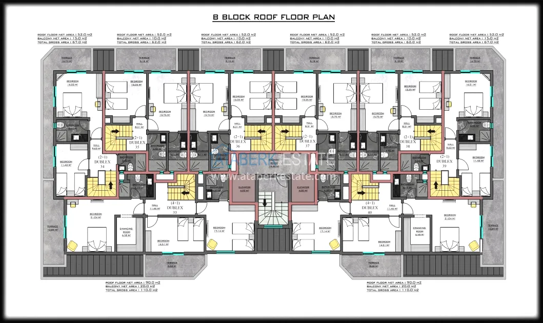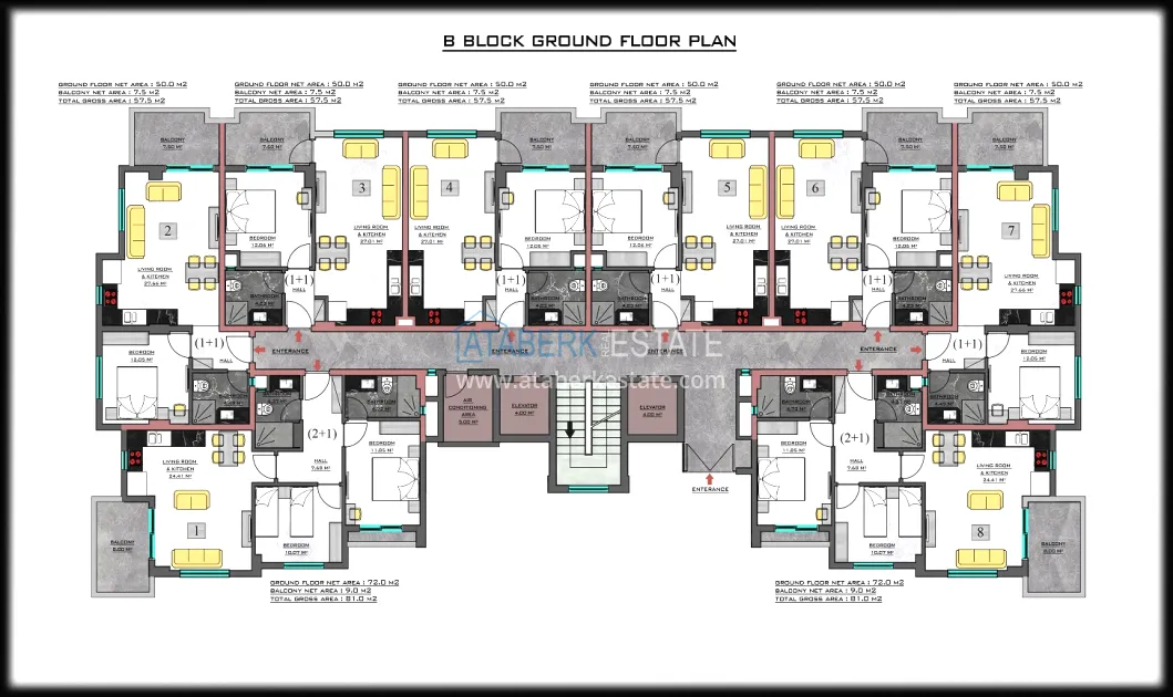 The luxury complex is built on a plot of 6,645 m2 and consists of three blocks containing 112 luxury apartments. Apartments for sale in blocks B and C are two-room apartments with an area of 57.5 m2, three-room apartments with an area of 81 m2 and two-level penthouses with a layout of 2+1 and 3+1 with an area of 119.5 and 191 m2.