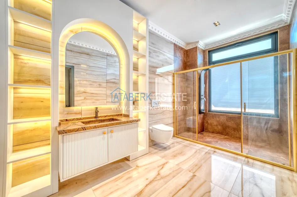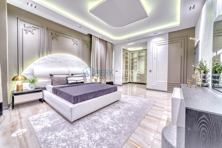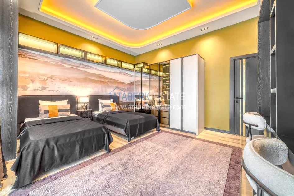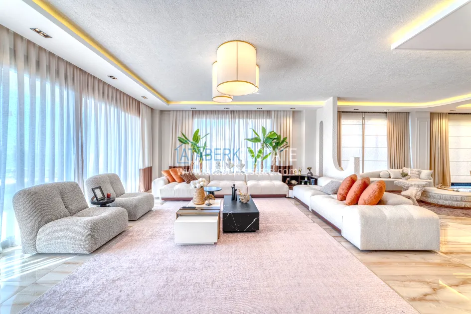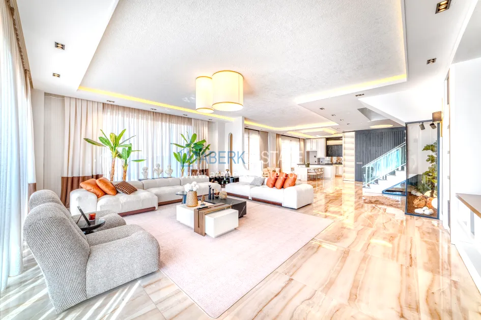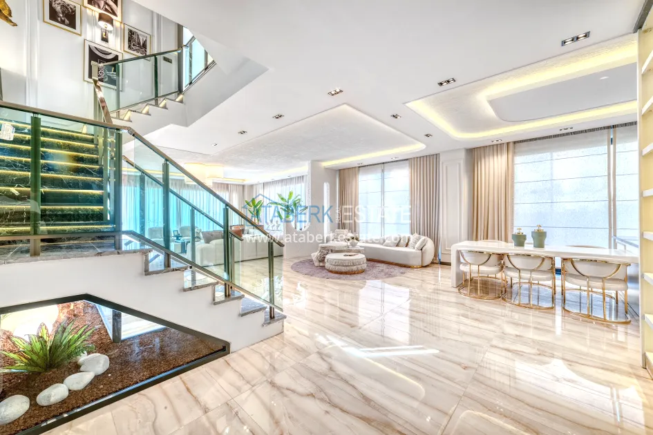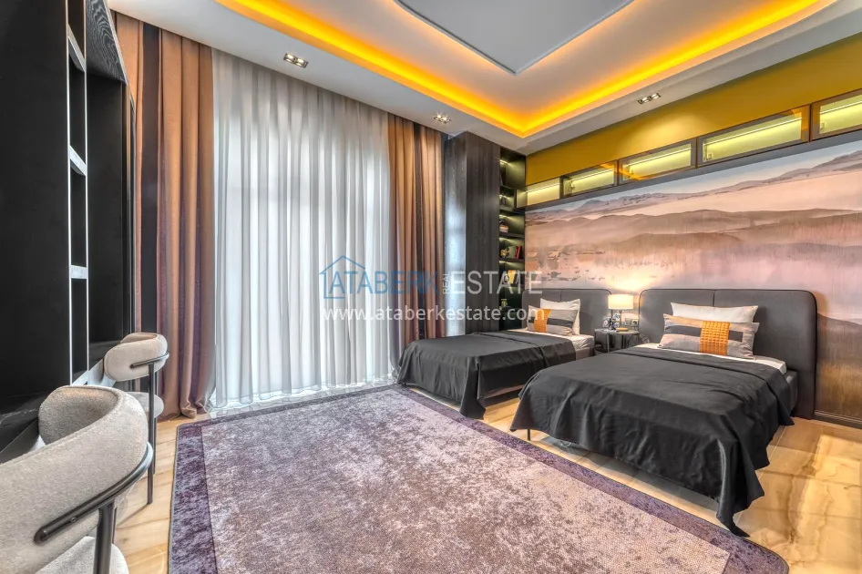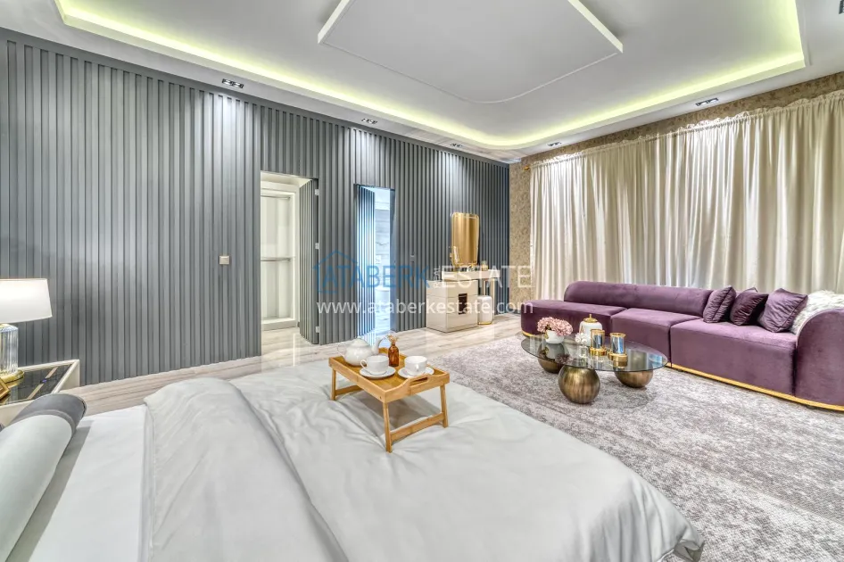 An impressive three-story 6+1 villa with magnificent sea and mountain views is ideal for a comfortable life in Alanya. The designers have carefully thought out the organization of the space, where each room is designed for comfort and relaxation. The house includes a living room, a separate kitchen with a dining area, 6 spacious bedrooms, each with its own bathroom. There are also five balconies, a terrace, a hammam, a sauna, a fitness room and an elevator system. The total area of the villa is 440 m². The private area includes a swimming pool, winter garden, barbecue area and parking. The villa is built on a plot of 673 m2.
