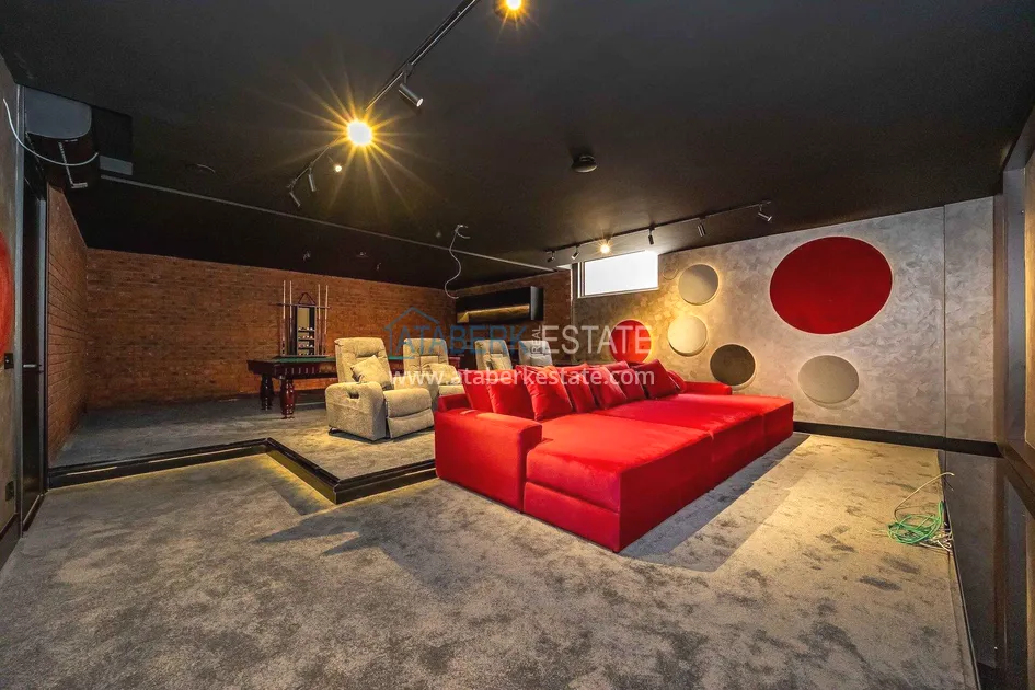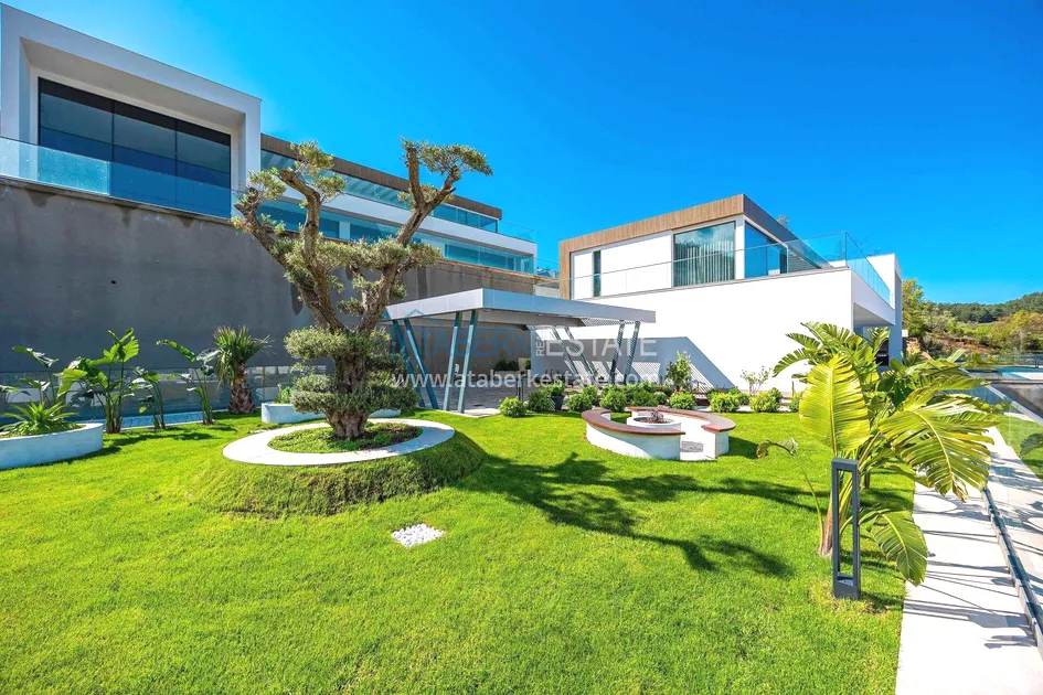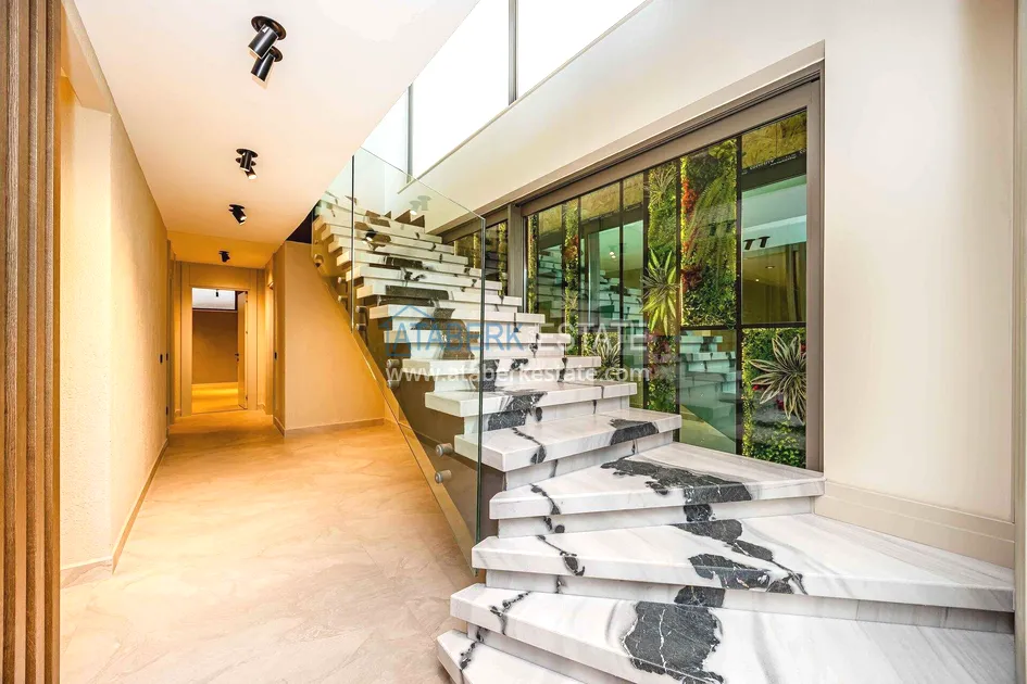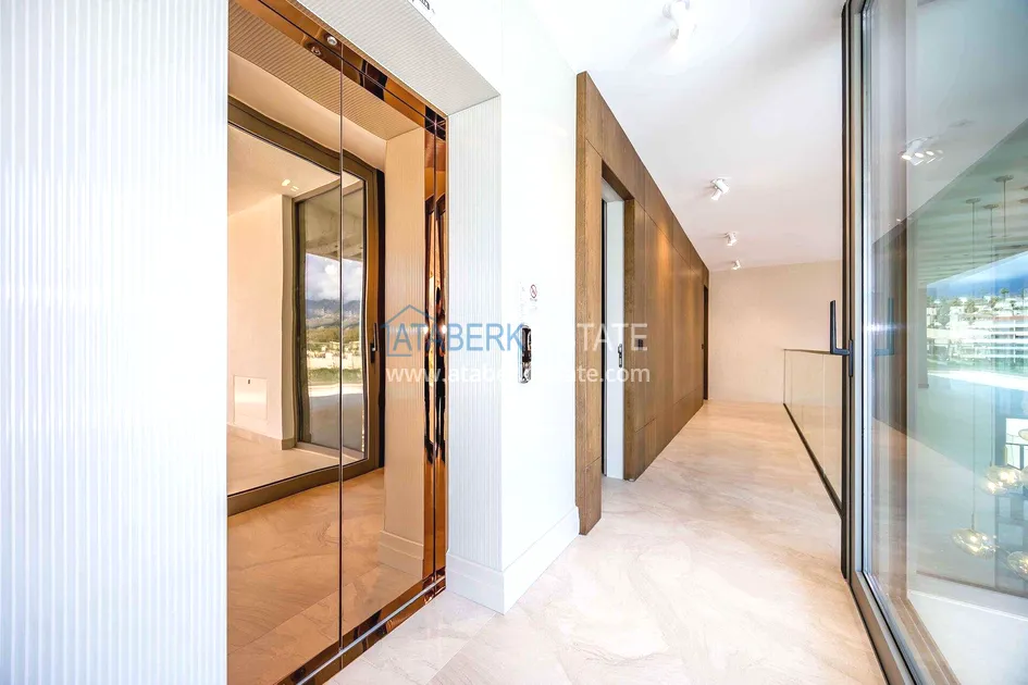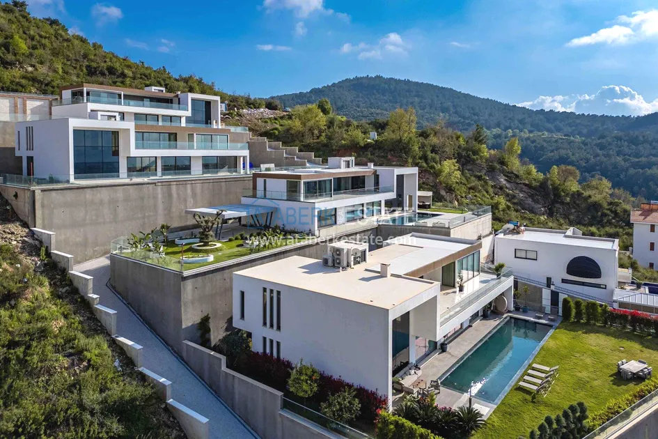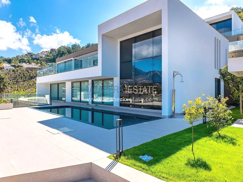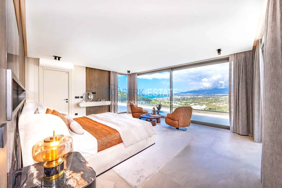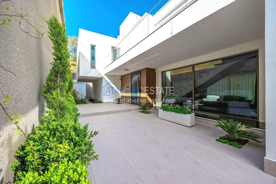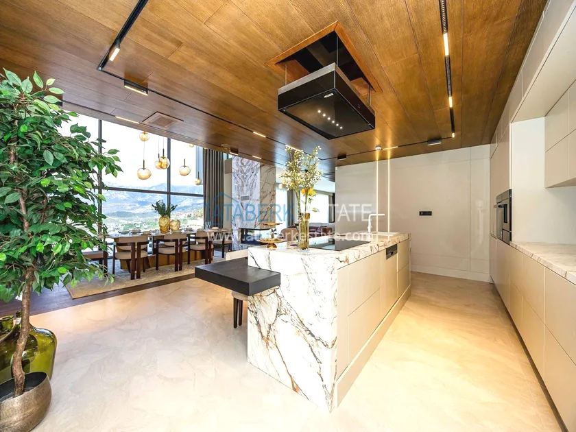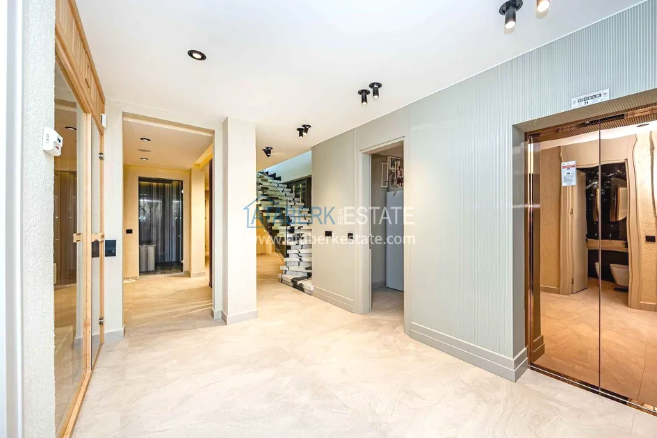 of workmanship. Thistwo-story 4+1 villa with a total area of 648 m² is located on a plot of 1,133 m². A full-fledged private relaxation area is organized in the basement level: a fitness room, a hammam, a sauna, a massage room, a cinema, a hobby room, a storage room, and a bathroom. The first floor includes a spacious living room with panoramic windows and a fireplace, a separate kitchen with a functional island area, a bedroom with a dressing room and a private bathroom, and on the floor there is an additional bathroom and a pantry. On the second level, there are three bedrooms, each with its own bathroom, and access to the terrace. The villa is equipped with an elevator, which provides additional comfort when moving between levels. All key areas offer views of the sea, mountains and natural surroundings