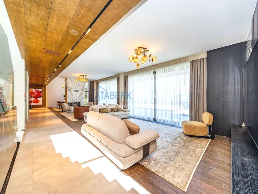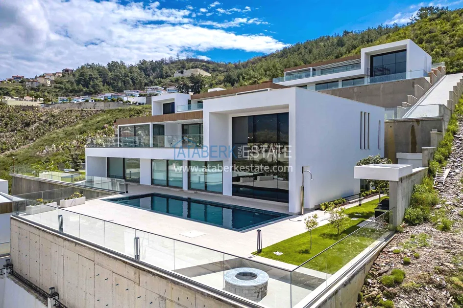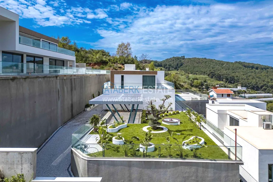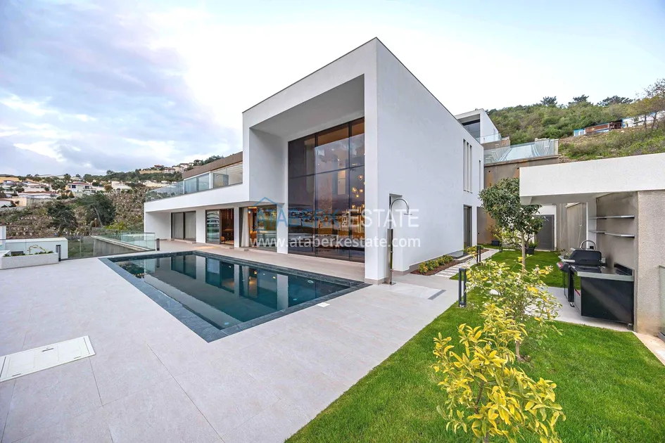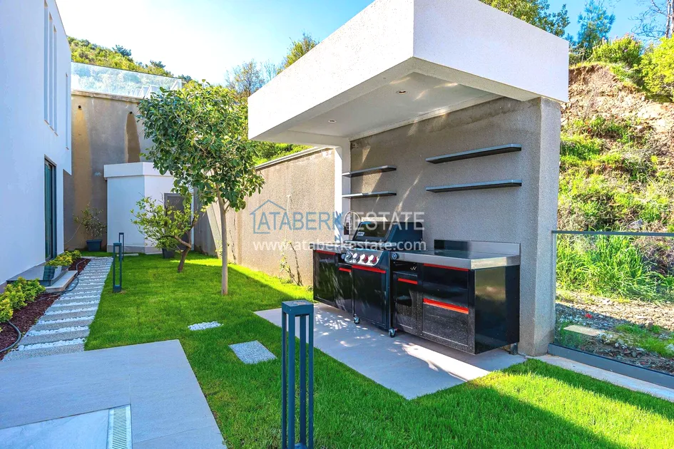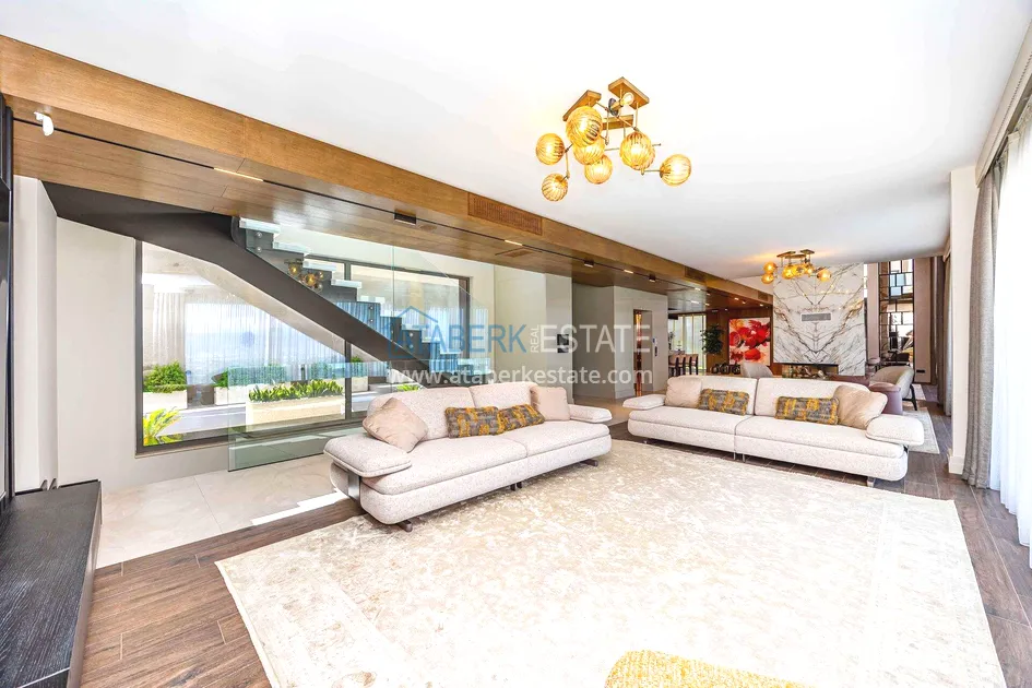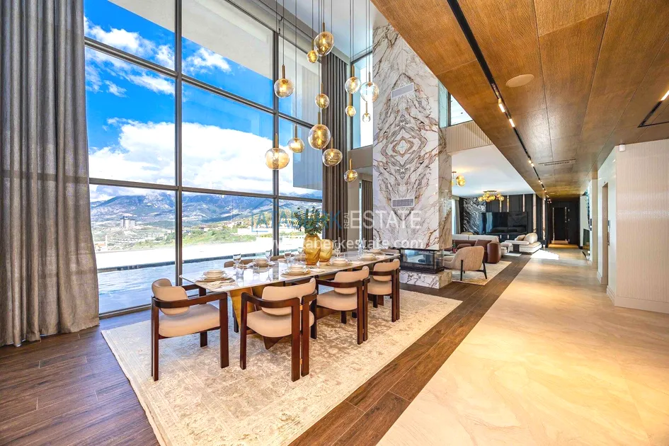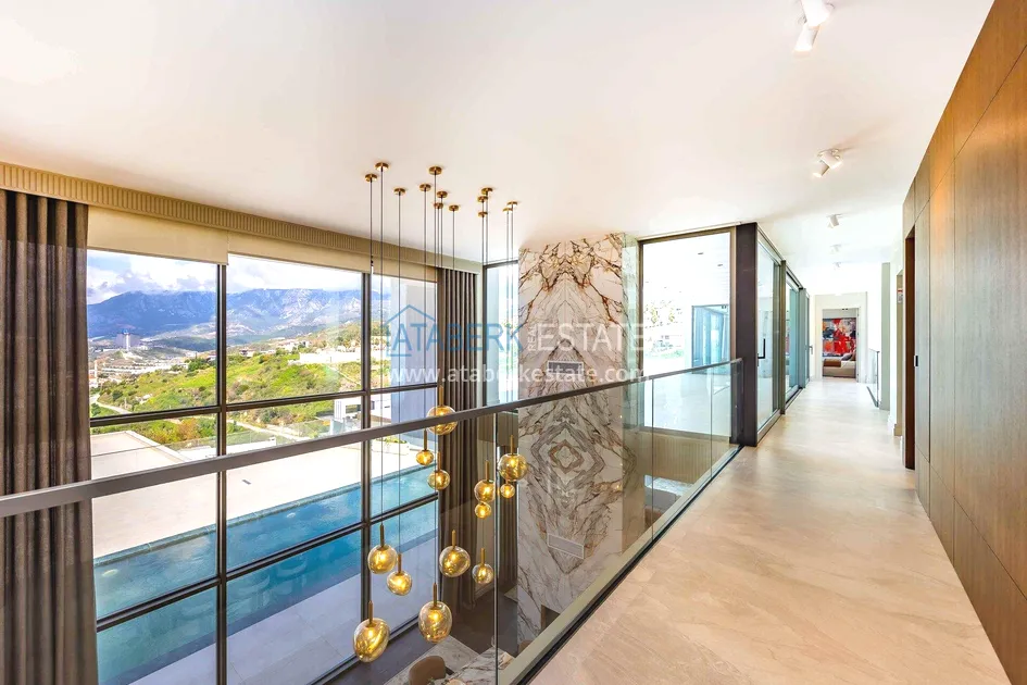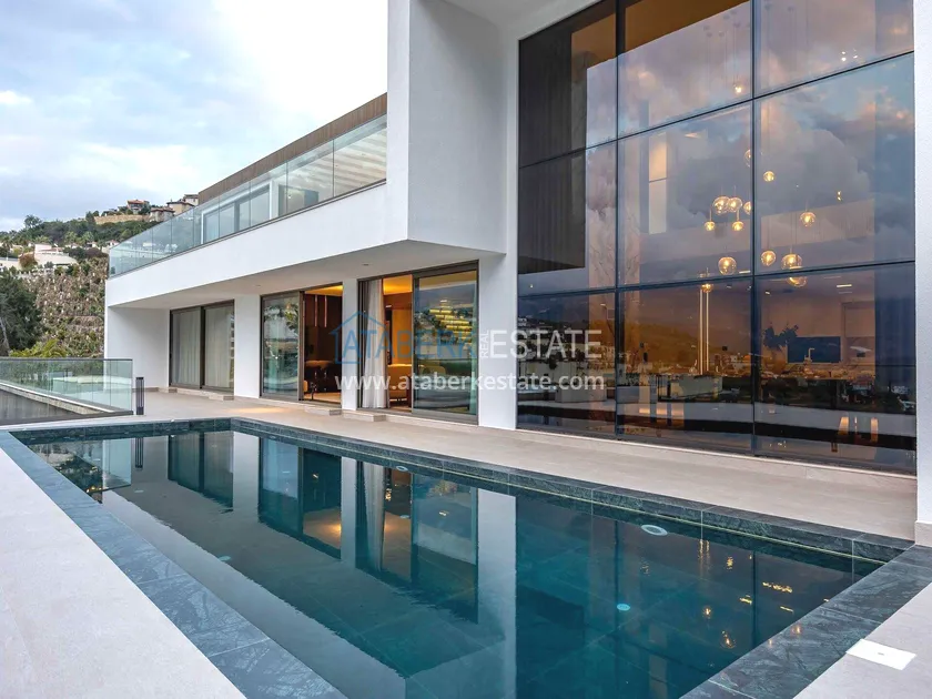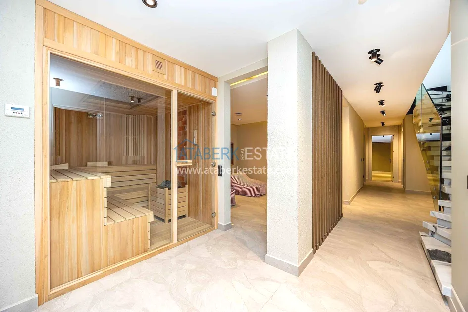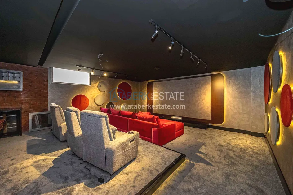 of workmanship. Thistwo-story 4+1 villa with a total area of 648 m² is located on a plot of 1,133 m². A full-fledged private relaxation area is organized in the basement level: a fitness room, a hammam, a sauna, a massage room, a cinema, a hobby room, a storage room, and a bathroom. The first floor includes a spacious living room with panoramic windows and a fireplace, a separate kitchen with a functional island area, a bedroom with a dressing room and a private bathroom, and on the floor there is an additional bathroom and a pantry. On the second level, there are three bedrooms, each with its own bathroom, and access to the terrace. The villa is equipped with an elevator, which provides additional comfort when moving between levels. All key areas offer views of the sea, mountains and natural surroundings