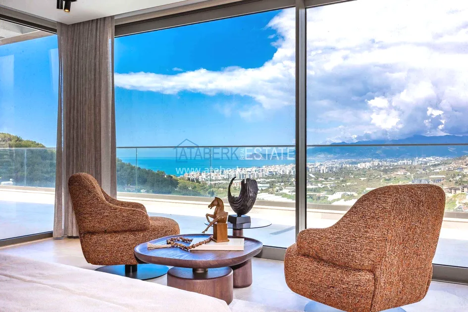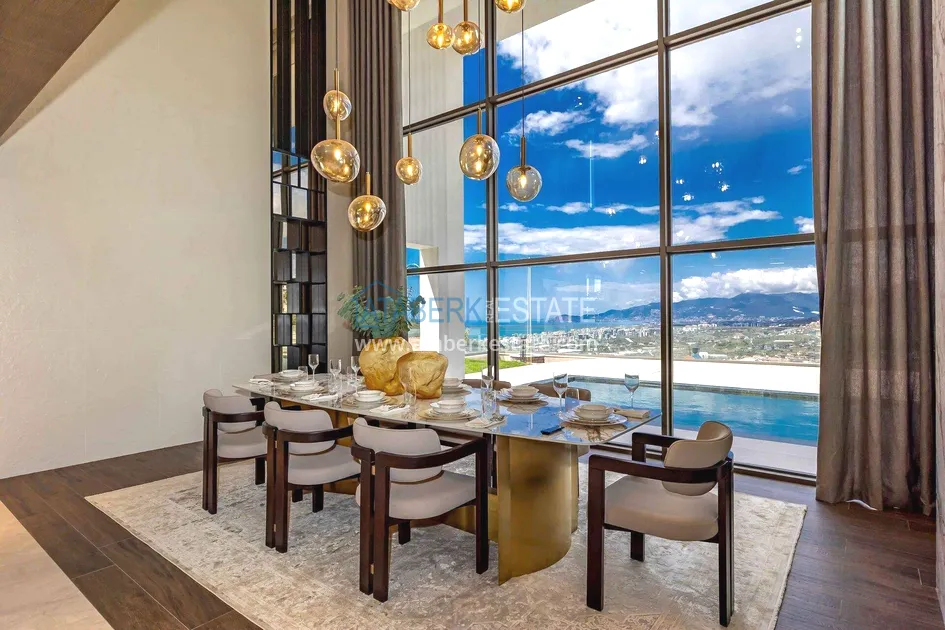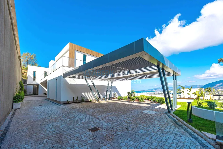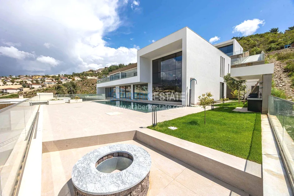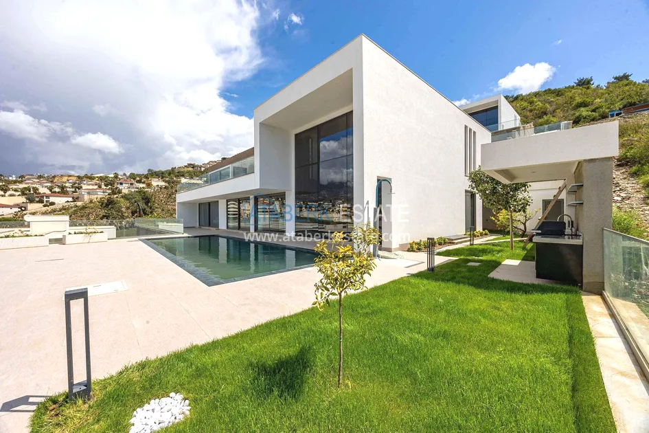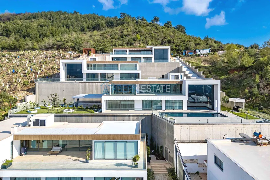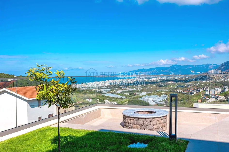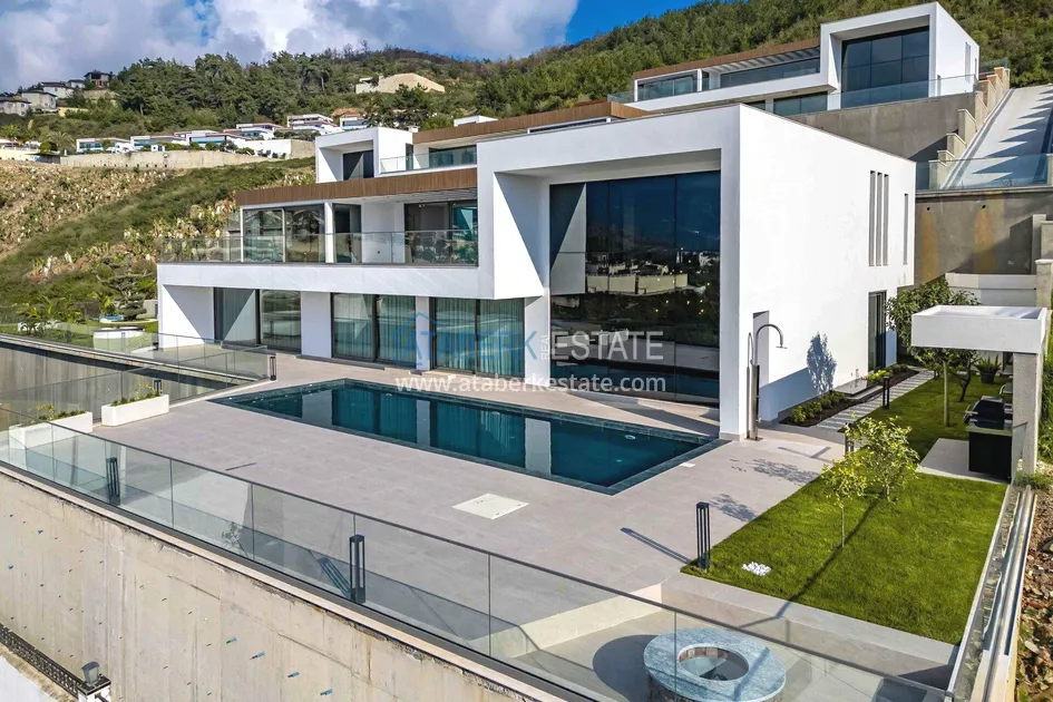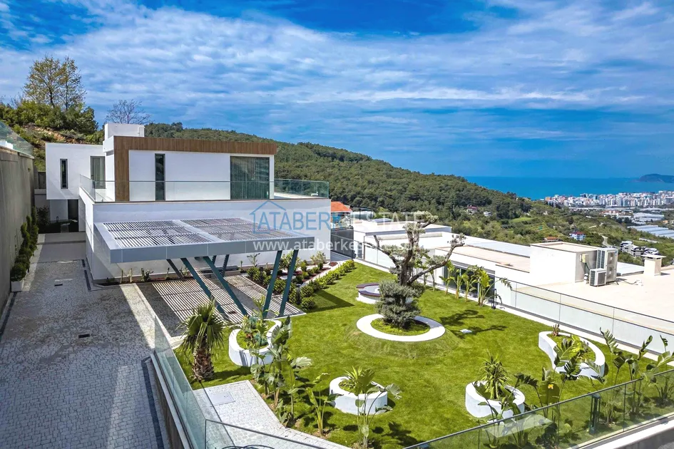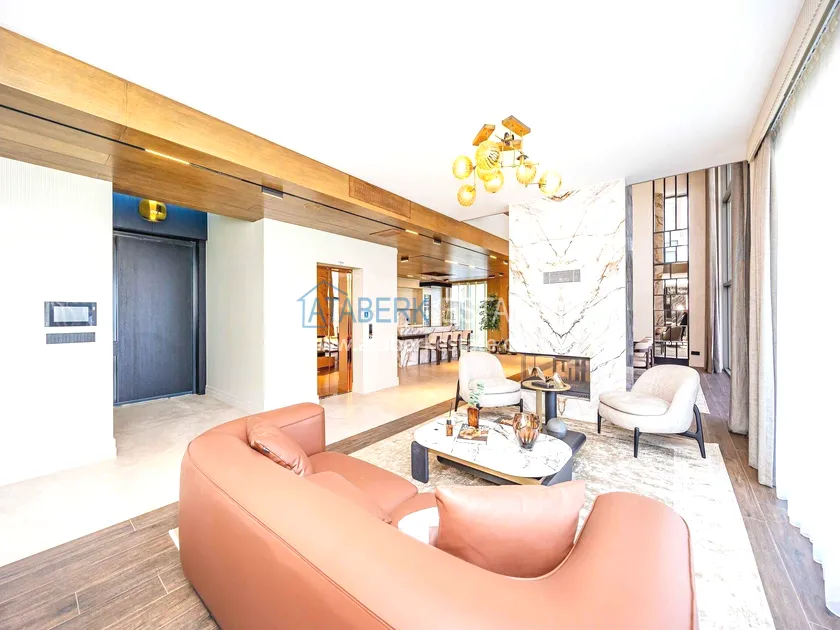 of workmanship. Thistwo-story 4+1 villa with a total area of 648 m² is located on a plot of 1,133 m². A full-fledged private relaxation area is organized in the basement level: a fitness room, a hammam, a sauna, a massage room, a cinema, a hobby room, a storage room, and a bathroom. The first floor includes a spacious living room with panoramic windows and a fireplace, a separate kitchen with a functional island area, a bedroom with a dressing room and a private bathroom, and on the floor there is an additional bathroom and a pantry. On the second level, there are three bedrooms, each with its own bathroom, and access to the terrace. The villa is equipped with an elevator, which provides additional comfort when moving between levels. All key areas offer views of the sea, mountains and natural surroundings