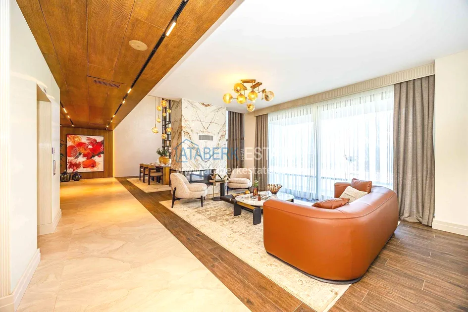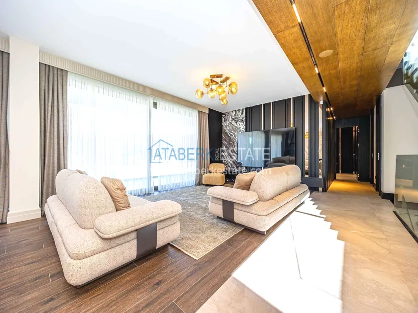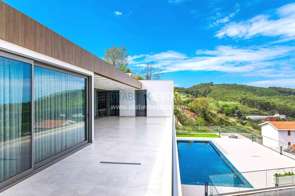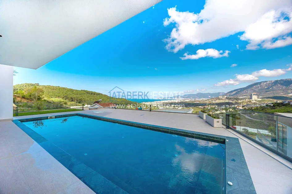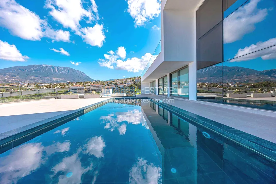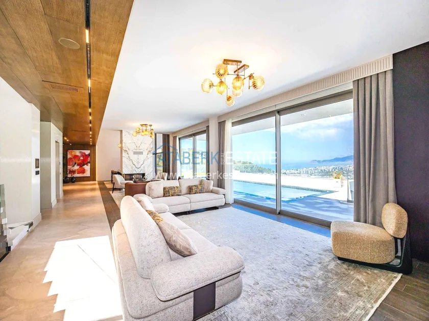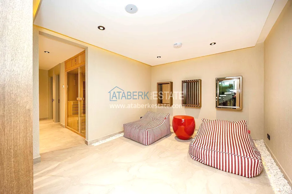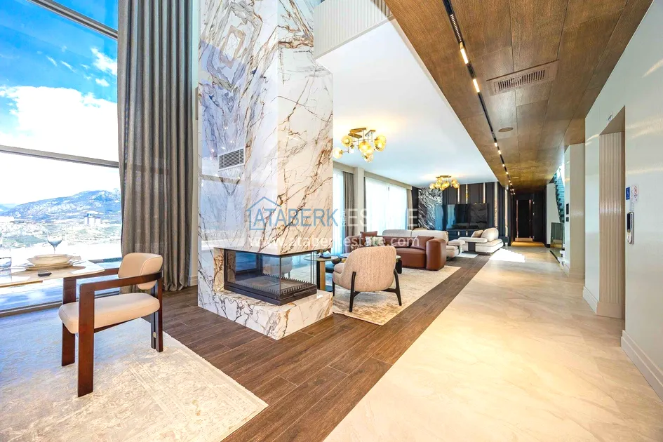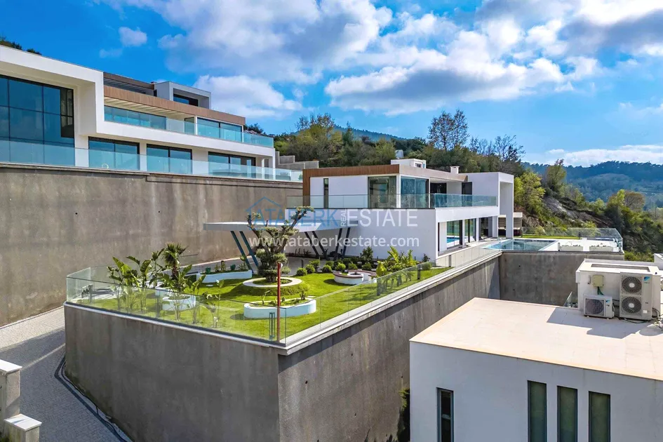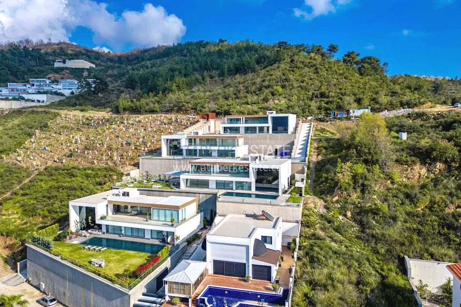 of workmanship. Thistwo-story 4+1 villa with a total area of 648 m² is located on a plot of 1,133 m². A full-fledged private relaxation area is organized in the basement level: a fitness room, a hammam, a sauna, a massage room, a cinema, a hobby room, a storage room, and a bathroom. The first floor includes a spacious living room with panoramic windows and a fireplace, a separate kitchen with a functional island area, a bedroom with a dressing room and a private bathroom, and on the floor there is an additional bathroom and a pantry. On the second level, there are three bedrooms, each with its own bathroom, and access to the terrace. The villa is equipped with an elevator, which provides additional comfort when moving between levels. All key areas offer views of the sea, mountains and natural surroundings