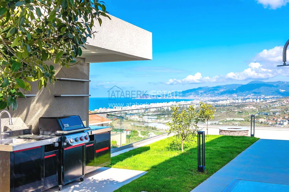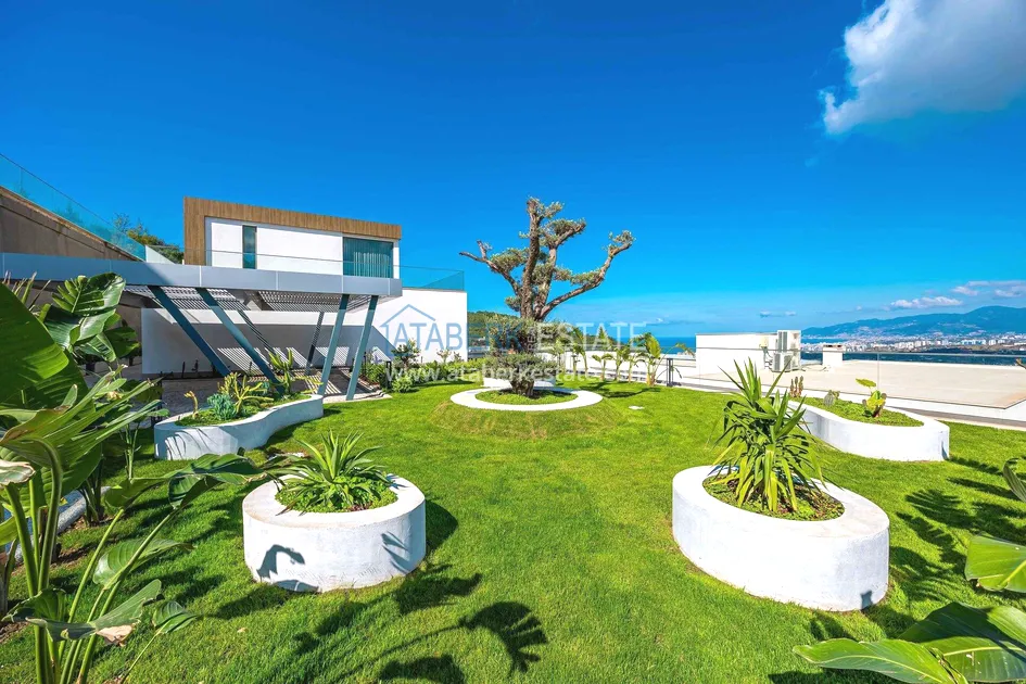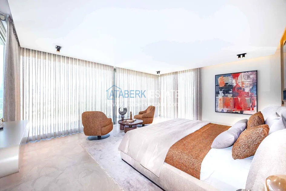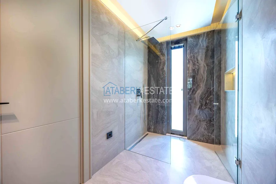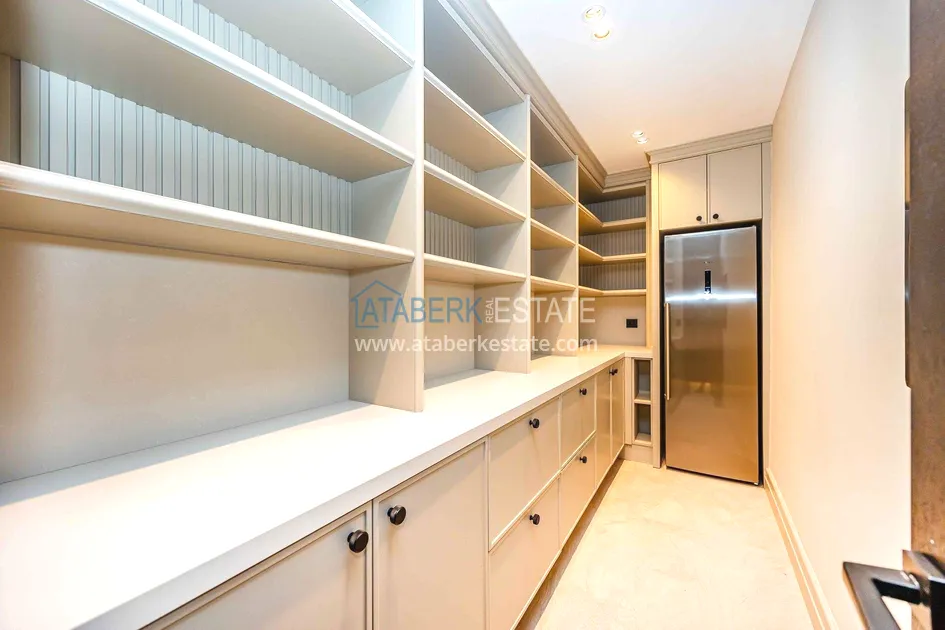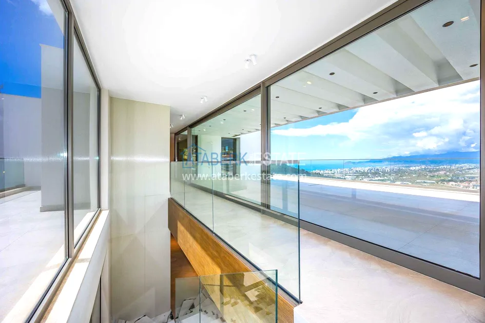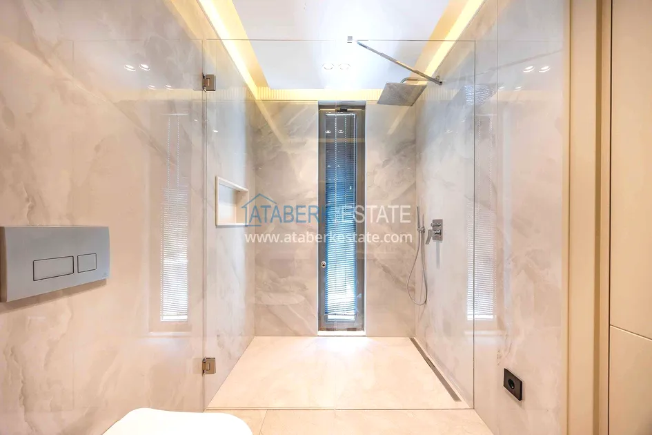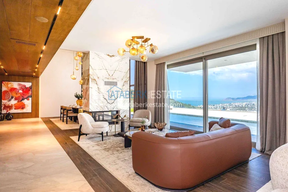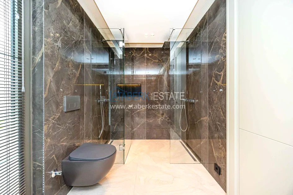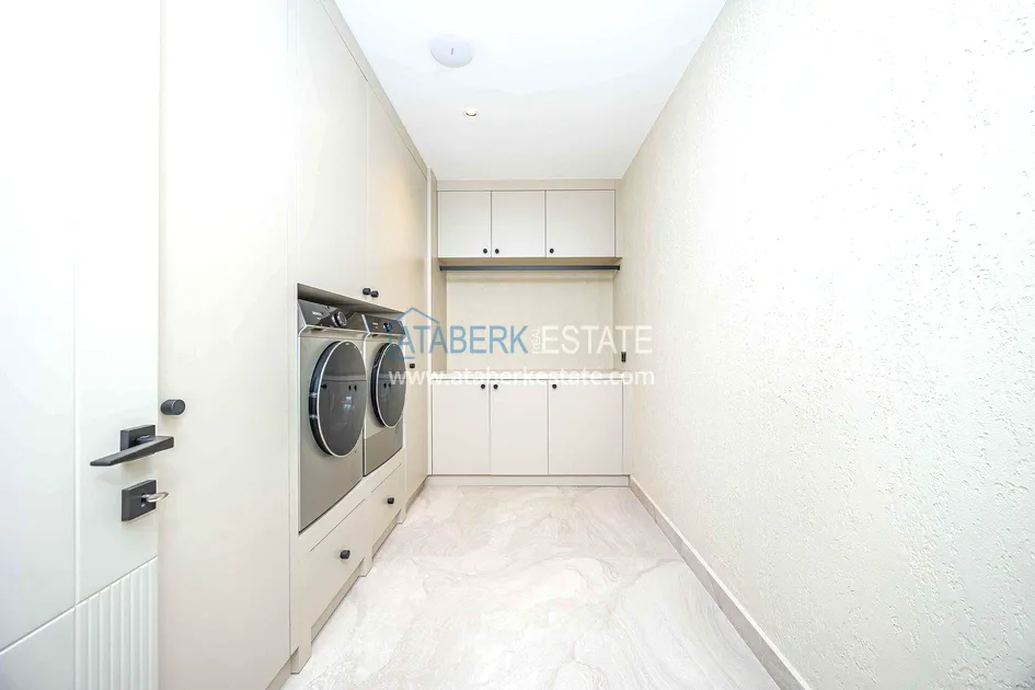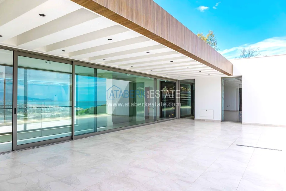 of workmanship. Thistwo-story 4+1 villa with a total area of 648 m² is located on a plot of 1,133 m². A full-fledged private relaxation area is organized in the basement level: a fitness room, a hammam, a sauna, a massage room, a cinema, a hobby room, a storage room, and a bathroom. The first floor includes a spacious living room with panoramic windows and a fireplace, a separate kitchen with a functional island area, a bedroom with a dressing room and a private bathroom, and on the floor there is an additional bathroom and a pantry. On the second level, there are three bedrooms, each with its own bathroom, and access to the terrace. The villa is equipped with an elevator, which provides additional comfort when moving between levels. All key areas offer views of the sea, mountains and natural surroundings