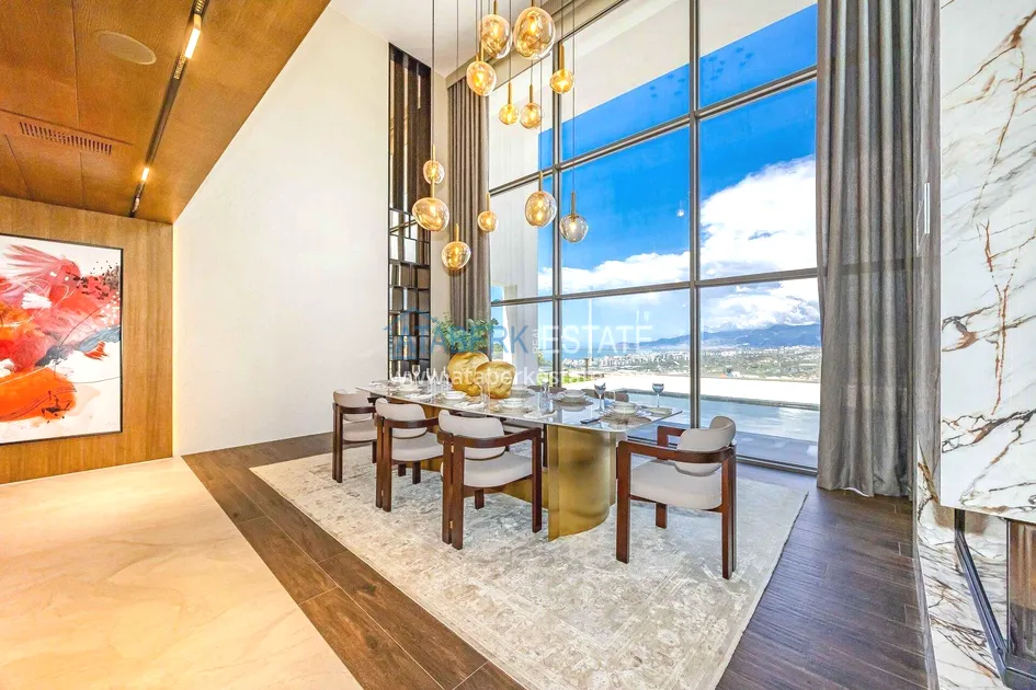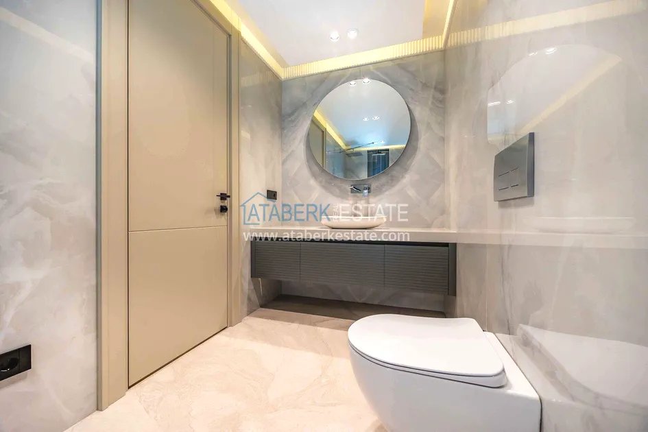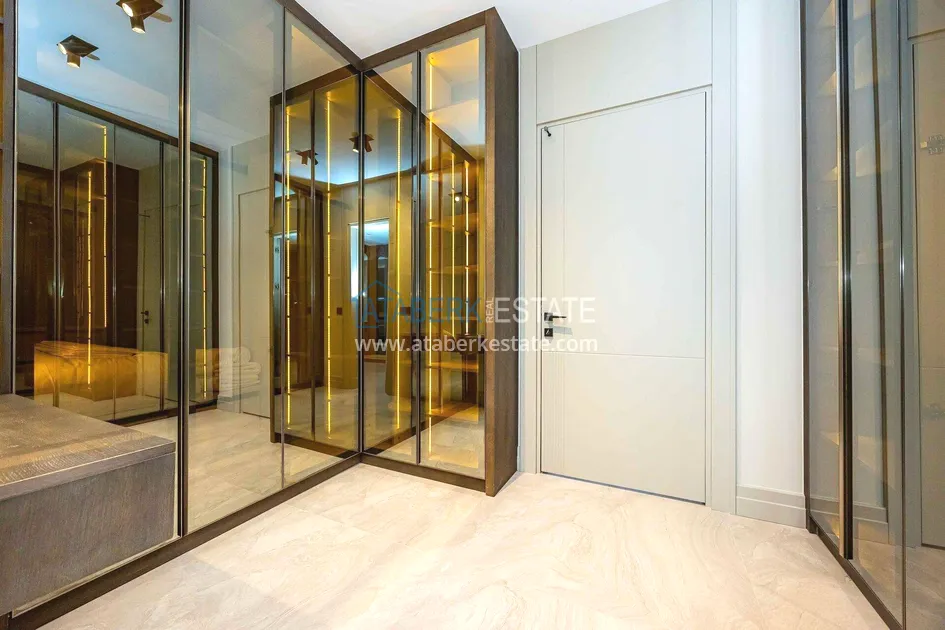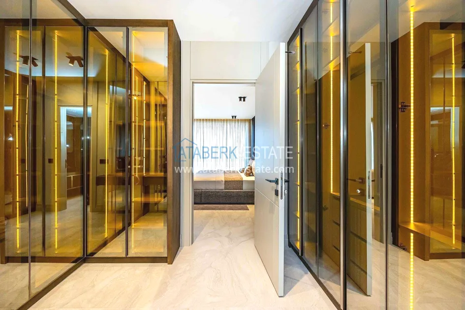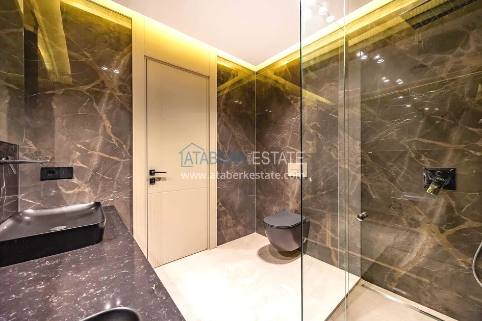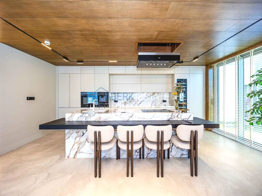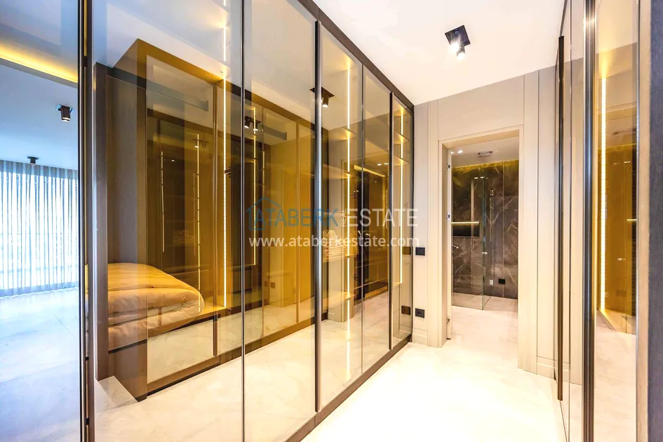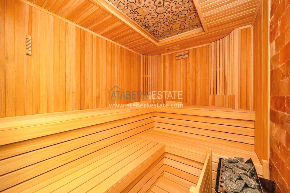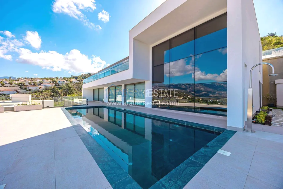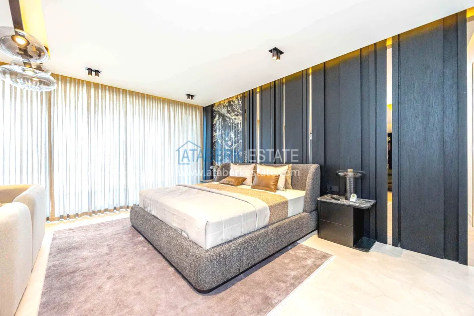 of workmanship. Thistwo-story 4+1 villa with a total area of 648 m² is located on a plot of 1,133 m². A full-fledged private relaxation area is organized in the basement level: a fitness room, a hammam, a sauna, a massage room, a cinema, a hobby room, a storage room, and a bathroom. The first floor includes a spacious living room with panoramic windows and a fireplace, a separate kitchen with a functional island area, a bedroom with a dressing room and a private bathroom, and on the floor there is an additional bathroom and a pantry. On the second level, there are three bedrooms, each with its own bathroom, and access to the terrace. The villa is equipped with an elevator, which provides additional comfort when moving between levels. All key areas offer views of the sea, mountains and natural surroundings