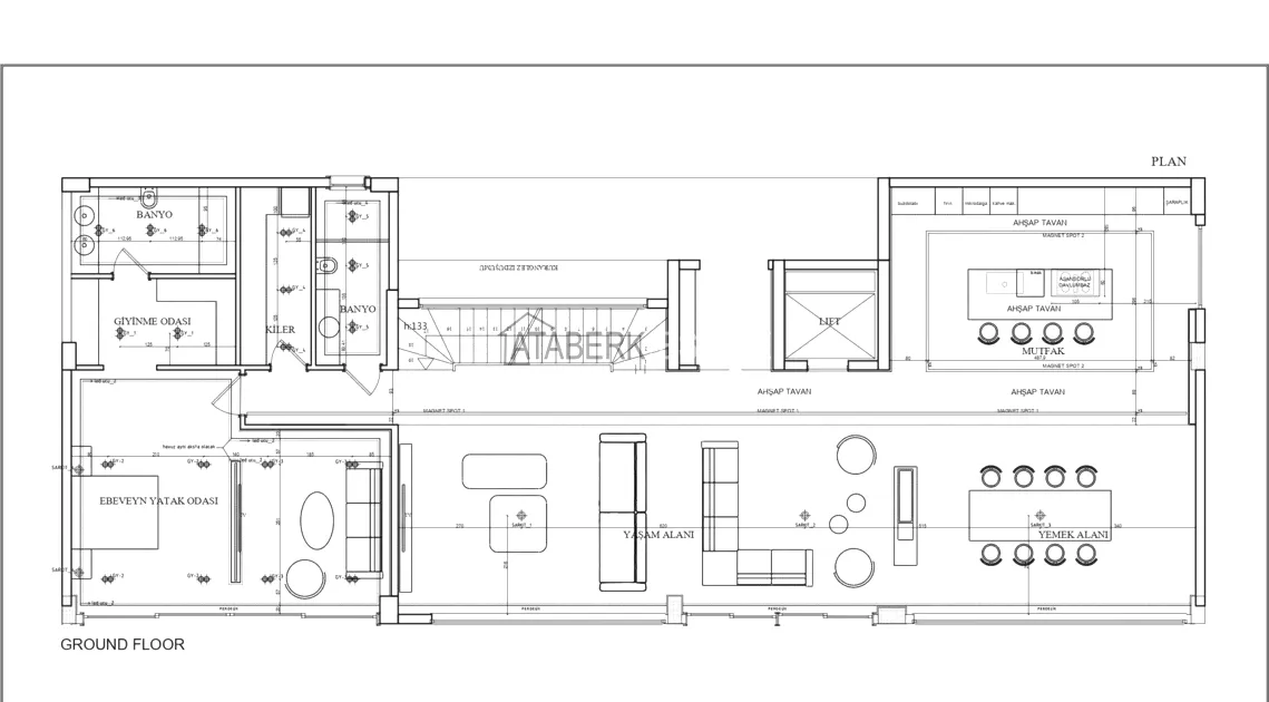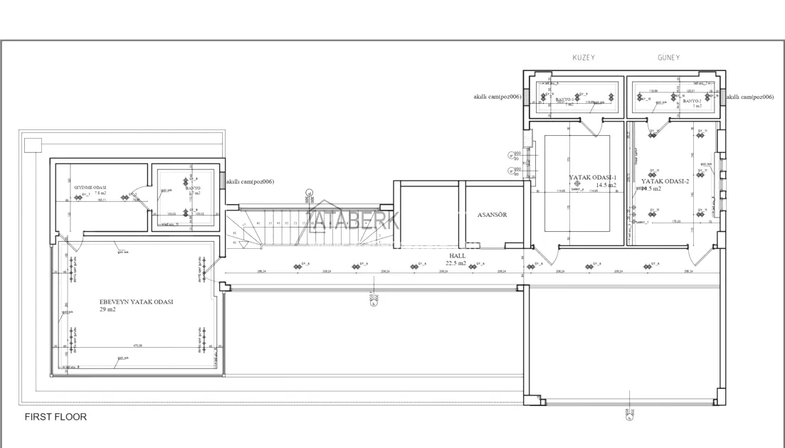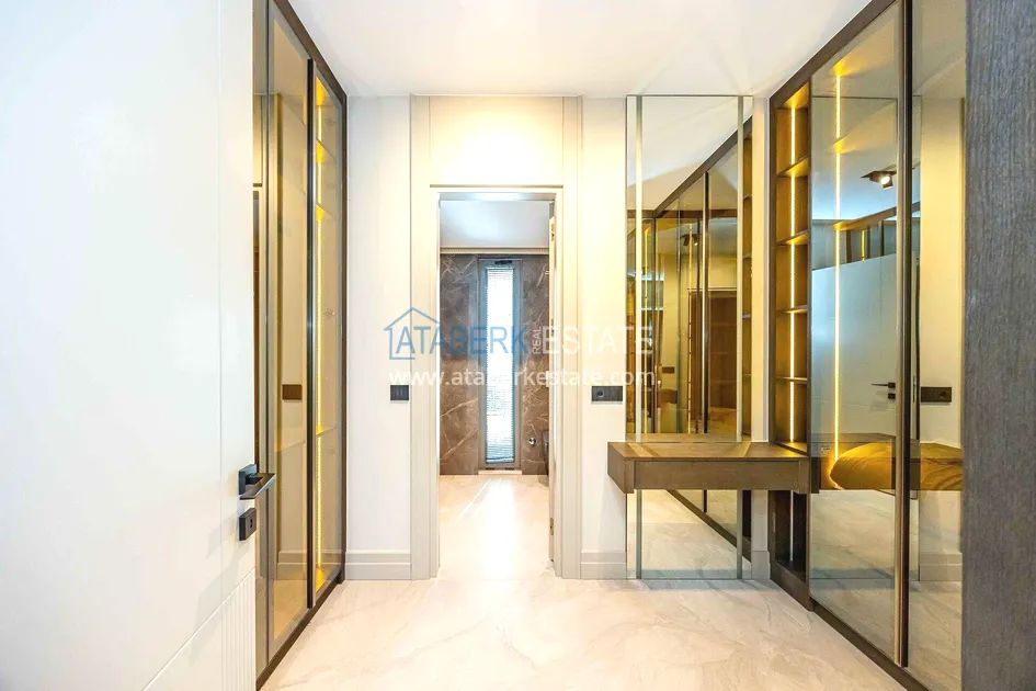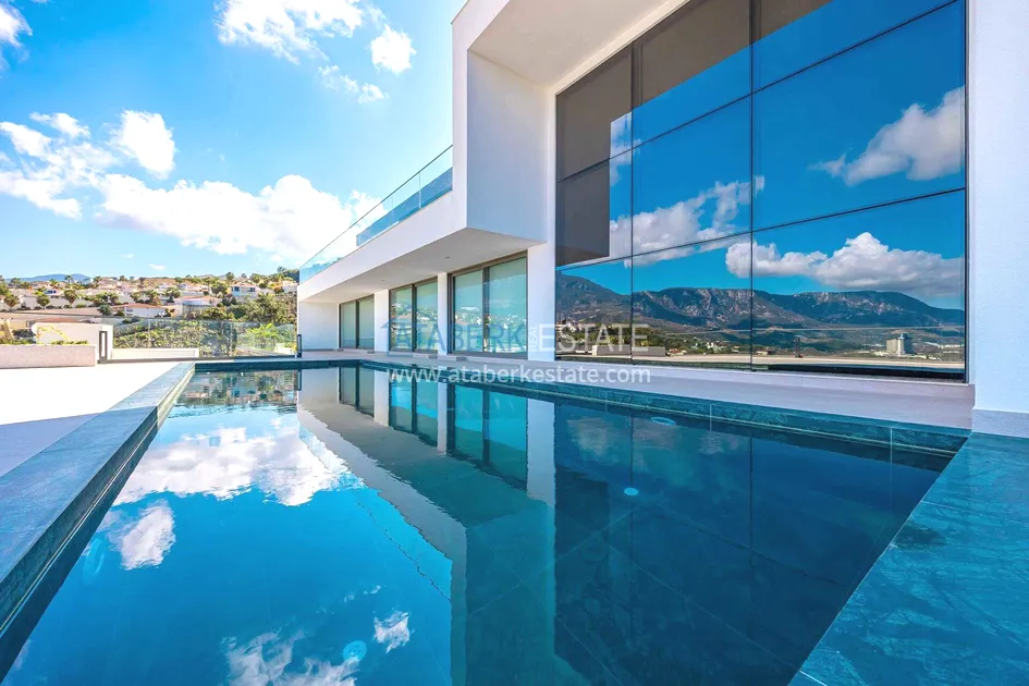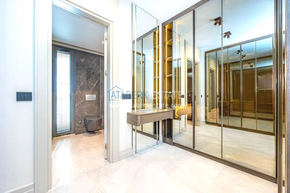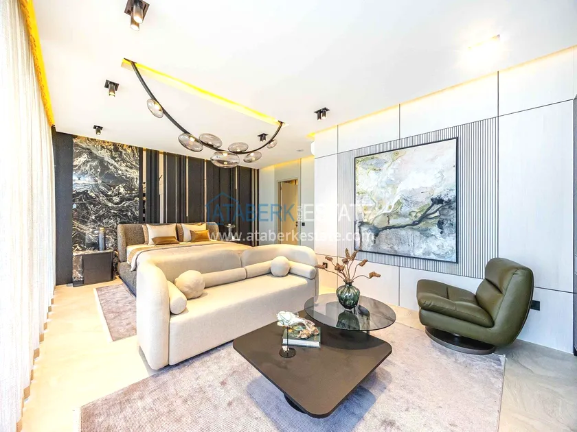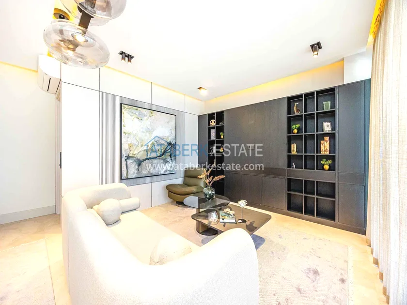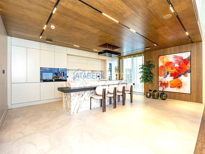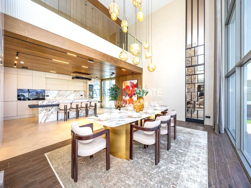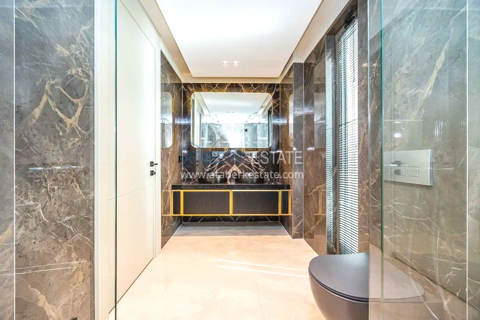 of workmanship. Thistwo-story 4+1 villa with a total area of 648 m² is located on a plot of 1,133 m². A full-fledged private relaxation area is organized in the basement level: a fitness room, a hammam, a sauna, a massage room, a cinema, a hobby room, a storage room, and a bathroom. The first floor includes a spacious living room with panoramic windows and a fireplace, a separate kitchen with a functional island area, a bedroom with a dressing room and a private bathroom, and on the floor there is an additional bathroom and a pantry. On the second level, there are three bedrooms, each with its own bathroom, and access to the terrace. The villa is equipped with an elevator, which provides additional comfort when moving between levels. All key areas offer views of the sea, mountains and natural surroundings
