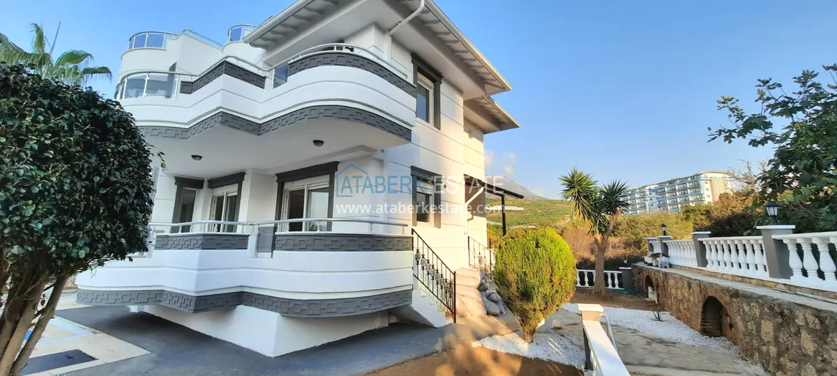 The villa is located in a mountainous area not far from the sea. The area is fenced, there is a swimming pool, garden and garage with an automatic gate opening system. The living area of the house is 507 sq. m, there are 2 residential floors, an open roof terrace and a basement with a utility room and a sauna. The layout 4 + 1 includes: a spacious living room with a fireplace, combined with a kitchen, 4 bedrooms, 3 toilets, 2 balconies. The price includes: kitchen furniture and complete bathrooms.