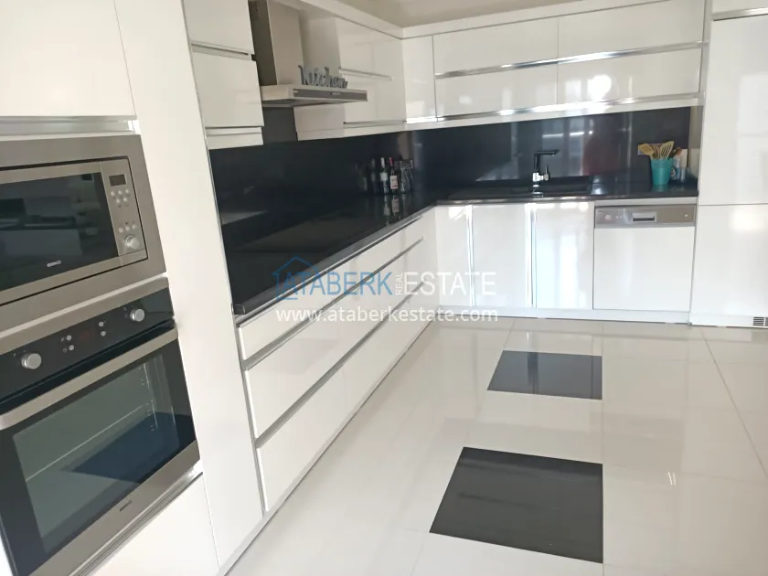 This apartment is located on the 3rd floor, 2+1 layout, which includes: a dressing room, a living room, an open-plan kitchen, two bedrooms, three bathrooms and three balconies overlooking the complex and partly the sea. The total area is 175 m2. The apartment also has a fireplace (gas). It is sold in the form in which it is shown in the photo.