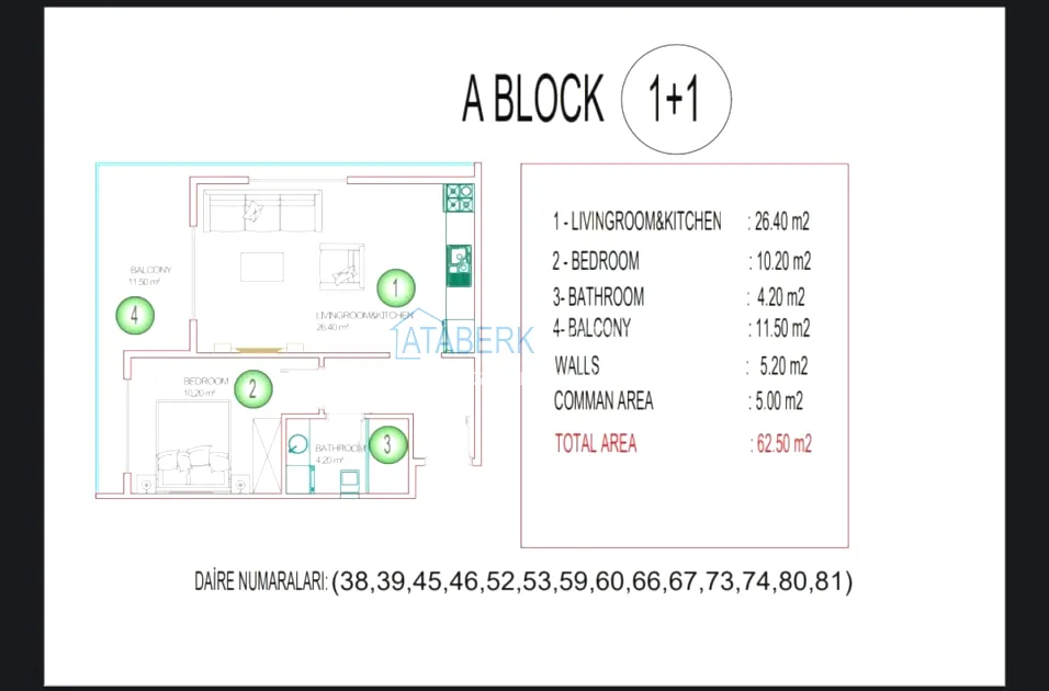 The proposed 1+1 property with an area of 62.5 m2, location 6th. This layout includes: a living room, an American-style kitchen, one bedroom, a combined bathroom and one balcony. The price includes a full fine finish, a built-in kitchen set and fully equipped bathrooms.
