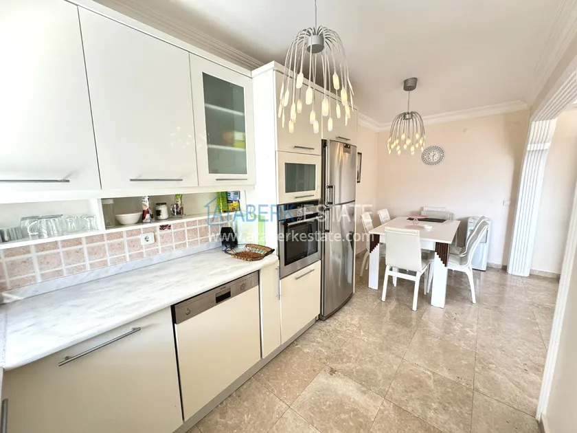 The 2+1 apartment is located on the 7th floor, is oriented south-east-west, with a total area of 135 m2. The layout includes: an entrance hall, a large living room combined with an open-plan kitchen, two bedrooms, three bathrooms, two balconies and a basement. It is sold in the form in which it is shown in the photo.