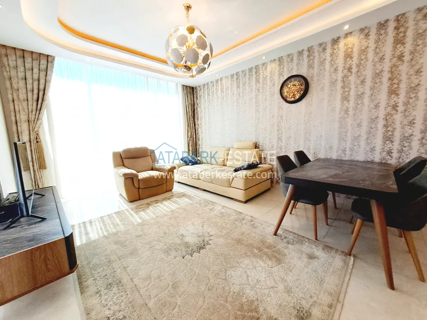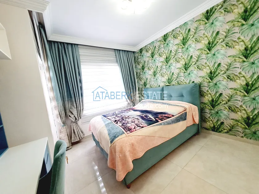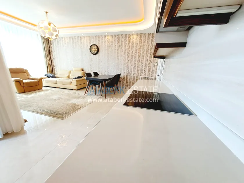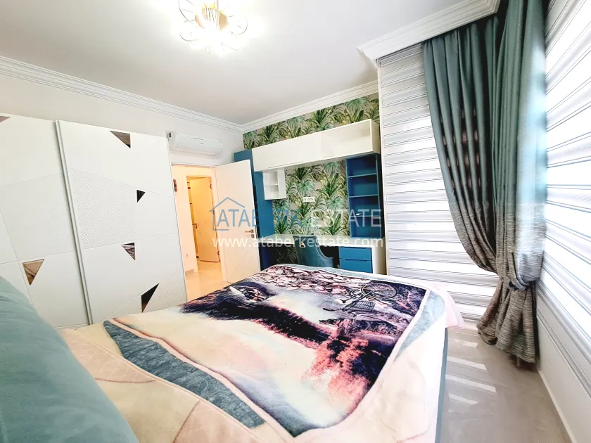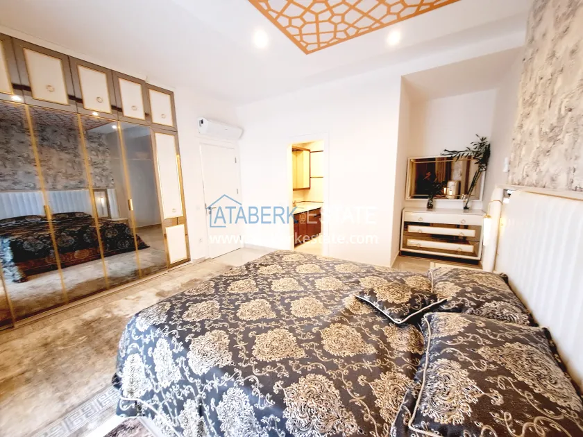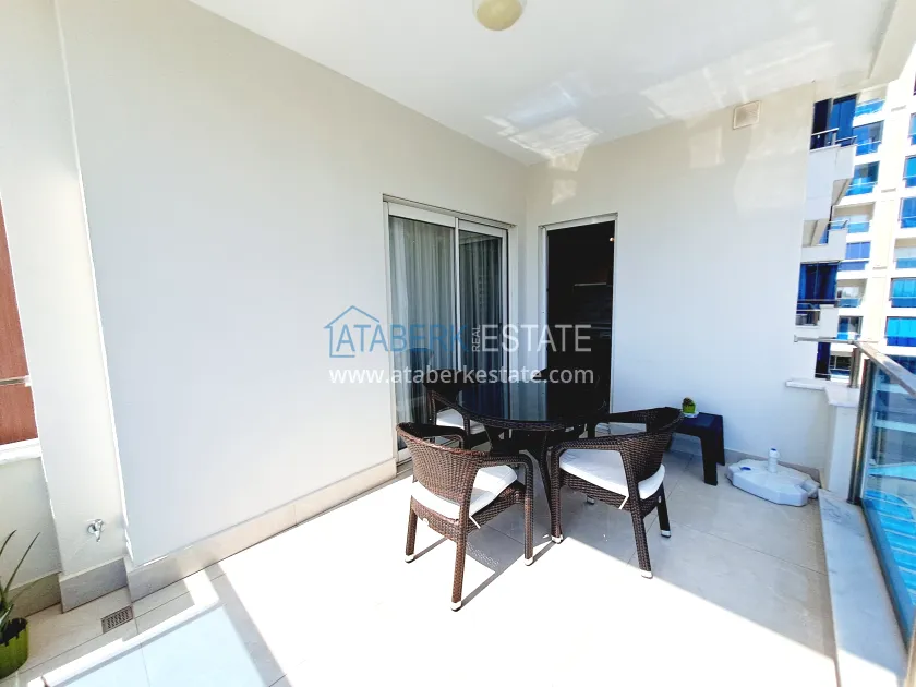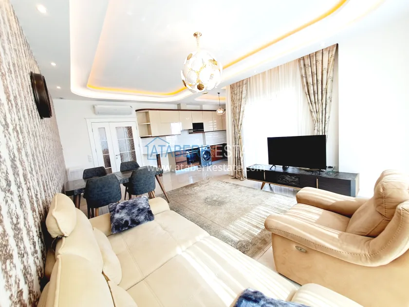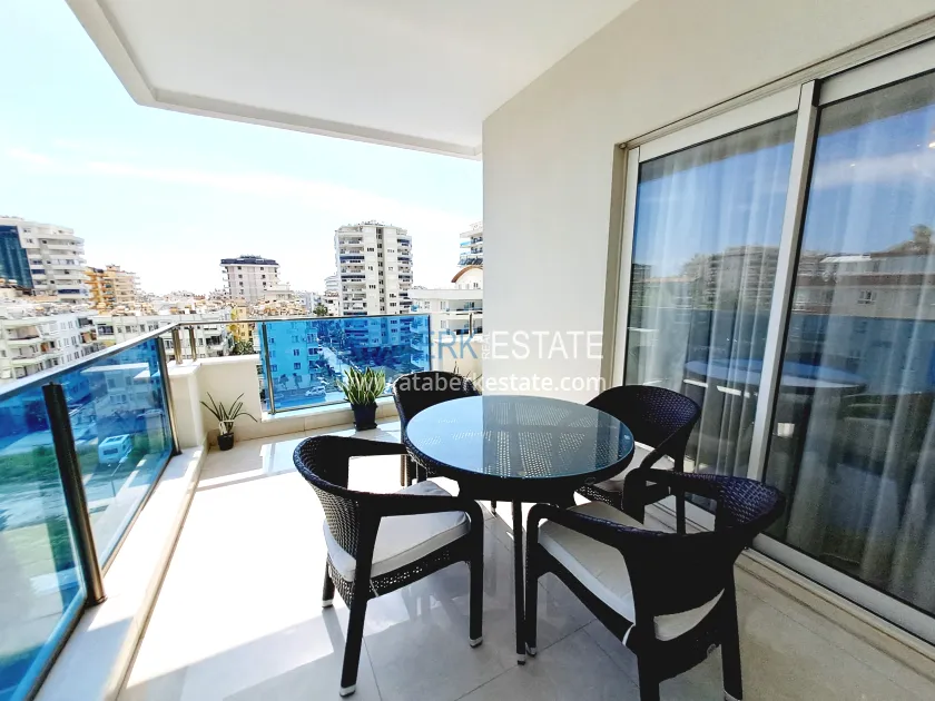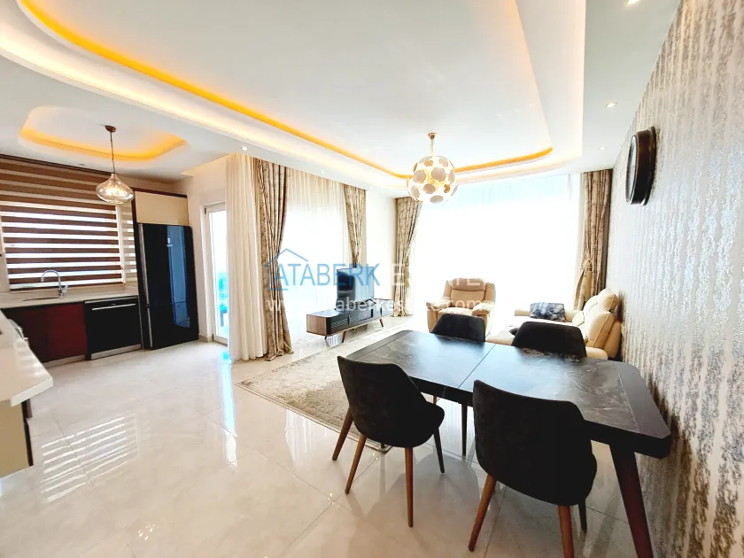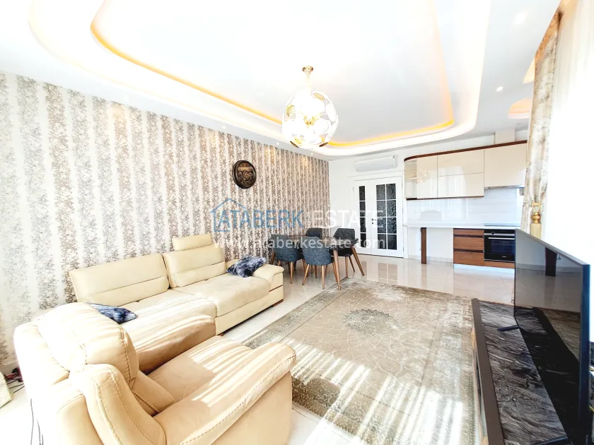 The 2+1 apartment with a total area of 125 m2 is located on the 5th floor. They include a spacious living room with an open-plan kitchen, two large bedrooms, one bathroom and two balconies overlooking the complex's infrastructure. Stylish interior design and thoughtful details create a sense of comfort and privacy - each room has air conditioning, and a warm floor system is installed throughout the apartment. Everything you see in the photo remains - the property is sold with furniture, appliances and a cozy atmosphere created with attention to every detail.