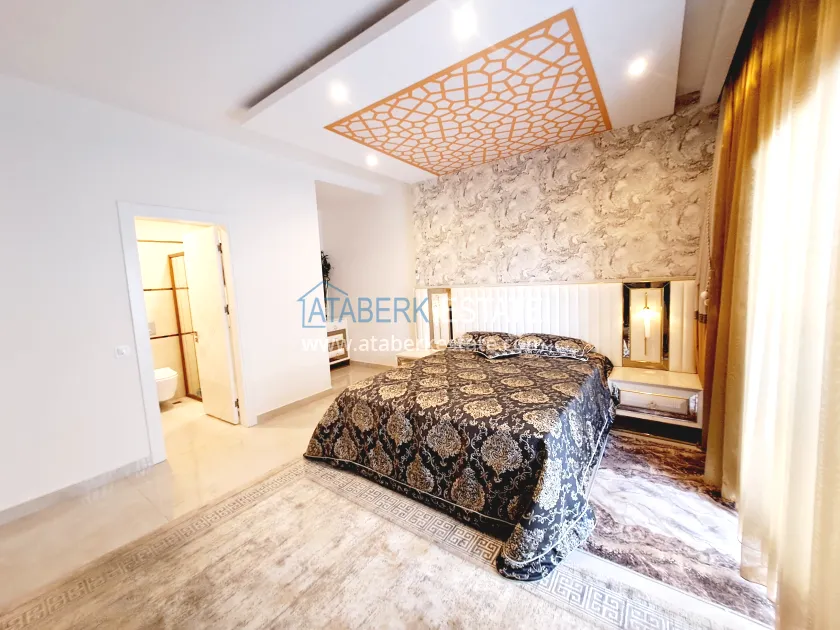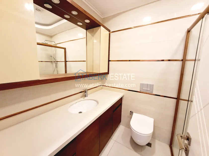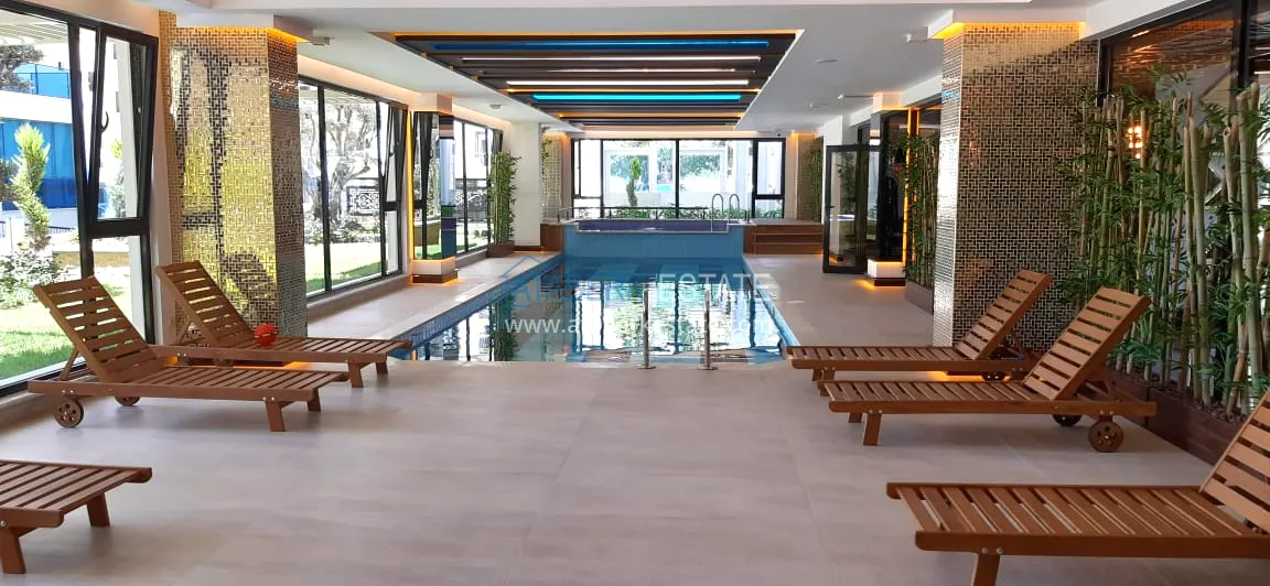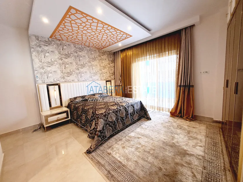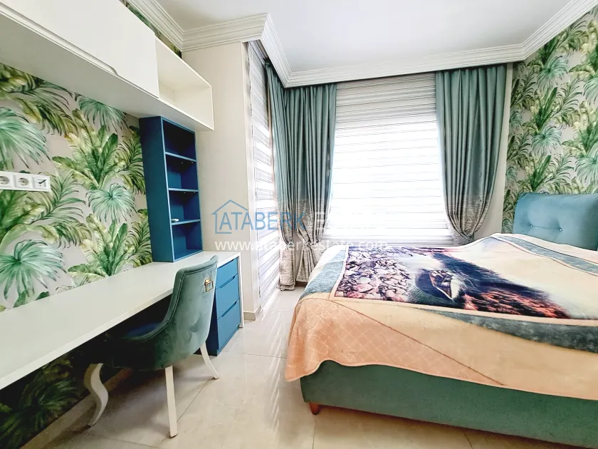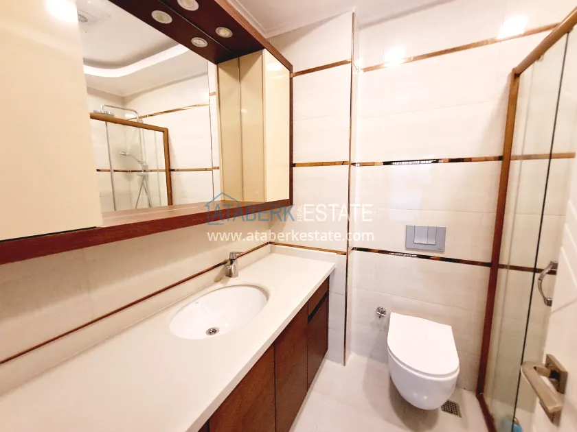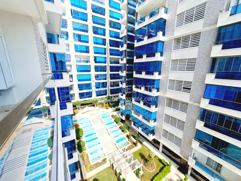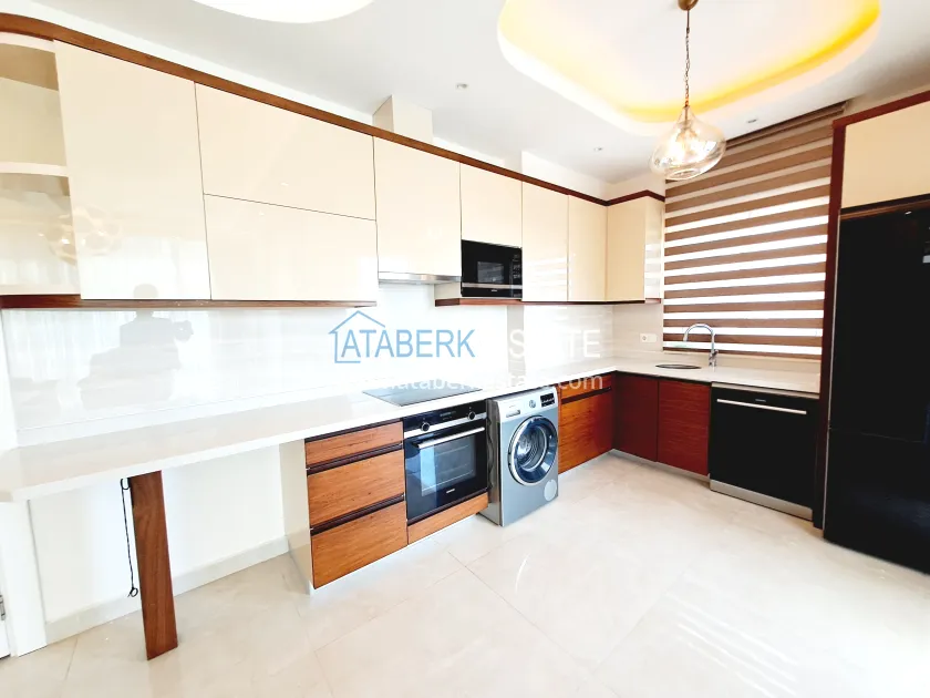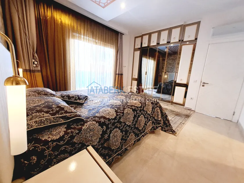 The 2+1 apartment with a total area of 125 m2 is located on the 5th floor. They include a spacious living room with an open-plan kitchen, two large bedrooms, one bathroom and two balconies overlooking the complex's infrastructure. Stylish interior design and thoughtful details create a sense of comfort and privacy - each room has air conditioning, and a warm floor system is installed throughout the apartment. Everything you see in the photo remains - the property is sold with furniture, appliances and a cozy atmosphere created with attention to every detail.