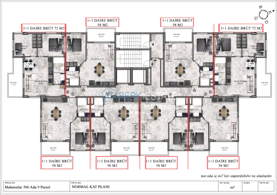 Currently on sale are: 1+1 apartments with an area of 58 m2, 2+1 with an area of 72 m2 and two-level penthouses 4+1 (224 m2) and 5+1 (260 m2). All facilities are offered with full high-quality finishing — stylish kitchens, modern bathrooms, well-designed lighting and preparation for appliances. Space, light and comfort in every type of layout.