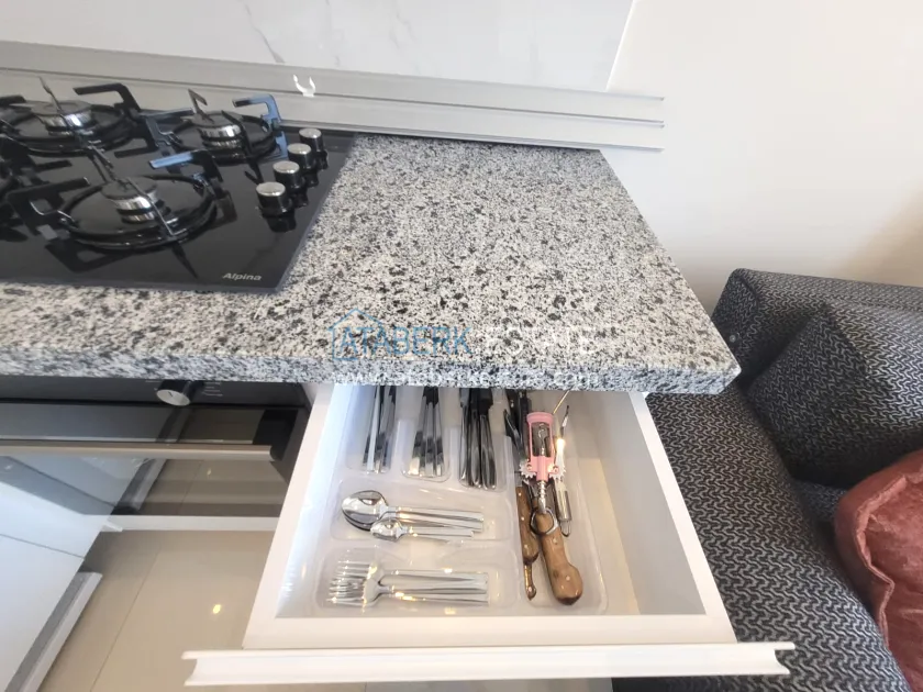 The 50 m² 1+1 apartment is located on the first floor. The layout includes a living room combined with an American-style kitchen, one bedroom, a bathroom and a balcony. The apartment is offered with furniture and household items, which allows you to immediately start using the purchase without additional investments.