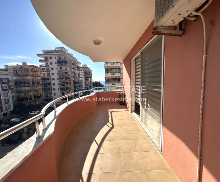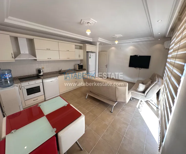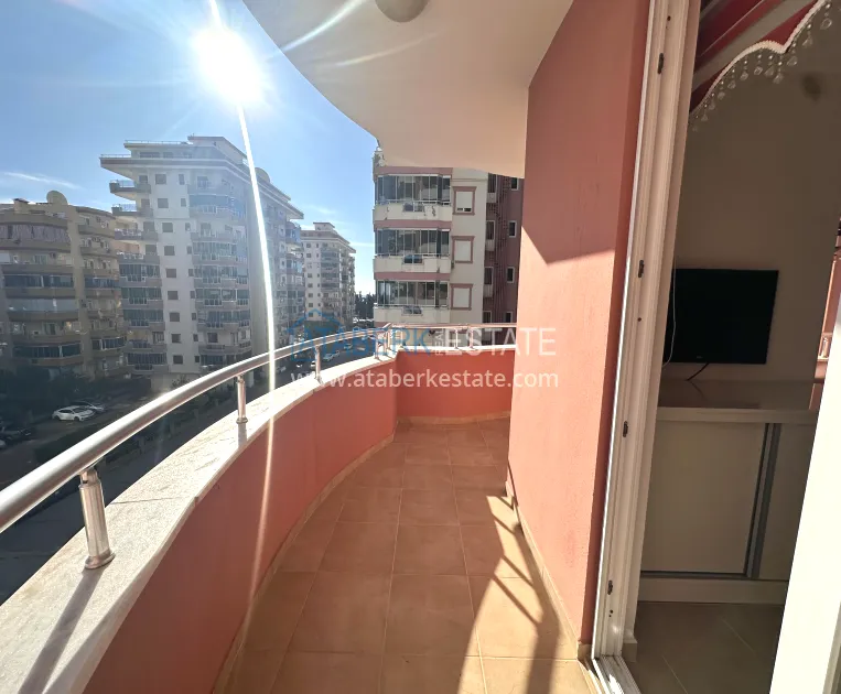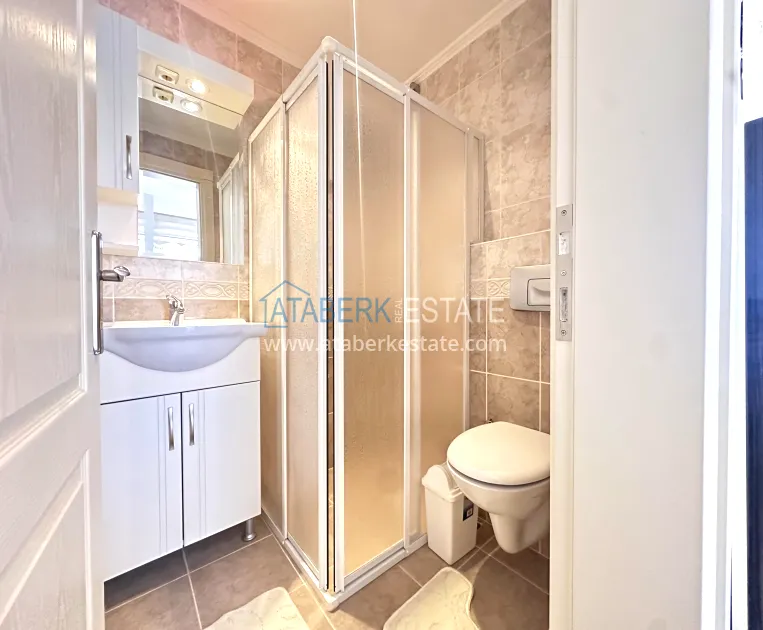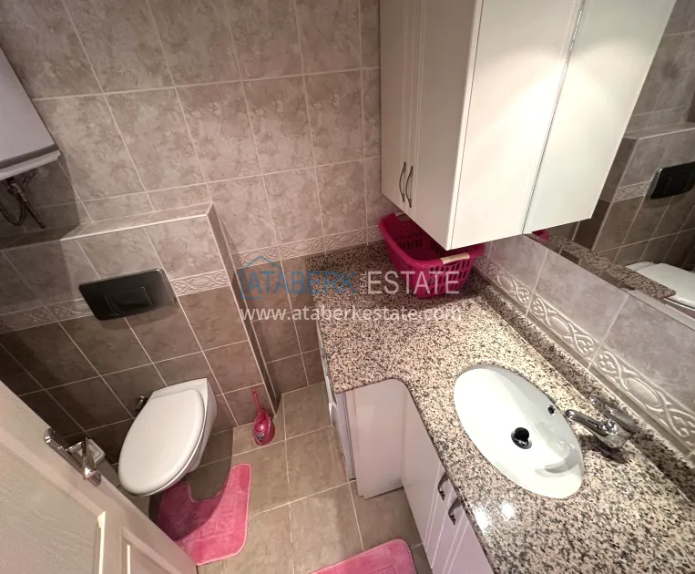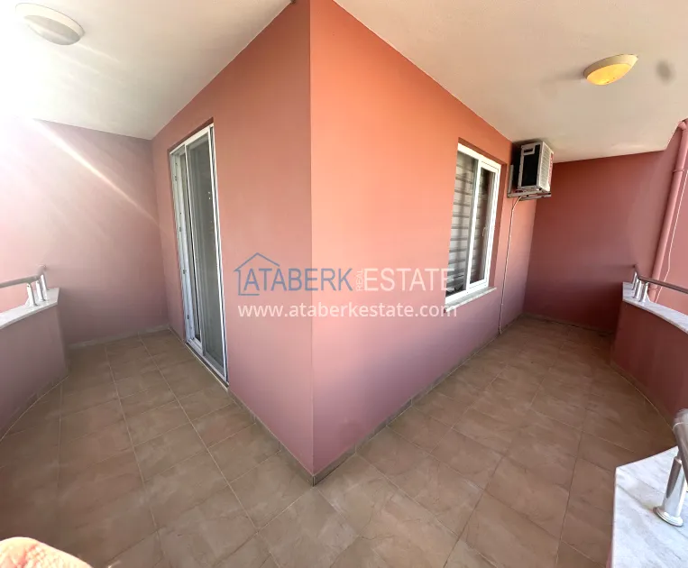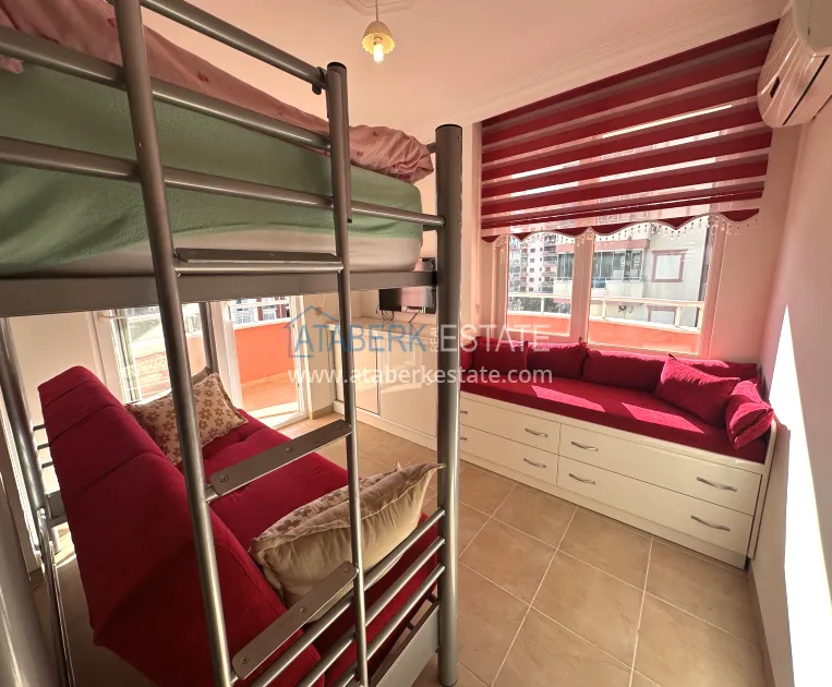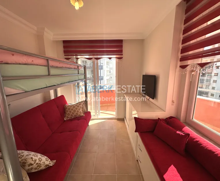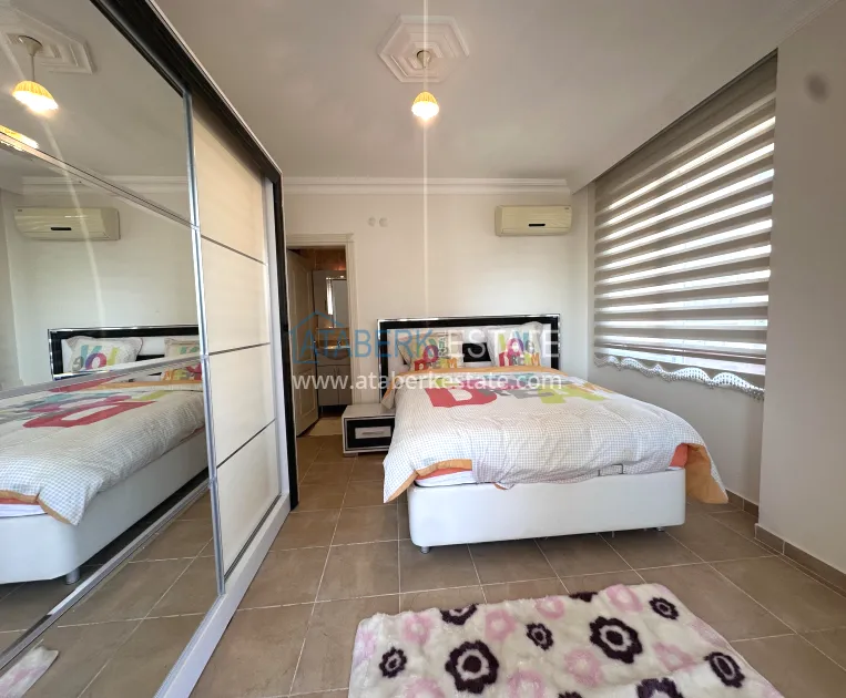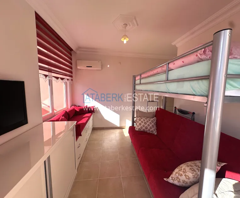 A 2+1 apartment with a total area of 120 m² is located on the 4th floor and is offered for sale furnished. The layout includes a living room with an open-plan kitchen, two bedrooms, two bathrooms and three balconies, which makes the space particularly bright and well ventilated. The direct east, south and north orientation provides natural light throughout the day. The balconies offer a side view of the sea, which emphasizes the resort character of the property and adds value to it.