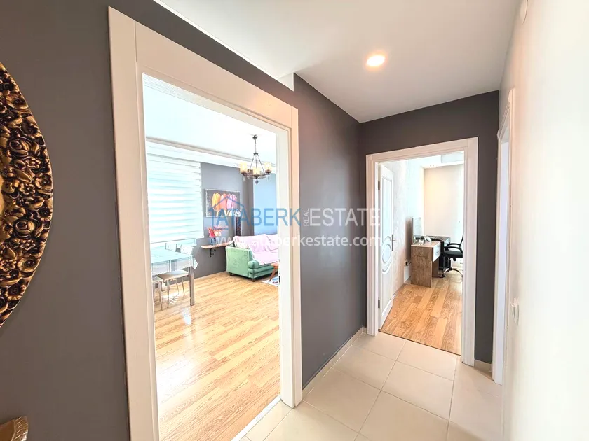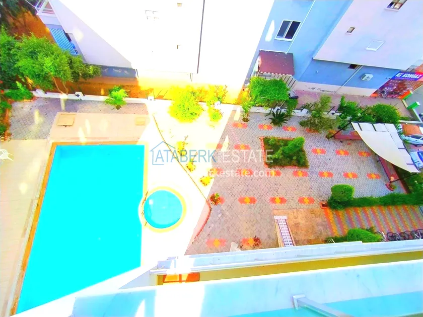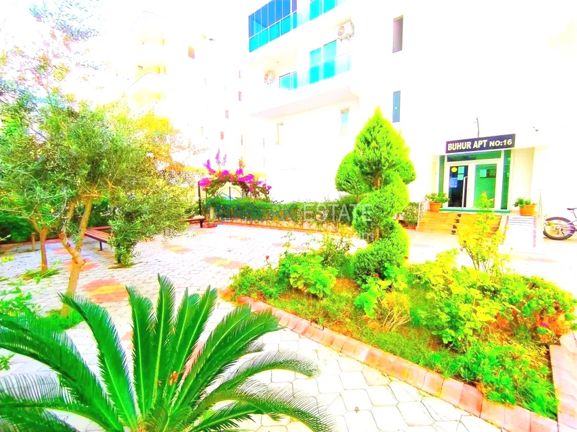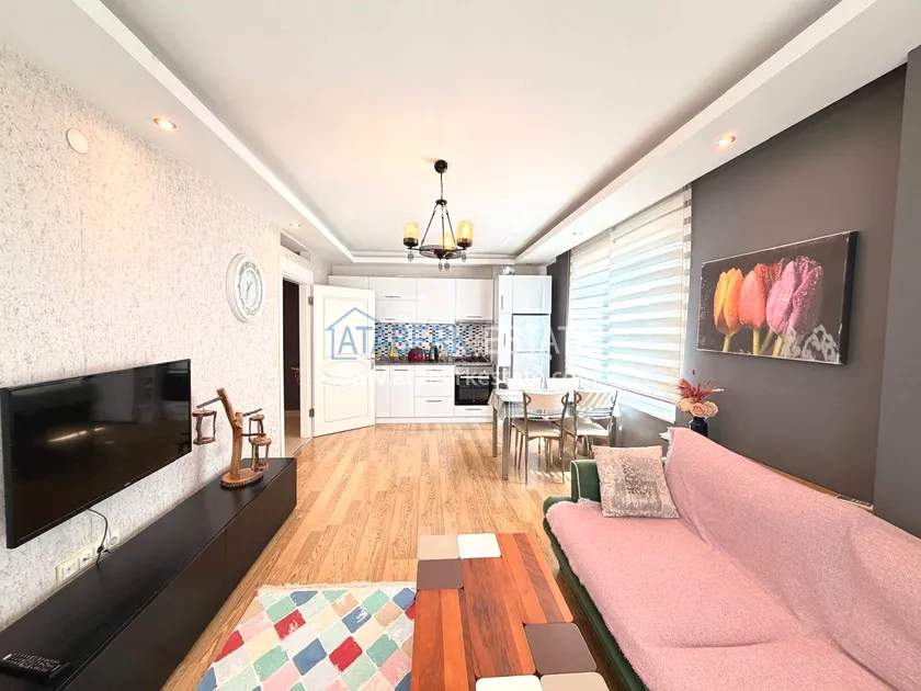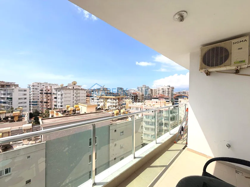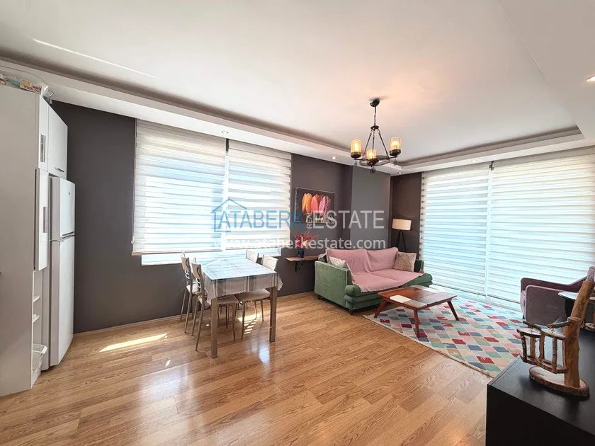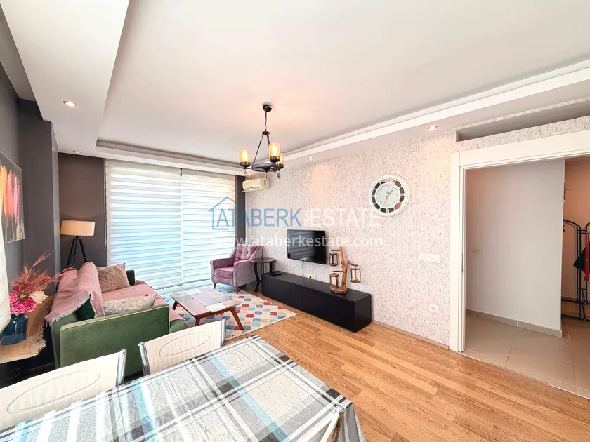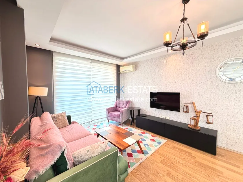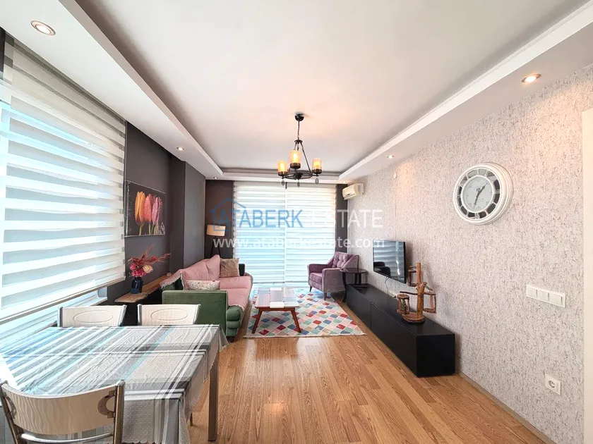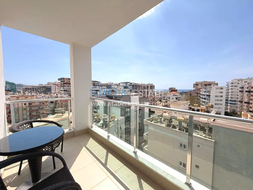. The1+1 apartment with a total area of 60 m² is located on the 7th floor and includes a living room with an American-style kitchen, one bedroom, a bathroom and a balcony with partial sea views. The property is sold furnished. The floor height ensures more open views and good air circulation.