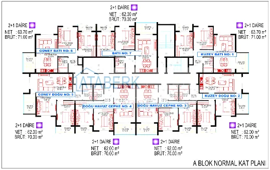 There are apartments of various layouts: three-room 2 + 1 with an area of 70 sq. m and penthouses 2 + 1 and 3 + 1 with an area of 143 sq. m. The price of the apartments includes a fully finished finish, built-in furniture in the kitchen and bathrooms, high-quality plumbing.