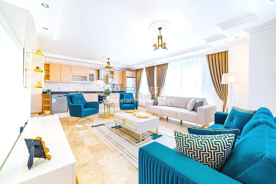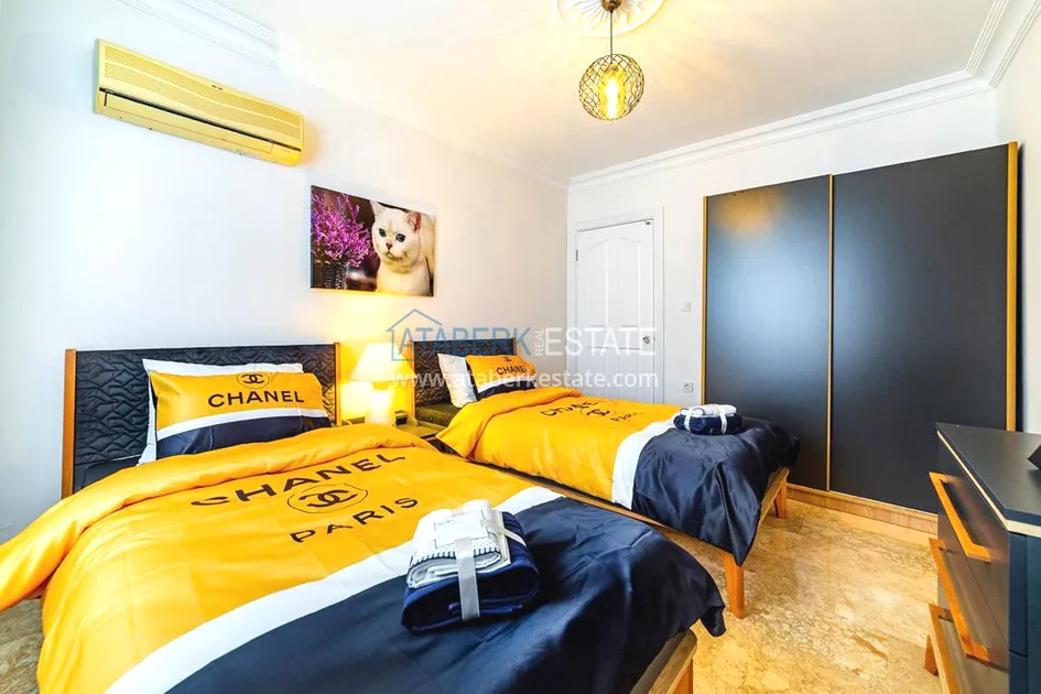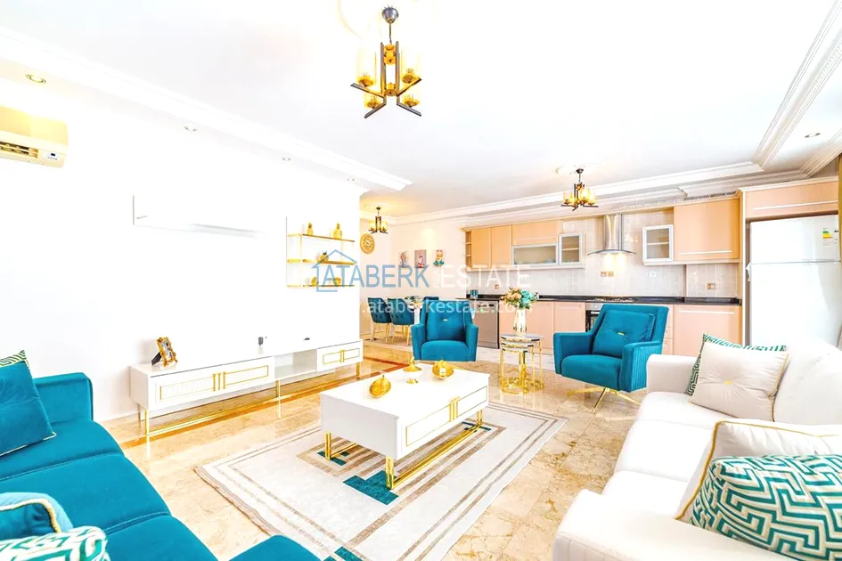 There is a two bedroom apartment for sale located on the 6th floor with windows facing South-West. The apartment is a warm, bright layout of 2+1, total area 120 sq. m, sold with all furniture and household appliances, as in the photo. The layout includes: a salon combined with an open-plan kitchen, two bedrooms, two bathrooms and two balconies with a very beautiful view of the sea and the city surroundings.