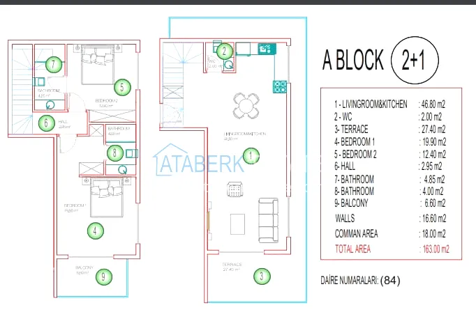 The proposed 2+1 apartment with an area of 163 m2, floor 11, oriented to the south-east. This layout includes: a living room, an American-style kitchen, 2 bedrooms, 3 bathrooms, 3 balconies, including an open terrace. The price includes a full fine finish, a built-in kitchen set and fully equipped bathrooms.
