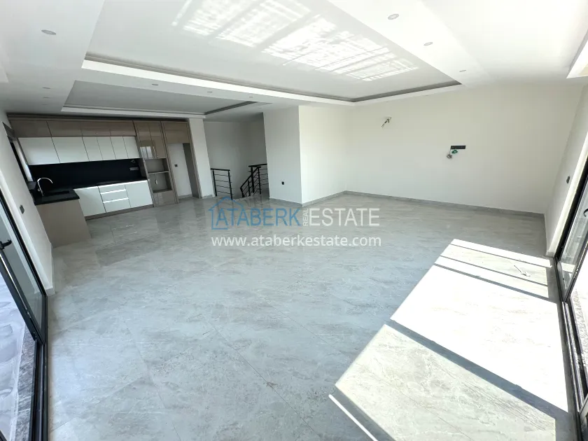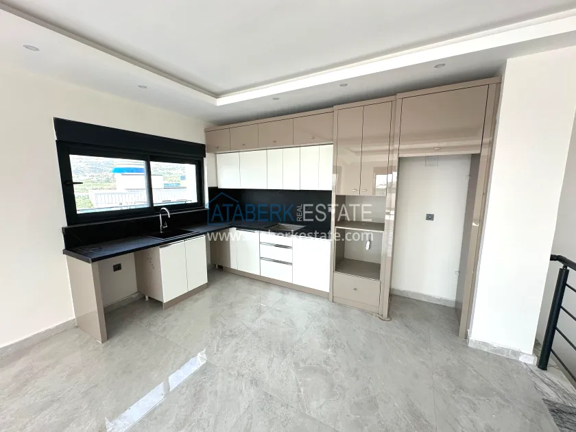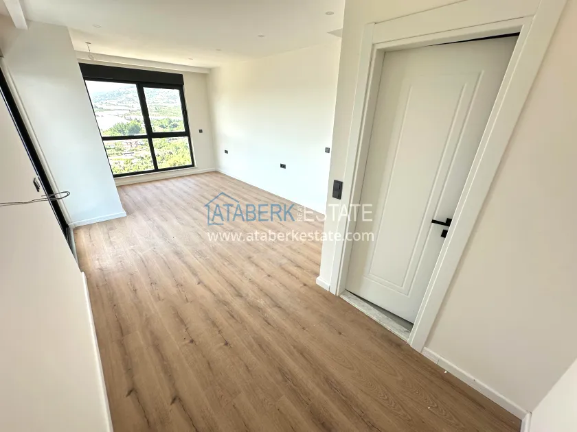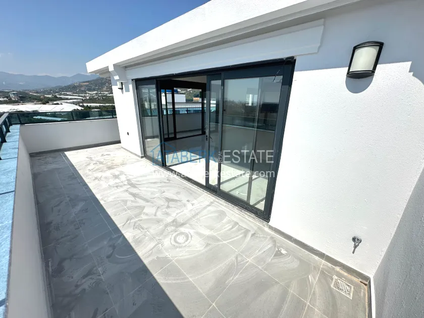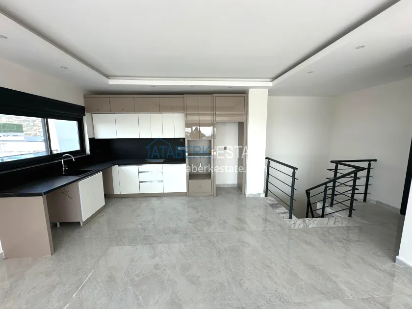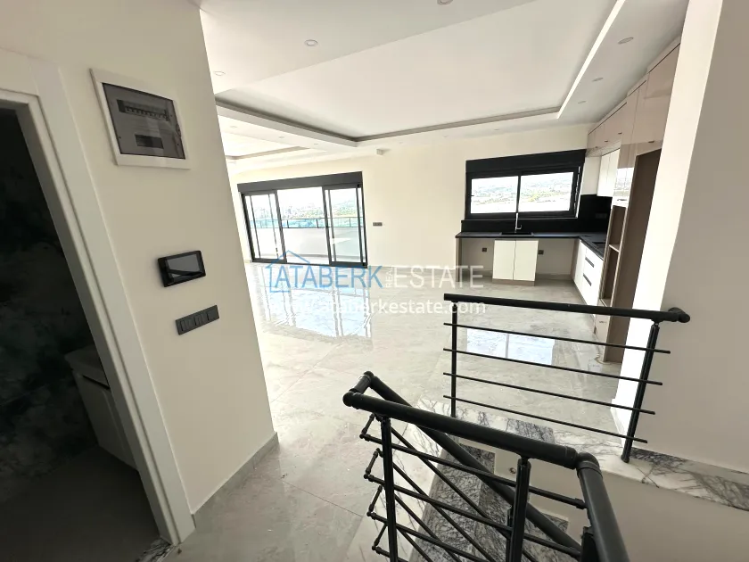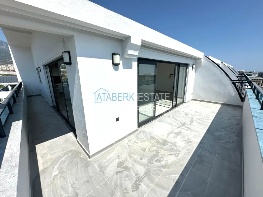 The proposed 3+1 apartment with an area of 175 m² occupies two upper floors and is south-west oriented. The layout includes a spacious living room with an American-style kitchen, three bedrooms, three bathrooms, two balconies and a terrace. Panoramic windows fill the space with light and offer mountain and sea views. The property is offered with a fine finish, a kitchen and fully equipped bathrooms.
