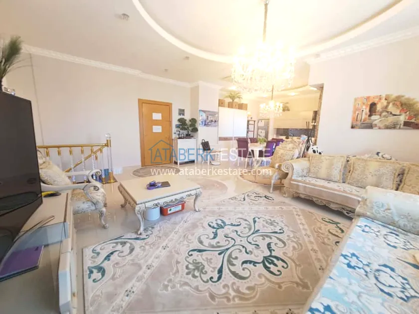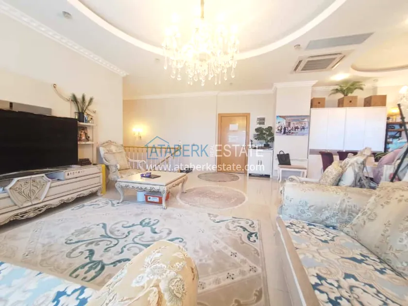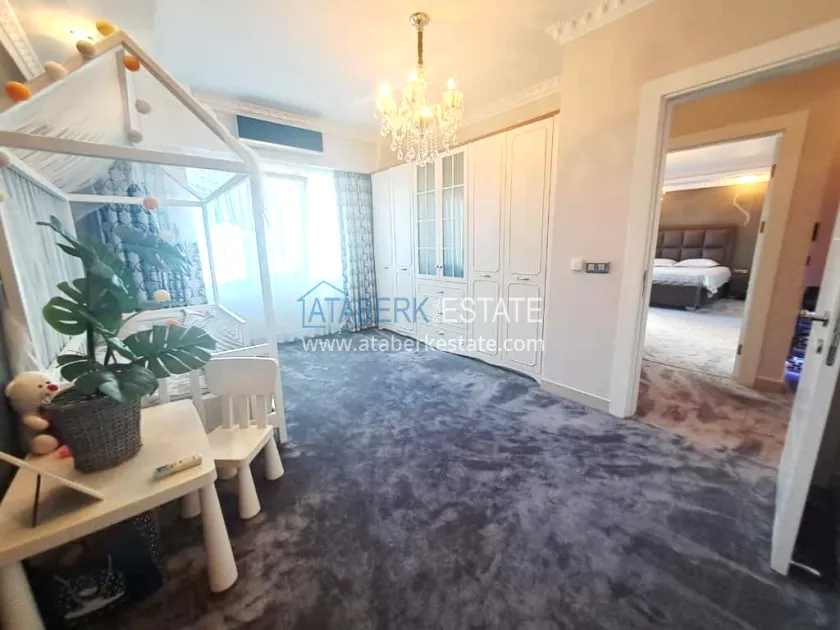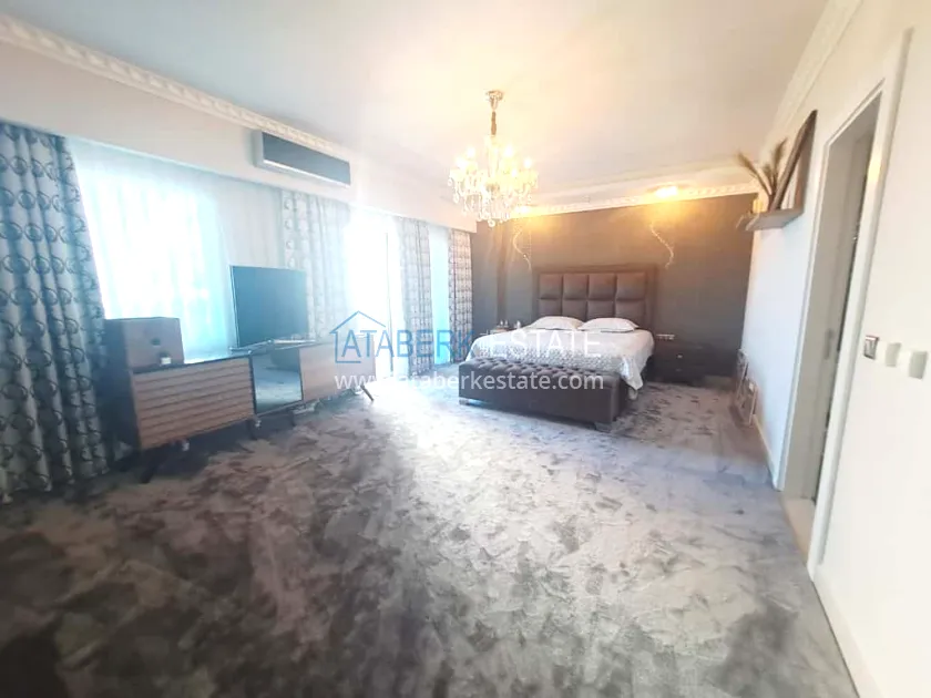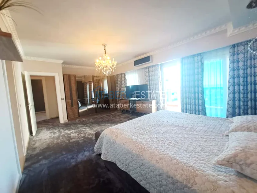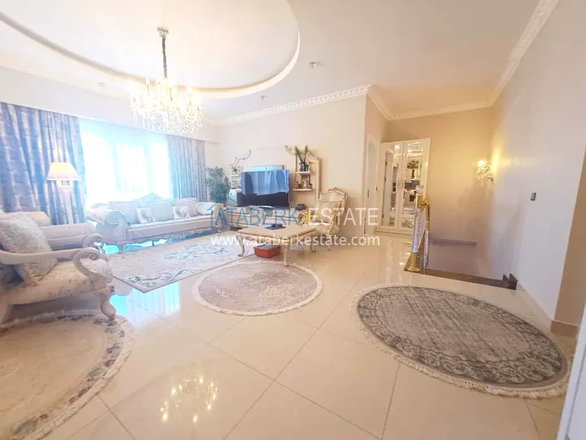 This 250 m² duplex apartment is located on the 12th floor and is fully furnished in a luxury style. On the upper level, there is a living room with an open-plan kitchen, a bathroom and a 36 m² glazed terrace — an ideal place to relax and dine with views of the city and the sea. On the lower level there are two bedrooms, two bathrooms and another spacious balcony. The interior is designed with individual taste: high-quality materials, decorative stucco, crystal chandeliers and soft colors create an atmosphere of refined comfort.