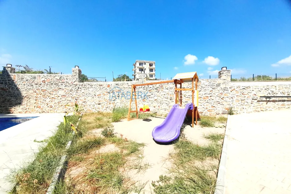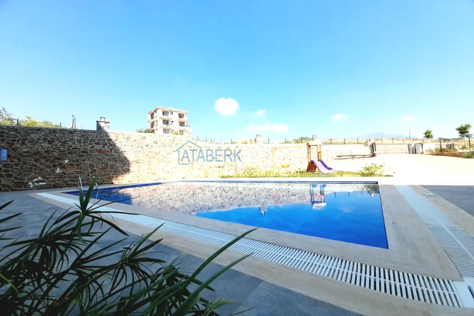 For sale are a 1+1 apartment with an area of 50 m2 — a salon, an American-style kitchen, a bedroom, a combined bathroom and a balcony. First floor, northwest side, mountain view. Technical characteristics: high-quality finishing, steel front door, built-in kitchen furniture, interior doors, ceramic flooring, equipped bathrooms.