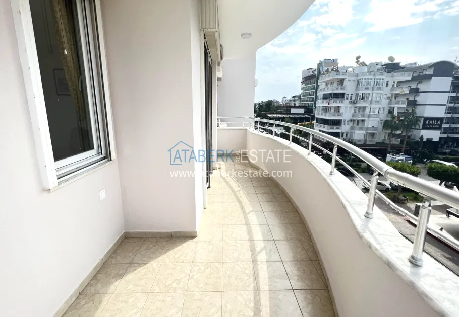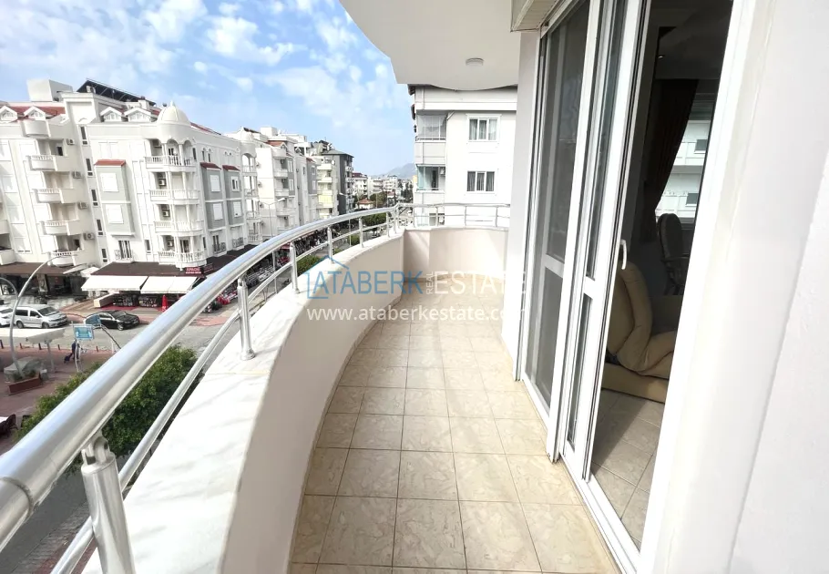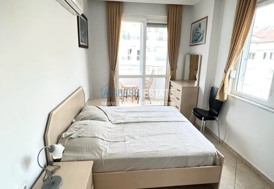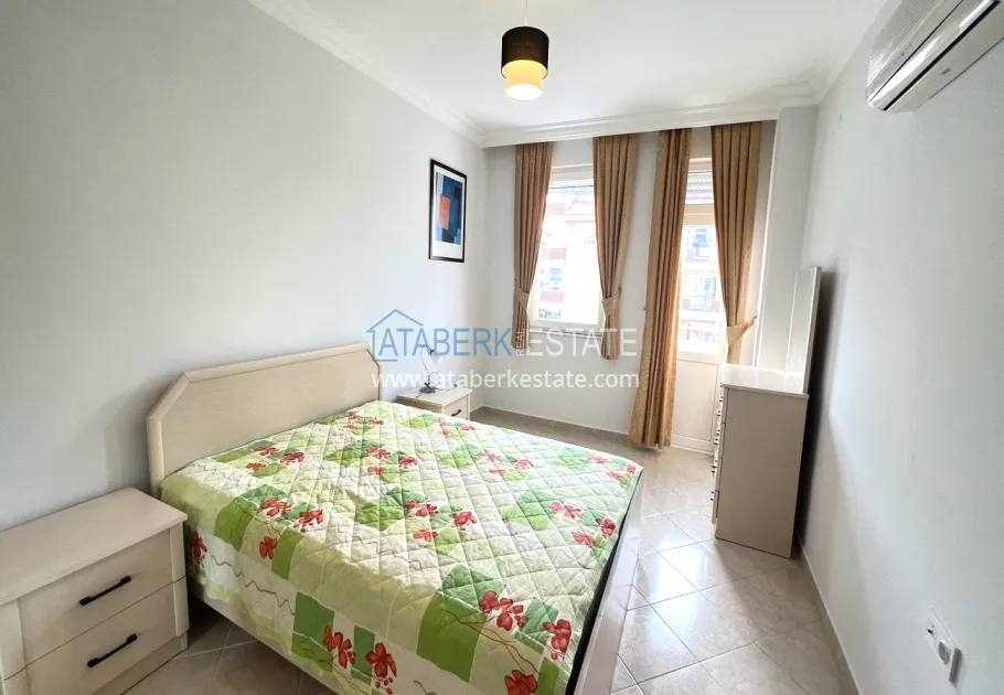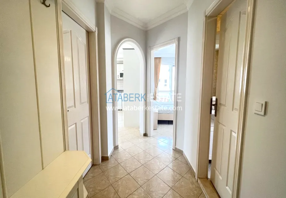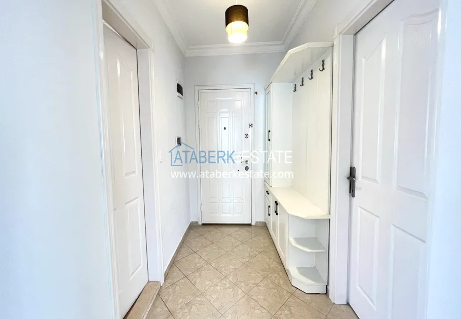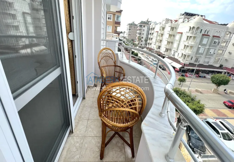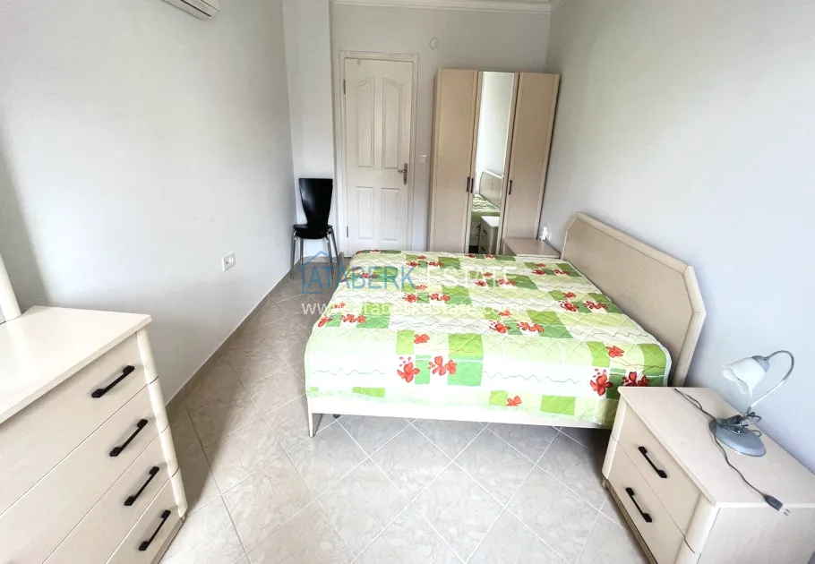 The 105 m² 2+1 apartment is located on the 3rd floor of a five-story building. The layout includes a spacious living room with an open kitchen, two bedrooms, a bathroom and two balconies. One of them offers mountain views, and the other partially overlooks the sea. The apartment is south-east-facing, fully furnished and ready to move in.