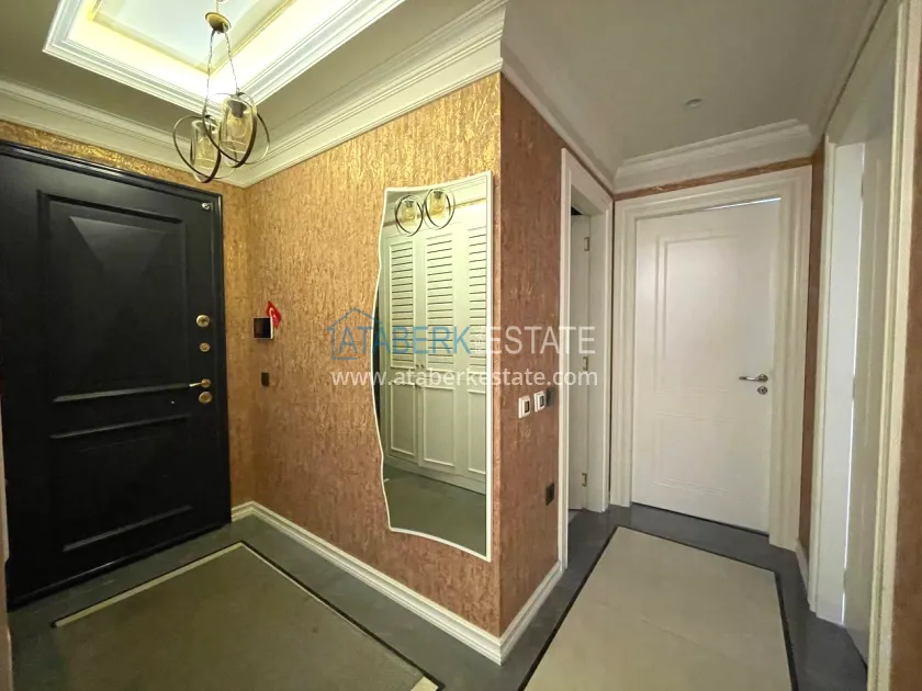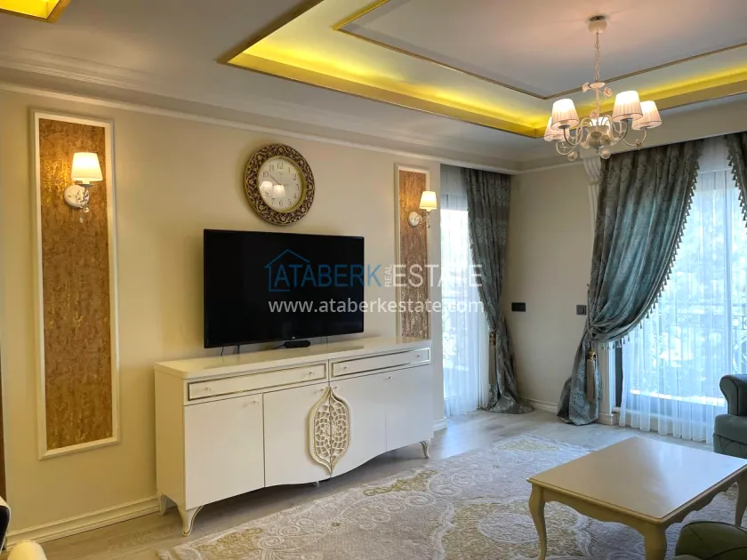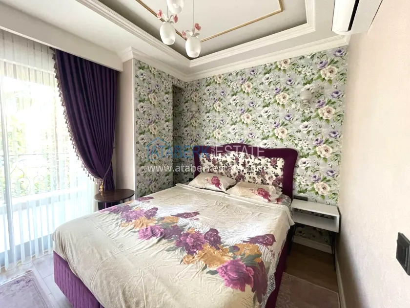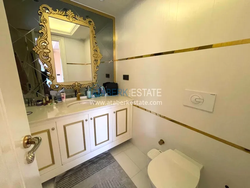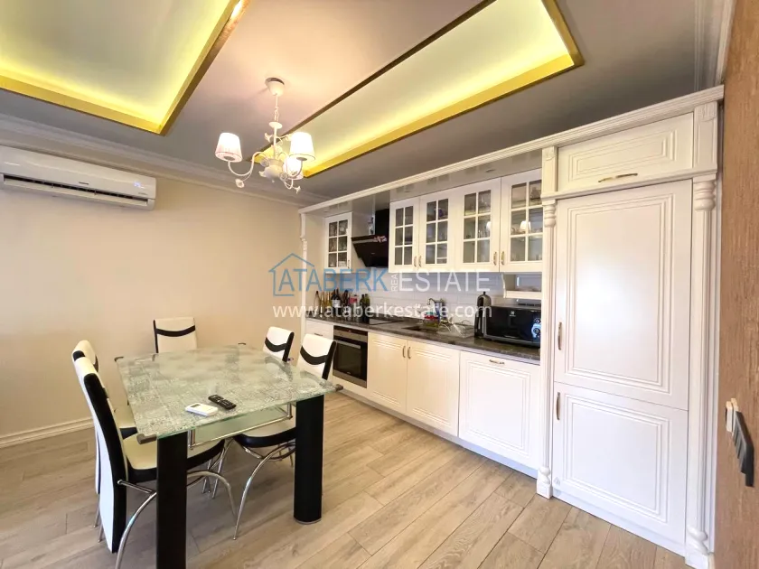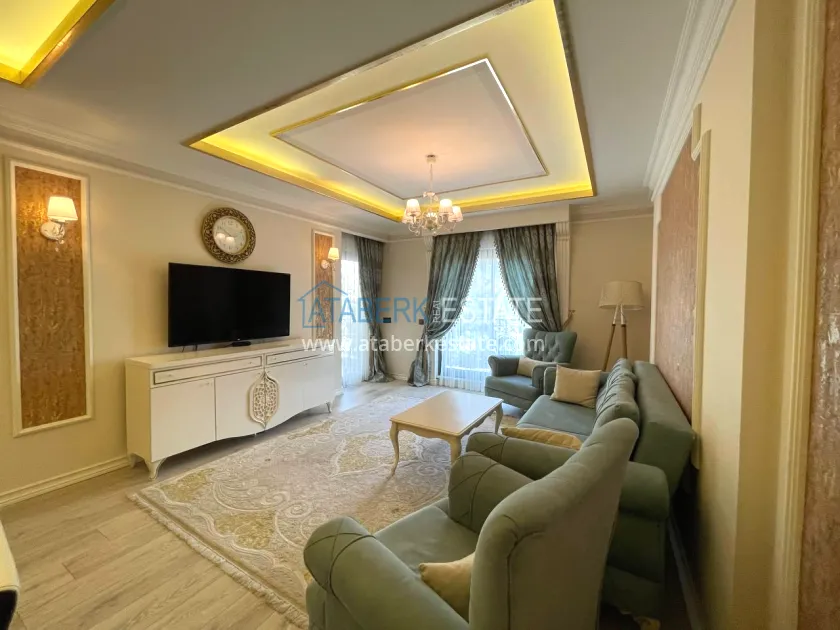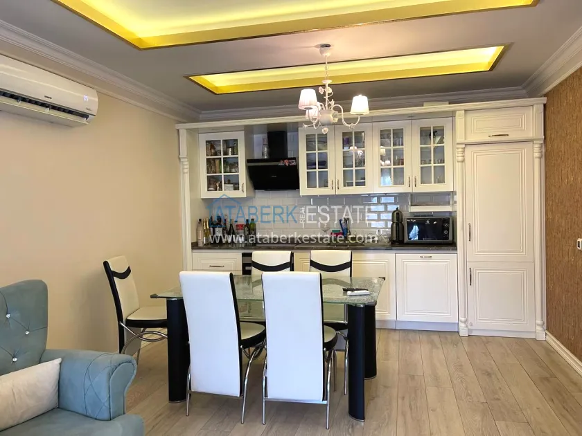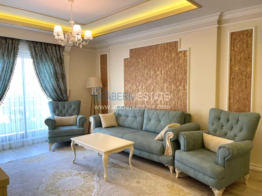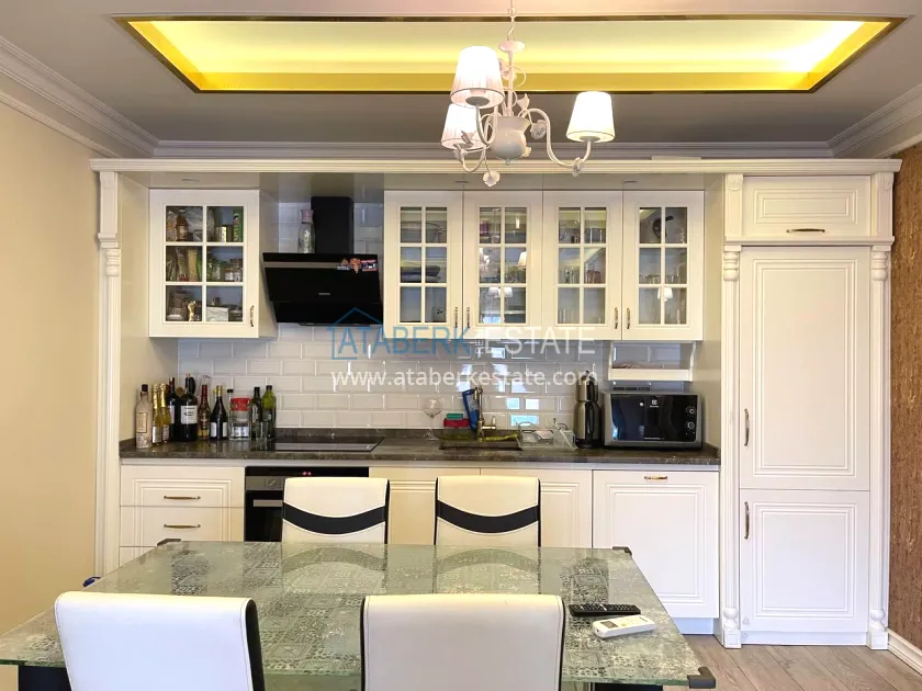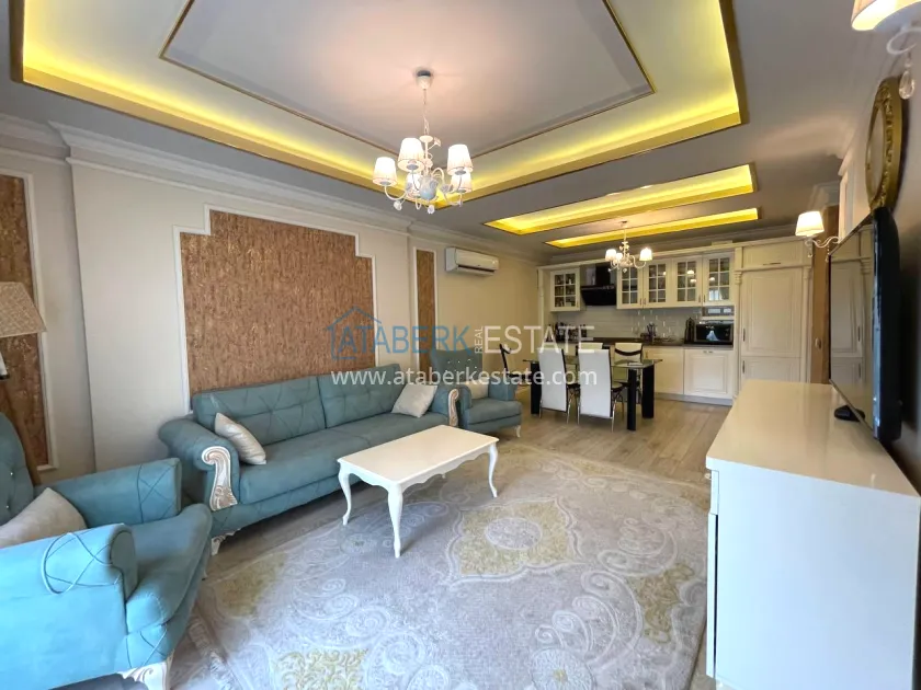 The 110 m² 2+1 apartment is located on the 2nd floor. The layout includes a living room with an open-plan kitchen, two bedrooms, two bathrooms (one in the bedroom, the other is shared), and two balconies — standard and French. The property is offered furnished, with an aesthetic interior, high-quality laminate flooring and ready to move in.