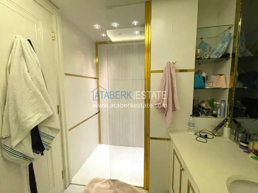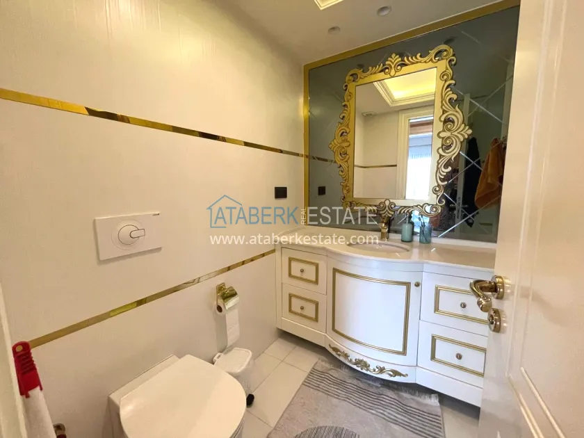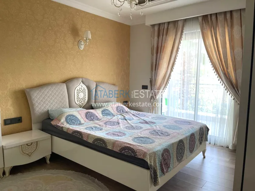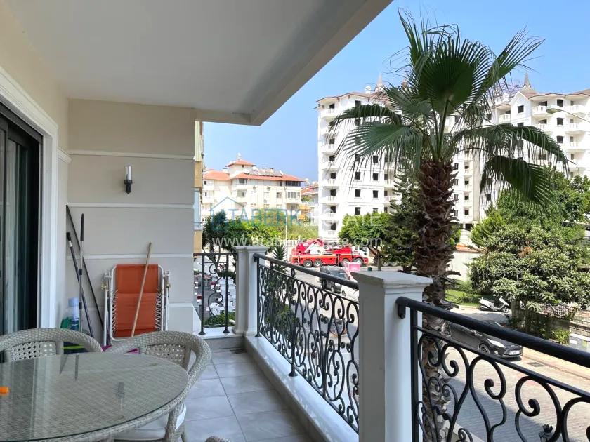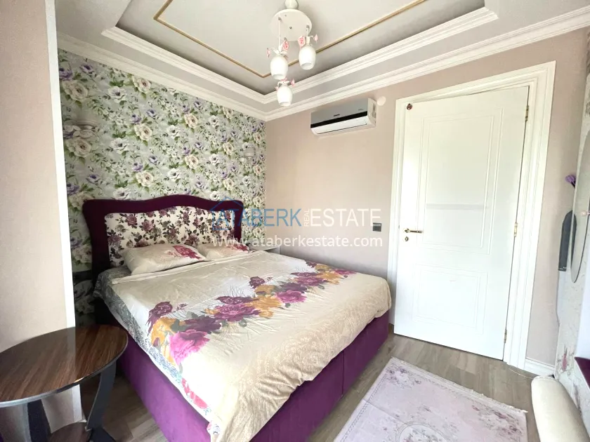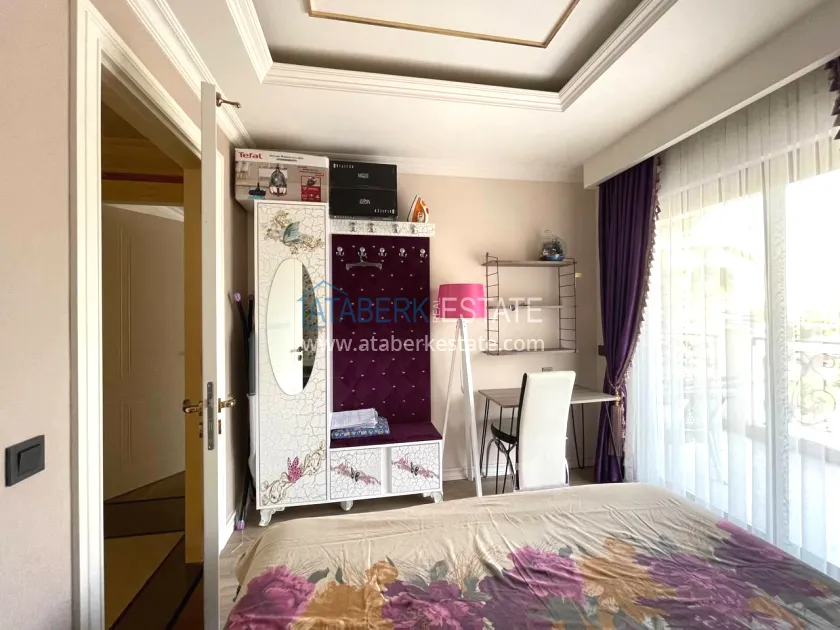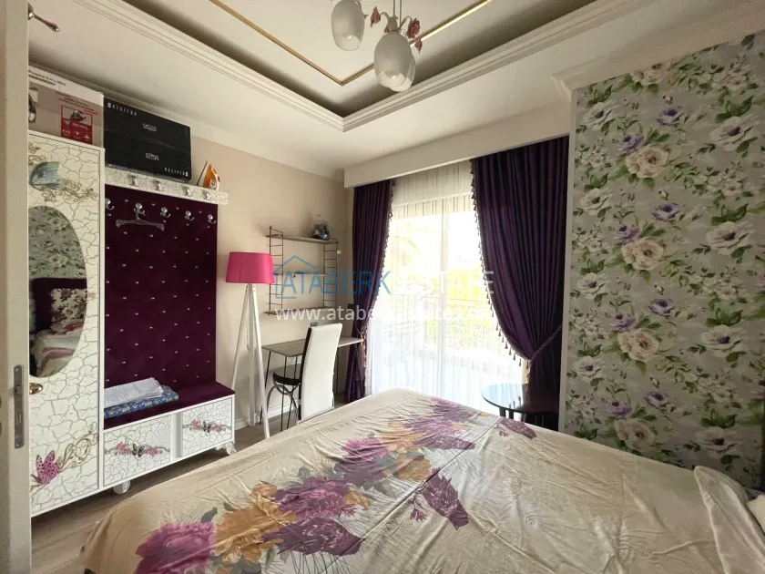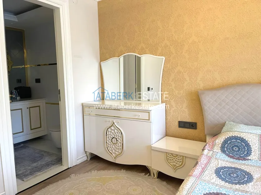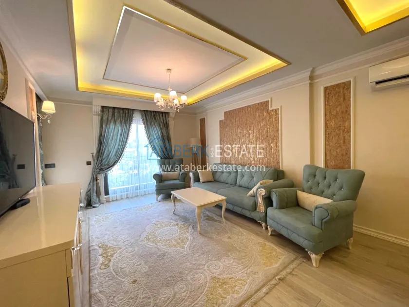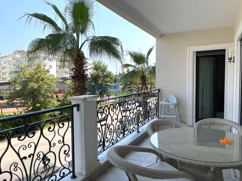 The 110 m² 2+1 apartment is located on the 2nd floor. The layout includes a living room with an open-plan kitchen, two bedrooms, two bathrooms (one in the bedroom, the other is shared), and two balconies — standard and French. The property is offered furnished, with an aesthetic interior, high-quality laminate flooring and ready to move in.